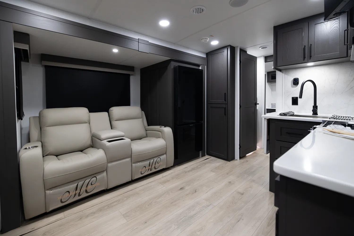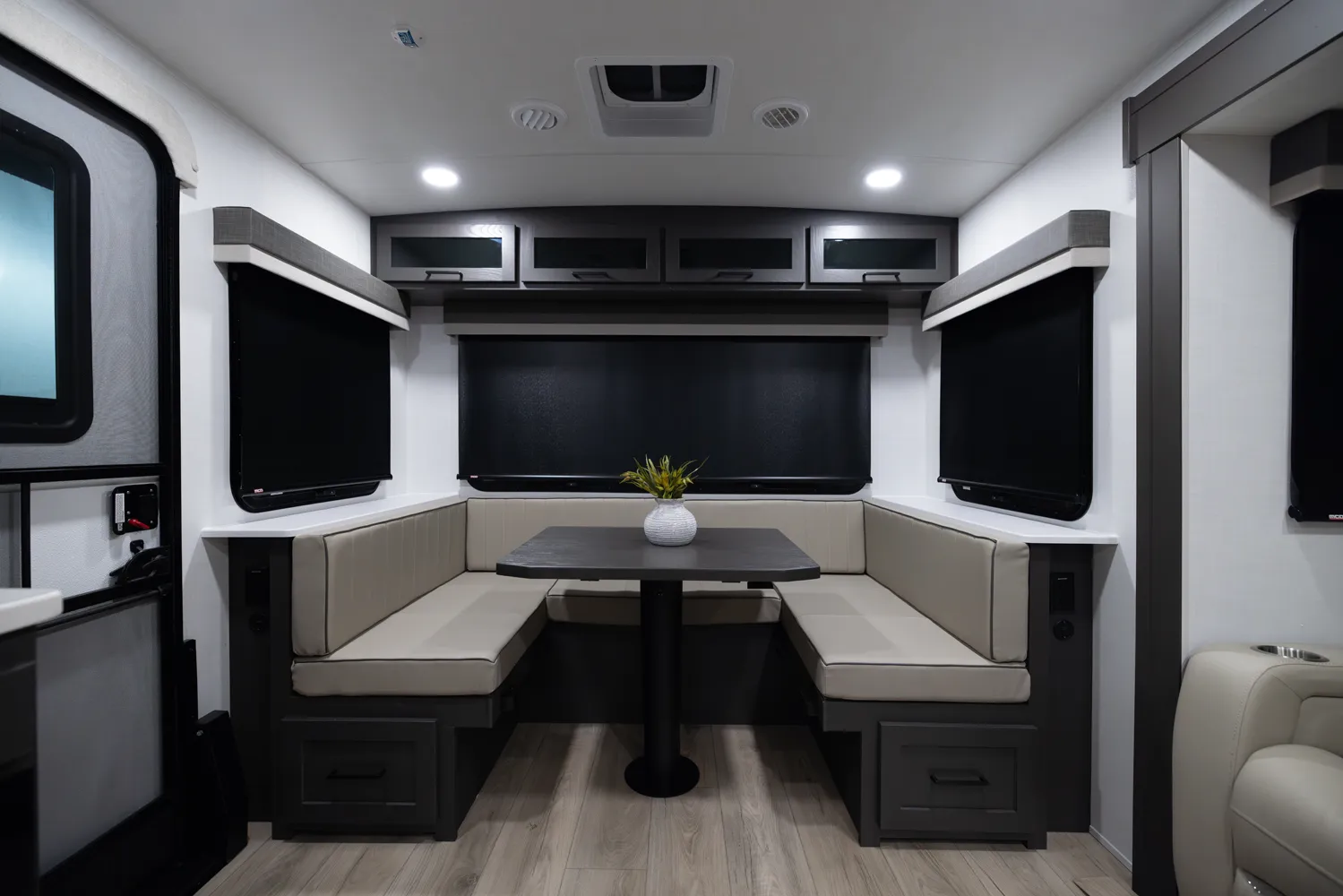 The 2618RD features a front bedroom with a true queen bed and wardrobe slide. Two entry doors provide easy access to the bedroom, large pass-through bathroom, and kitchen even when slides are in. The rear U-shaped dinette and 67" theater seat create a spacious, comfortable living area, making the 2618RD perfect for couples or small families.