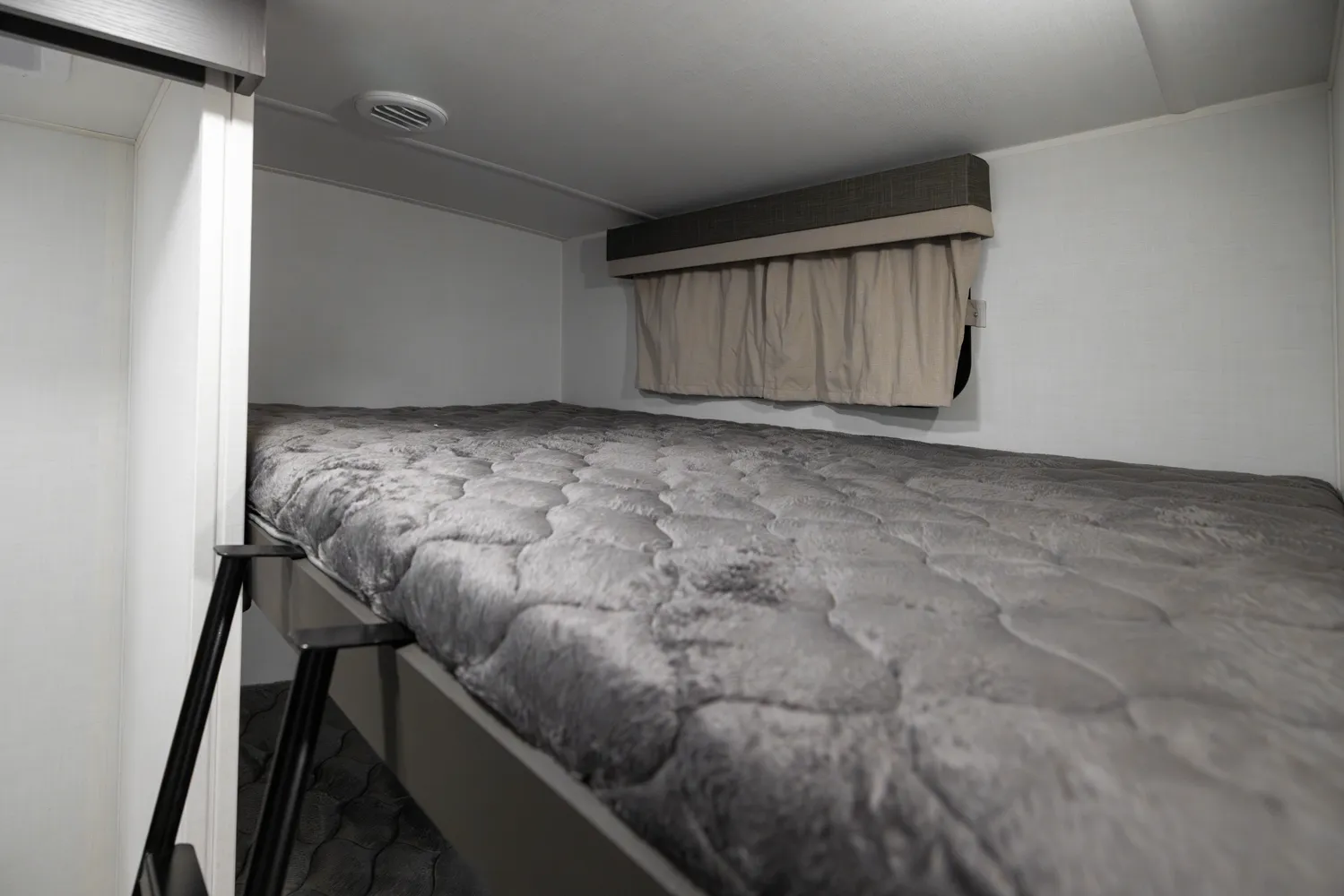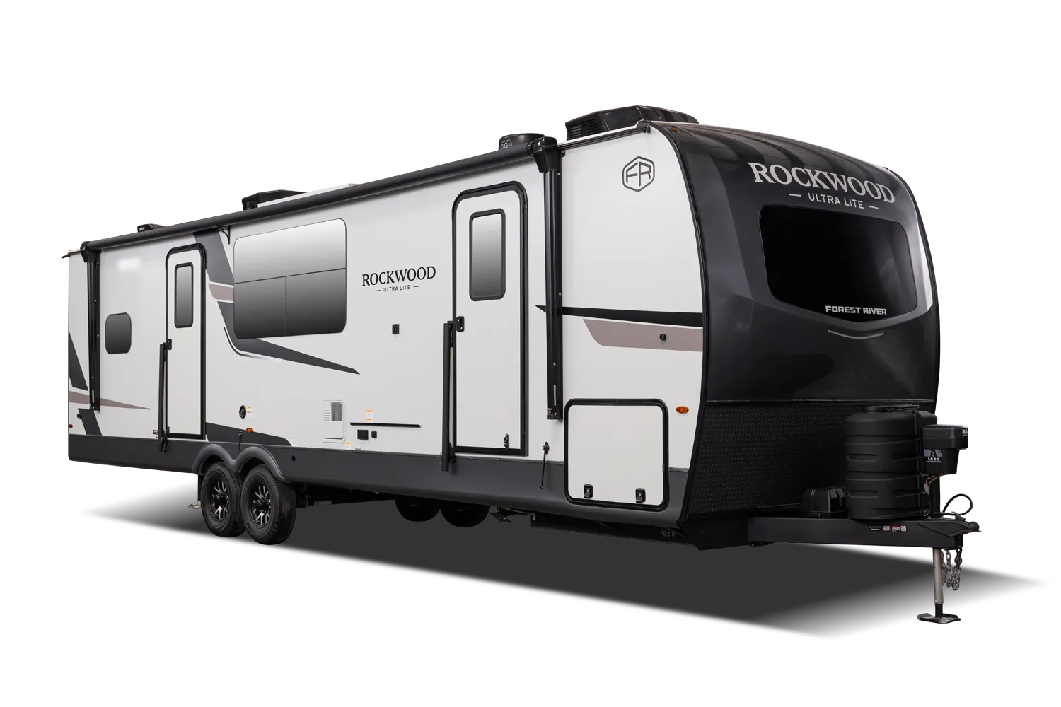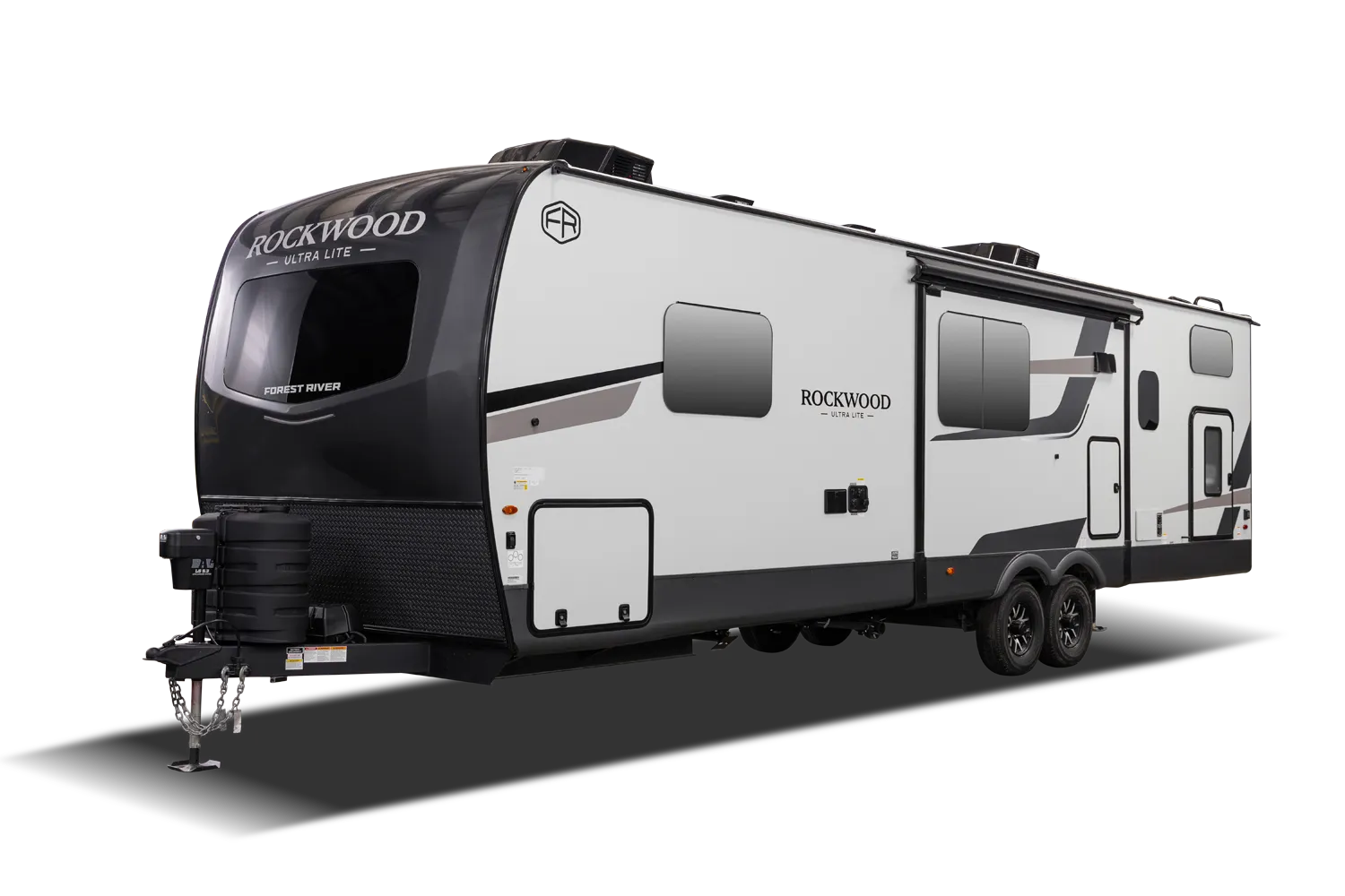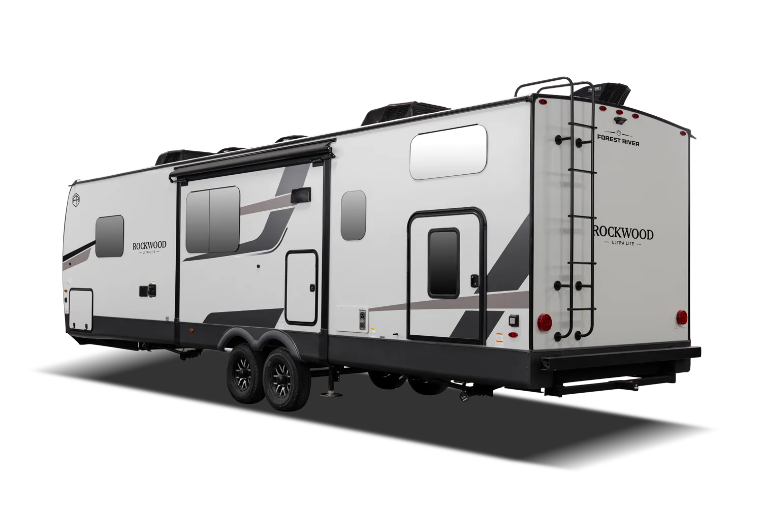 The Rockwood 2918BH features a front bedroom with a true queen bed and a large master bathroom with shower. The spacious living area and kitchen include theater seating and a dinette for comfort and dining. A rear half-bath and segregated bunk room provide privacy and convenience, making the 2918BH ideal for families seeking versatile space and comfort on the road.