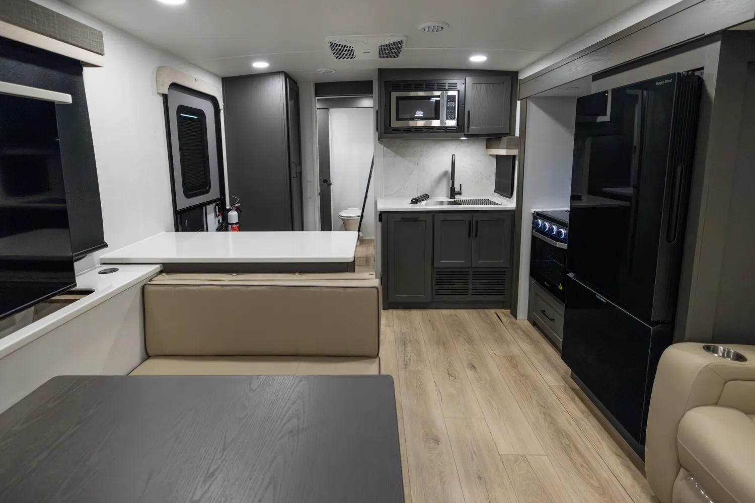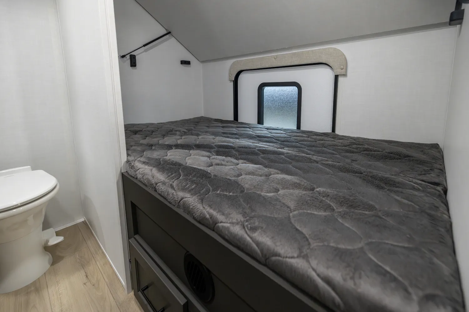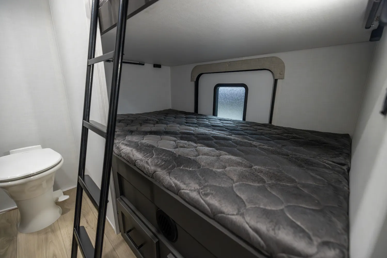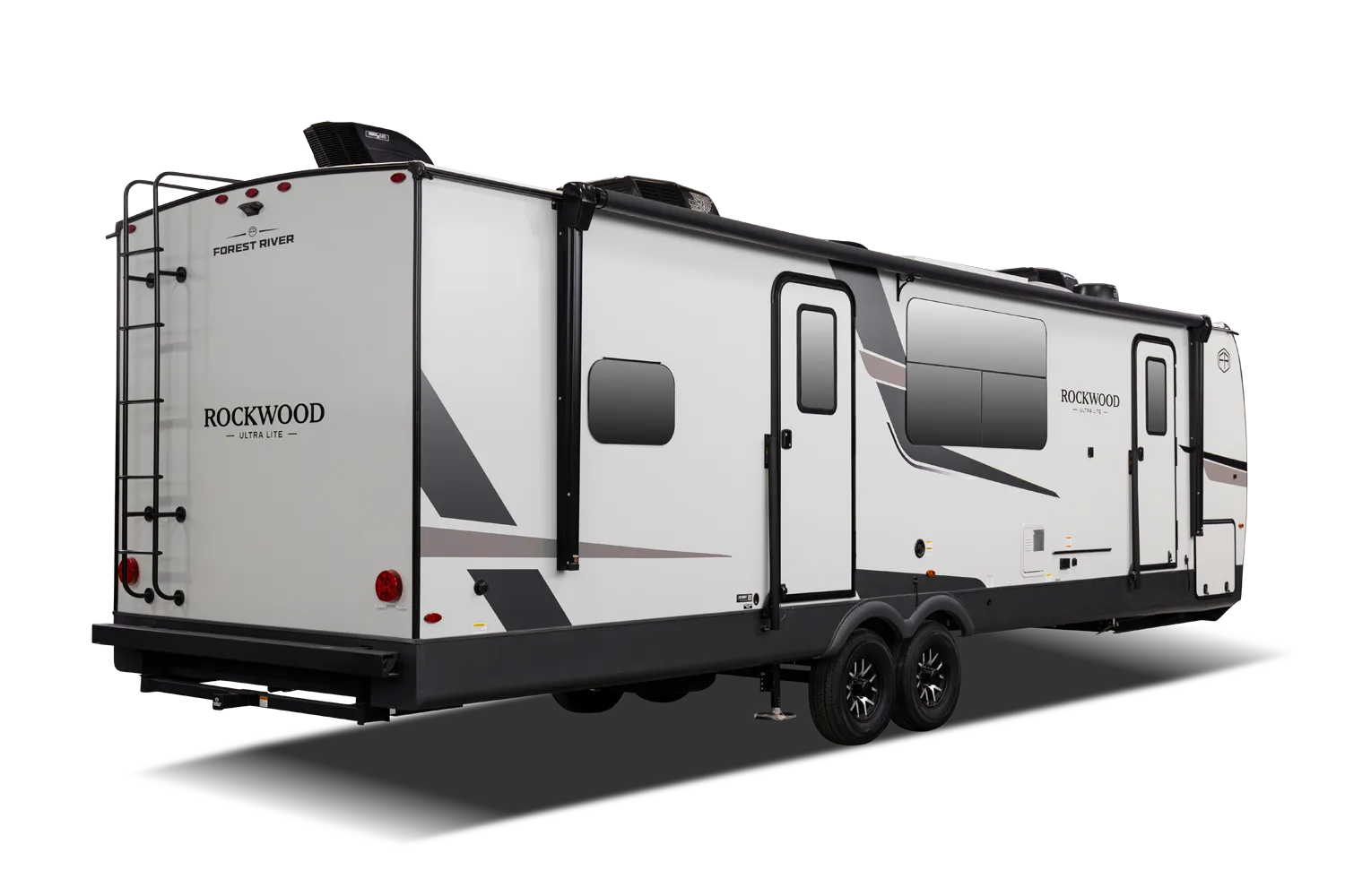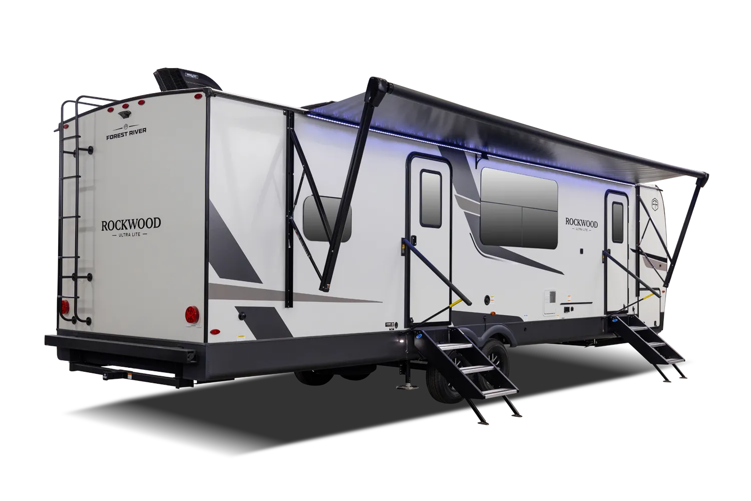 The Rockwood 2918BH features a front bedroom with a true queen bed and a large master bathroom with shower. The spacious living area and kitchen include theater seating and a dinette for comfort and dining. A rear half-bath and segregated bunk room provide privacy and convenience, making the 2918BH ideal for families seeking versatile space and comfort on the road.