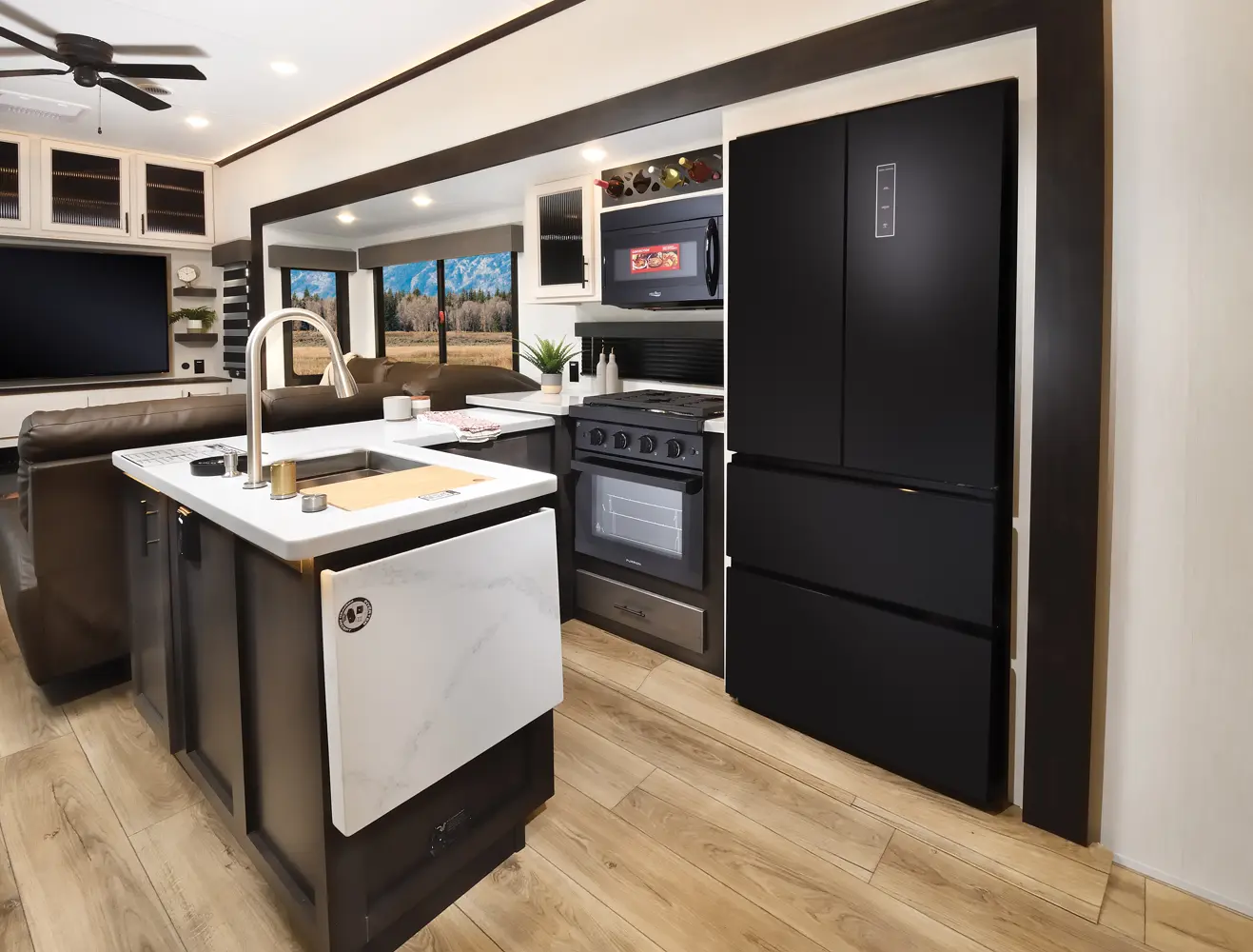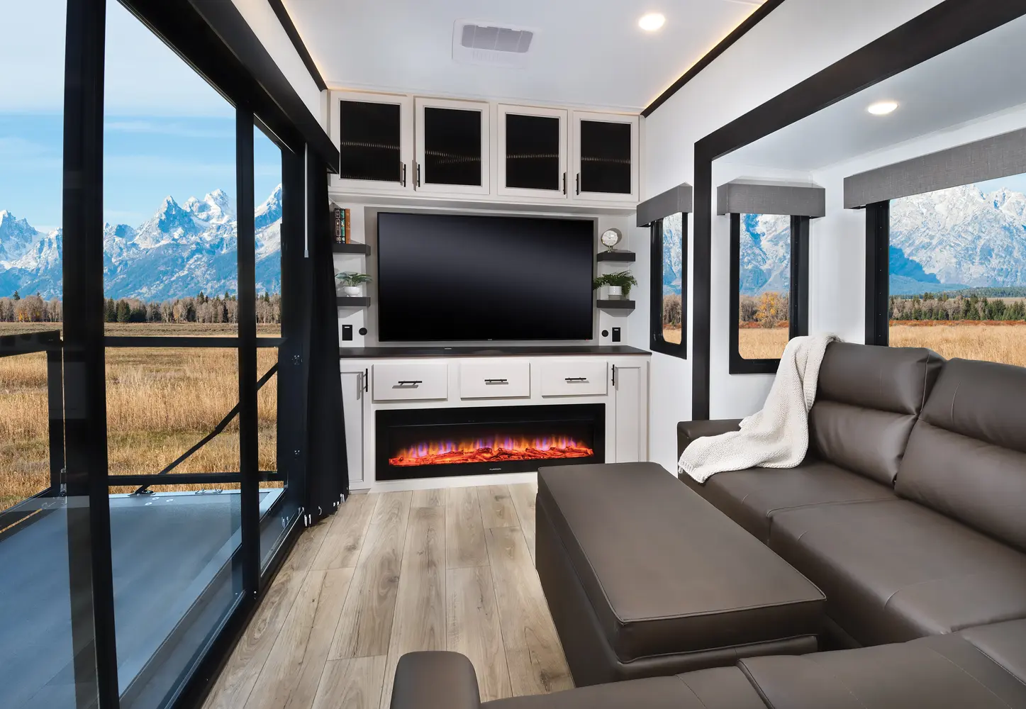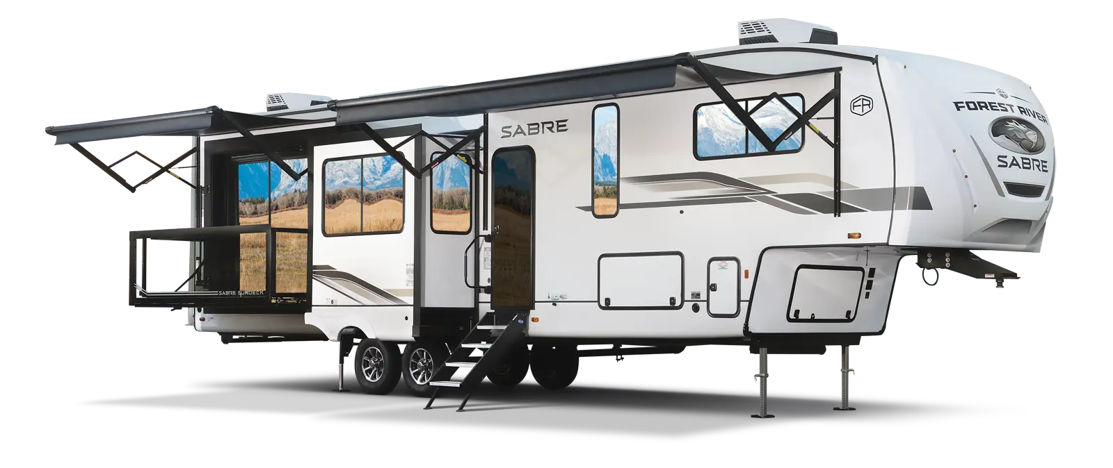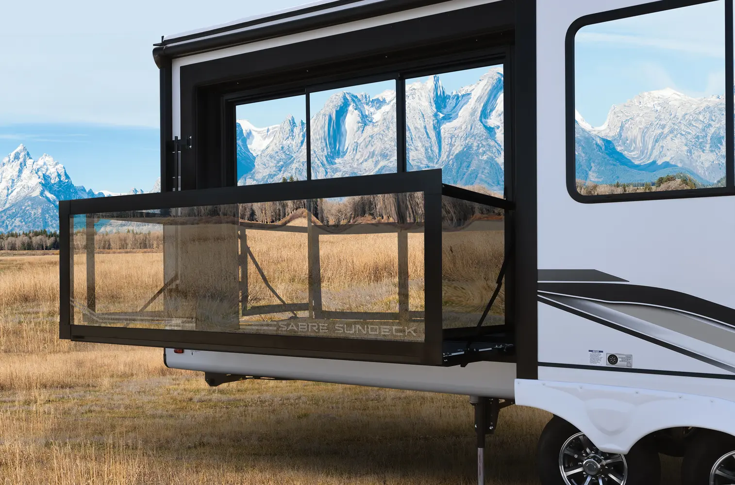Discover the future of 5th wheel RV living with the Sabre Sundeck 33RLP by Forest River. This innovative RV features an industry-first retractable patio deck, extending your outdoor living space. Inside, you’ll find a L-shaped sectional, perfect for relaxation, and an impressive entertainment center complete with a fireplace. The fully equipped kitchen is a chef’s dream, boasting ample solid surface countertops, a residential-style oven, an air fryer microwave, and a 12-volt refrigerator.