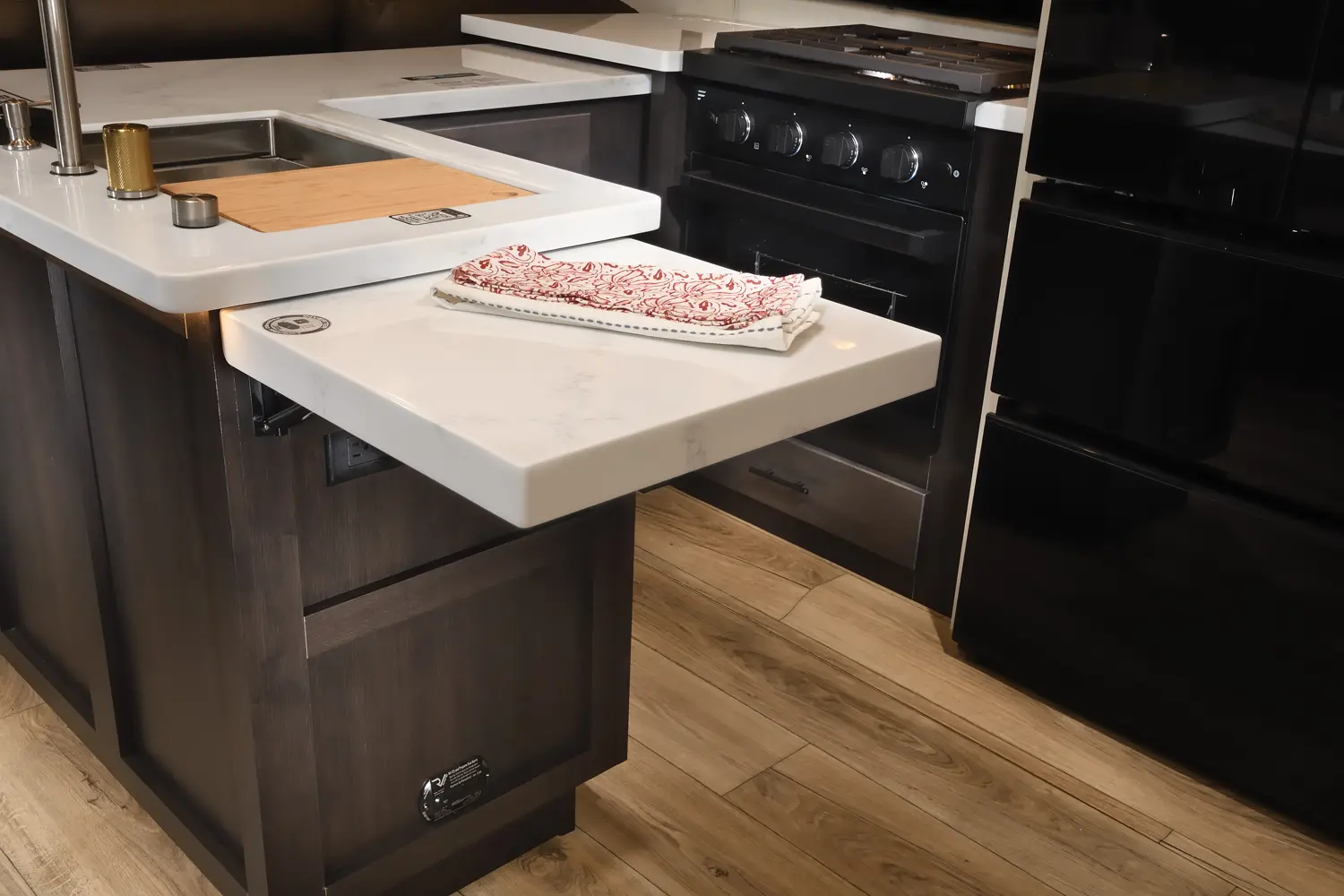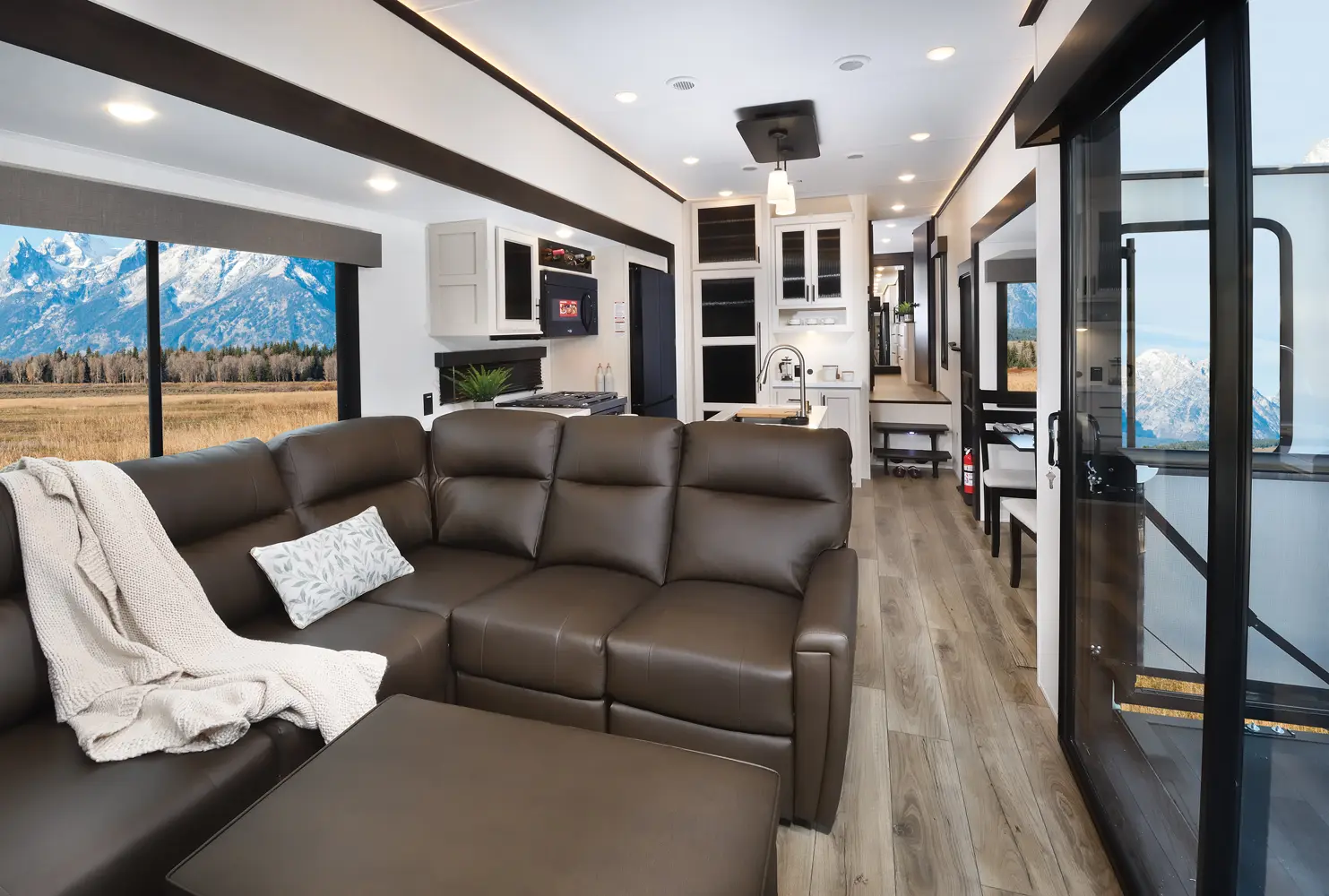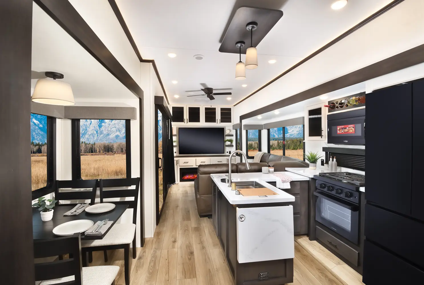 Discover the future of 5th wheel RV living with the Sabre Sundeck 33RLP by Forest River. This innovative RV features an industry-first retractable patio deck, extending your outdoor living space. Inside, you’ll find a L-shaped sectional, perfect for relaxation, and an impressive entertainment center complete with a fireplace. The fully equipped kitchen is a chef’s dream, boasting ample solid surface countertops, a residential-style oven, an air fryer microwave, and a 12-volt refrigerator.