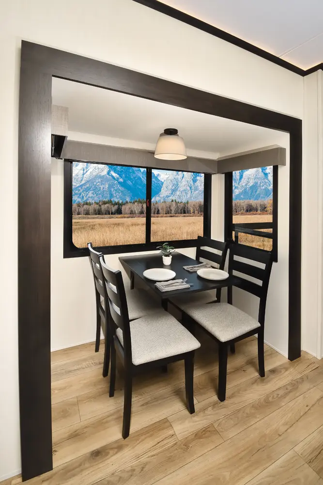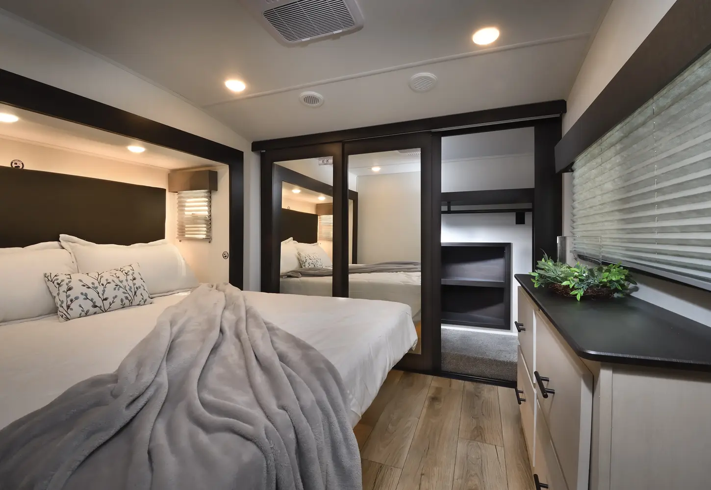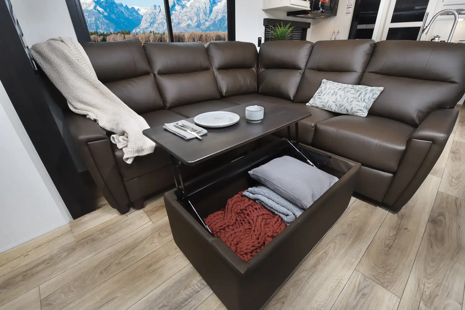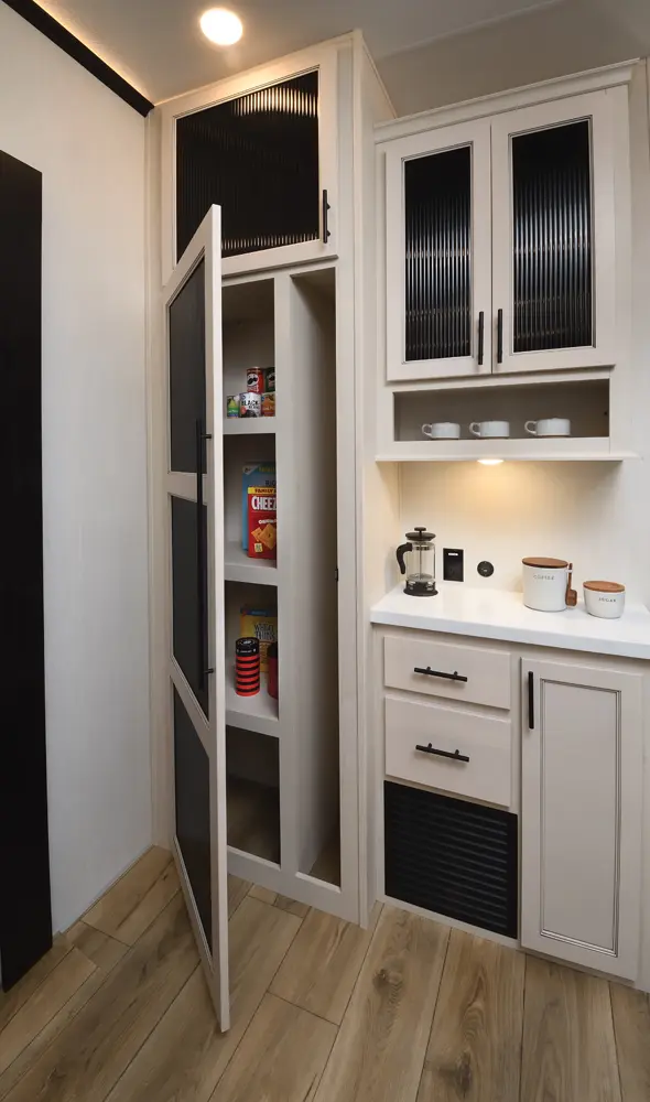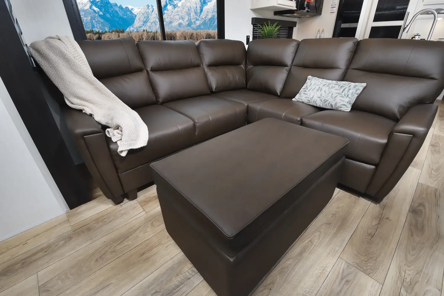 Discover the future of 5th wheel RV living with the Sabre Sundeck 33RLP by Forest River. This innovative RV features an industry-first retractable patio deck, extending your outdoor living space. Inside, you’ll find a L-shaped sectional, perfect for relaxation, and an impressive entertainment center complete with a fireplace. The fully equipped kitchen is a chef’s dream, boasting ample solid surface countertops, a residential-style oven, an air fryer microwave, and a 12-volt refrigerator.