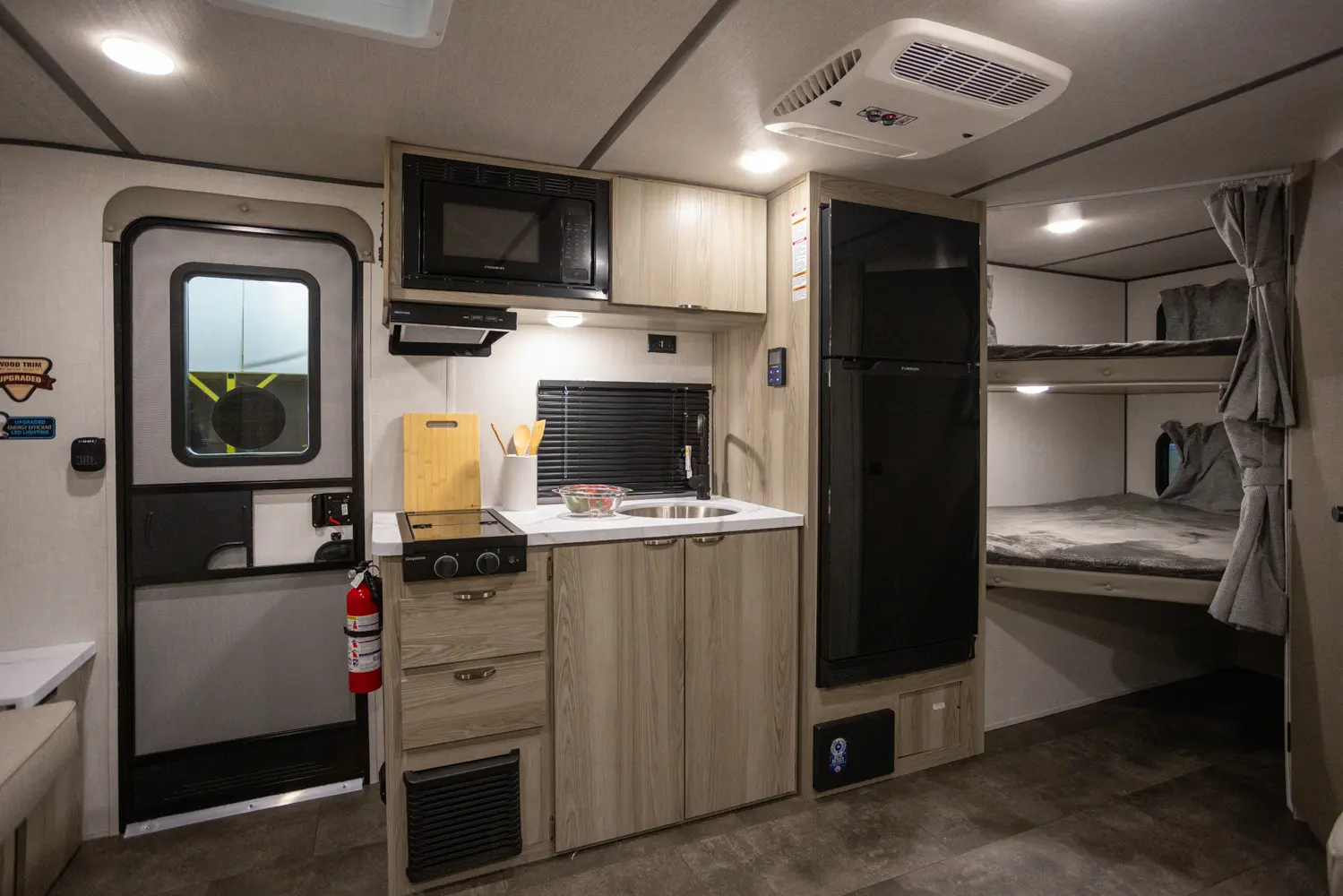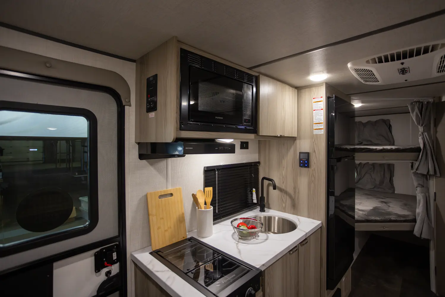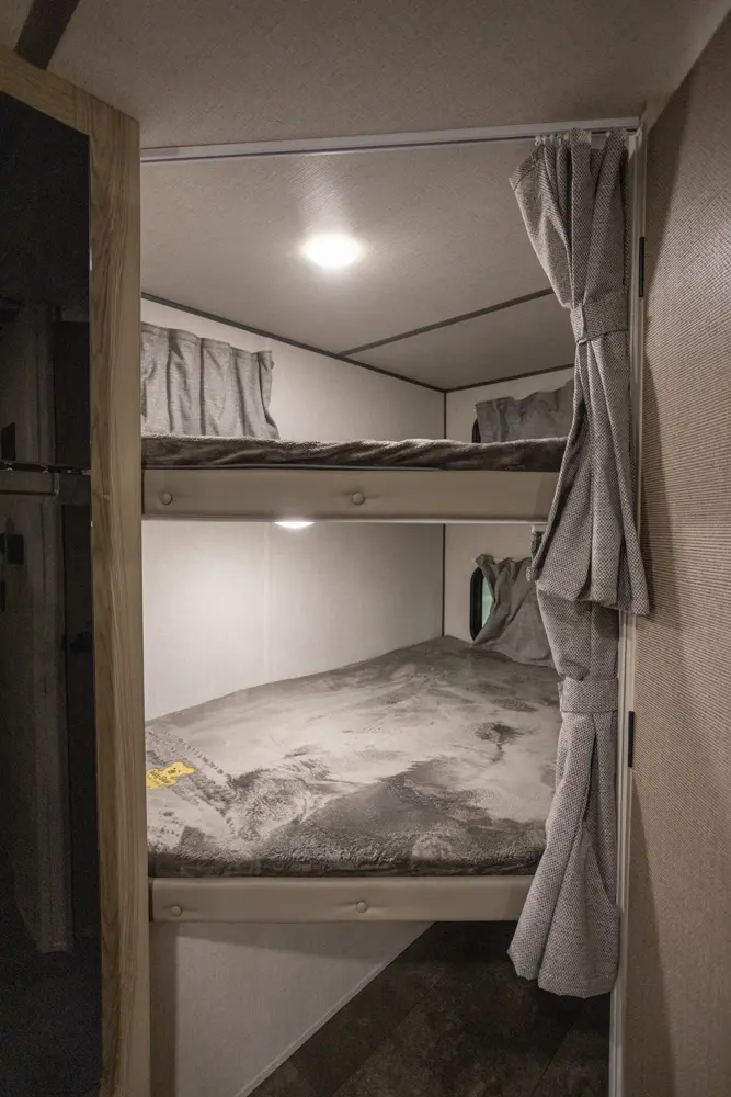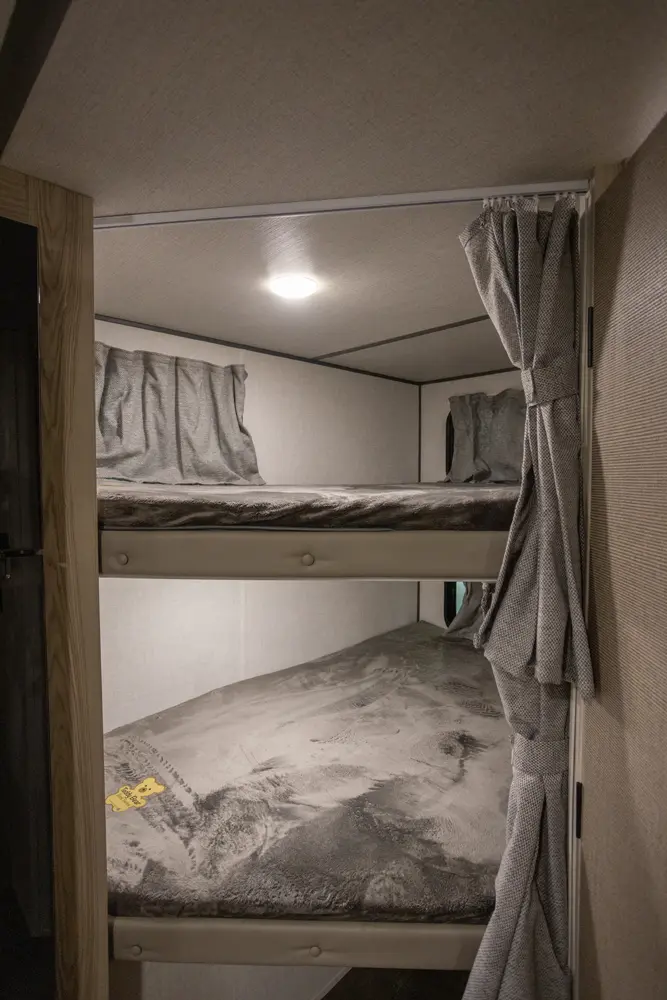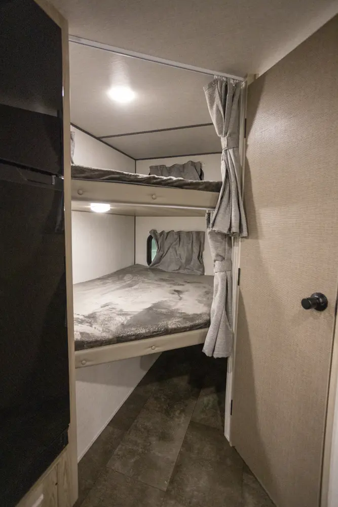 The 17BHSK is packed with features and weighs in at less than 4,000 lb. The unique front queen bed flips up to create additional seating space during the day. The kitchen slide provides extra room for the ever-popular U-dinette and includes a panoramic window. The rear bunkhouse gives you double over double bunks for additional flexibility and comfort, while the outside kitchen gives you additional options for mealtime and entertaining.