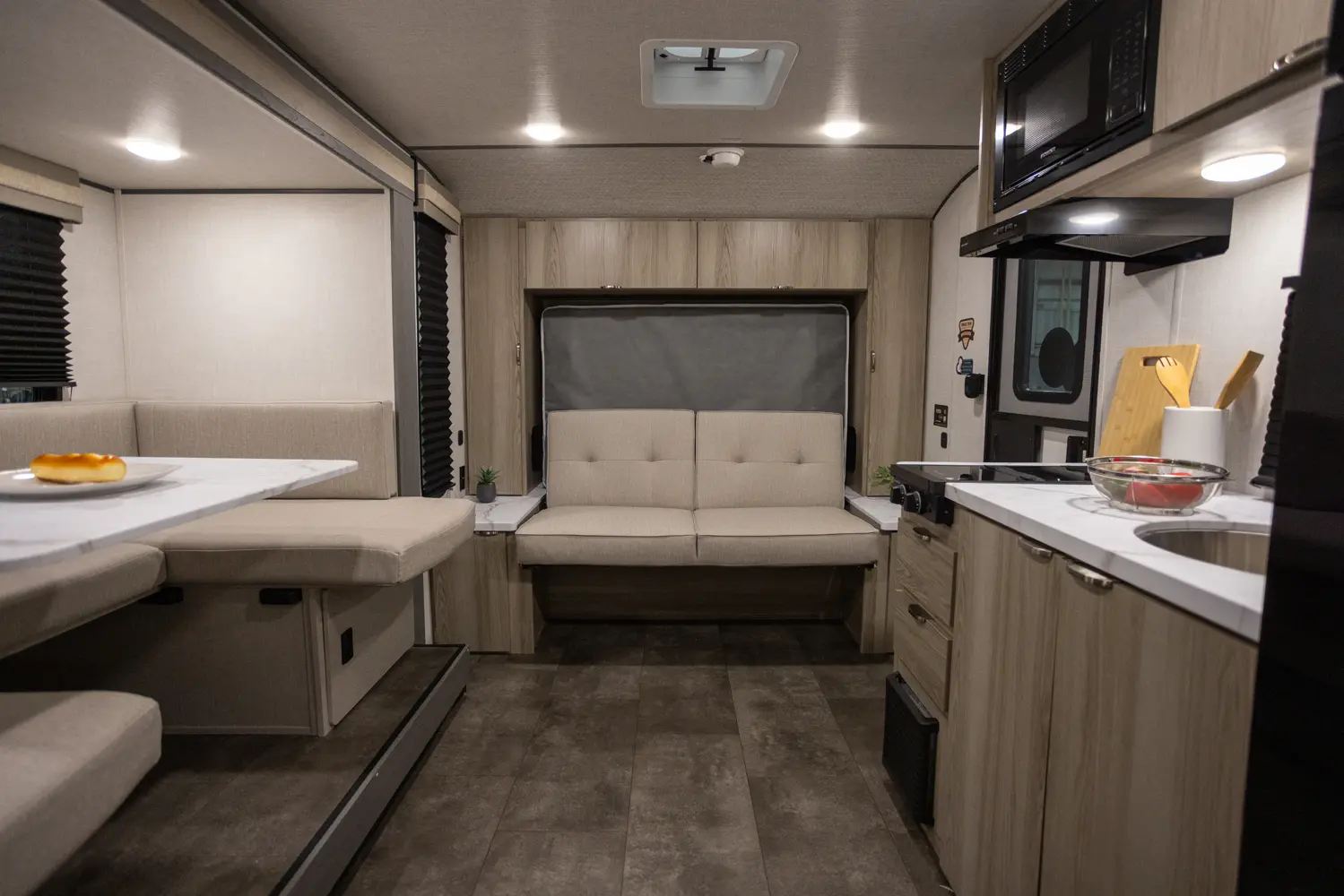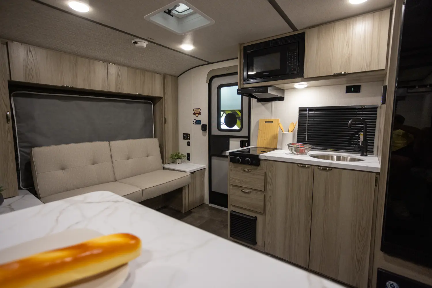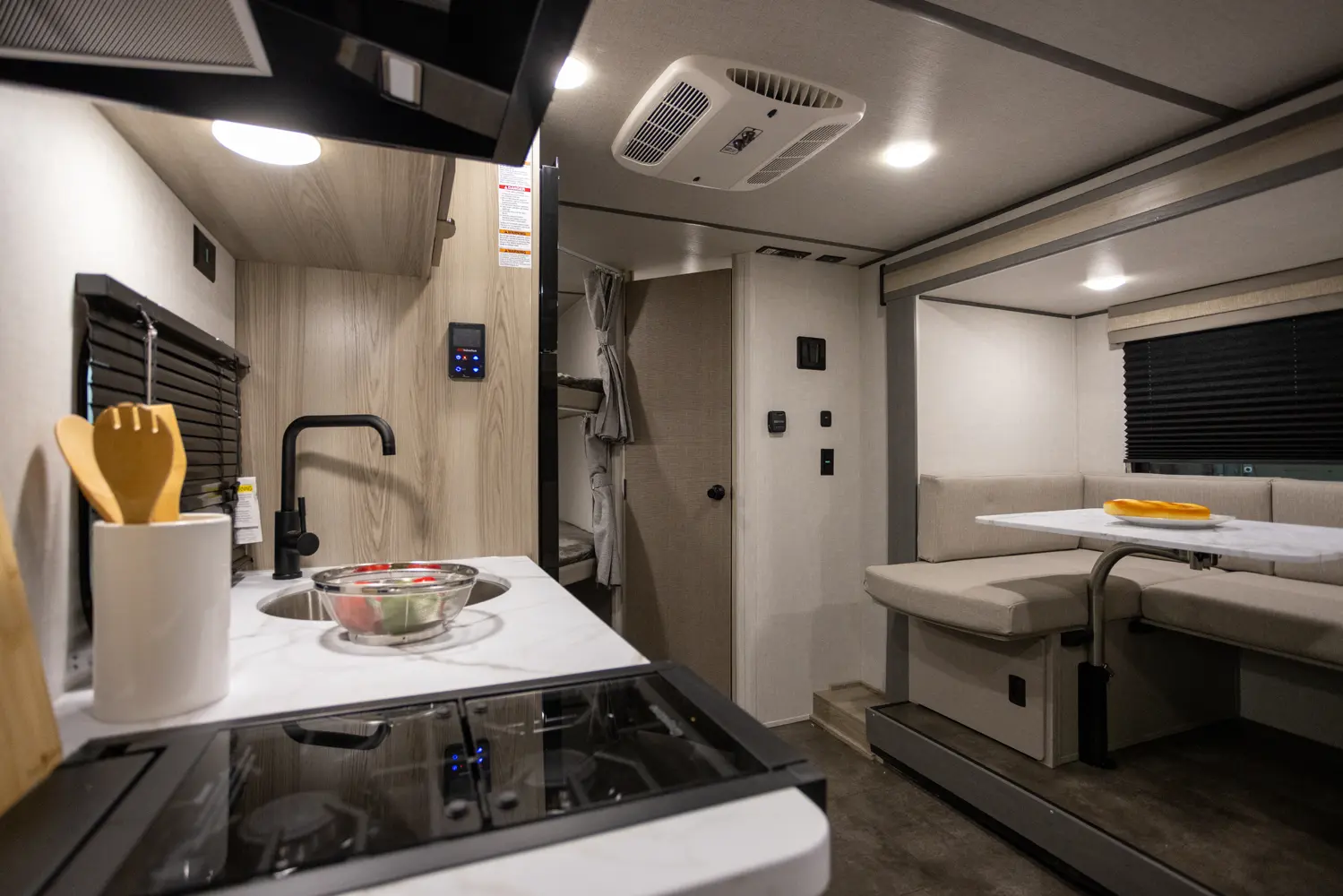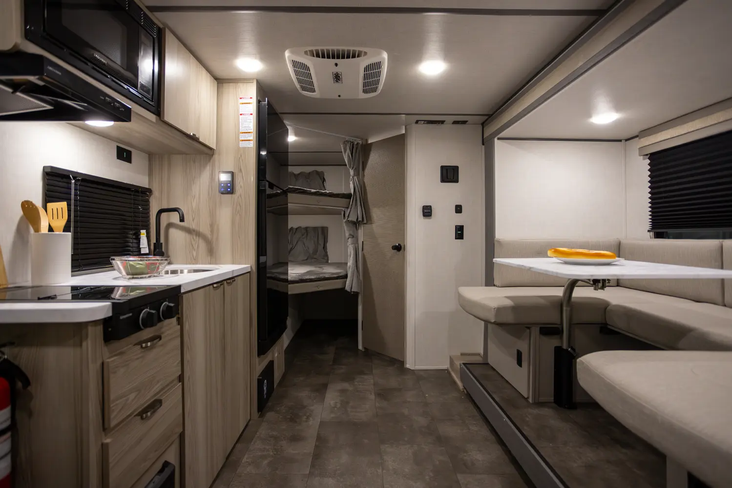 The 17BHSK is packed with features and weighs in at less than 4,000 lb. The unique front queen bed flips up to create additional seating space during the day. The kitchen slide provides extra room for the ever-popular U-dinette and includes a panoramic window. The rear bunkhouse gives you double over double bunks for additional flexibility and comfort, while the outside kitchen gives you additional options for mealtime and entertaining.