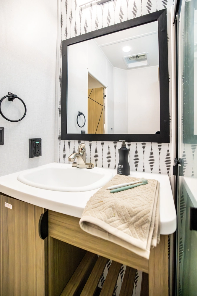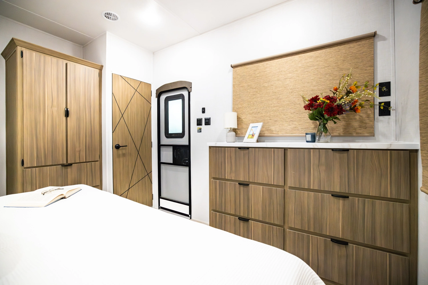The Salem Villa 40FDEN is an open floorplan that maximizes space for a residential cottage look and feel. The panoramic windows and front slide combine great campsite views with lots of elbow room, while the kitchen and dining area are equipped with residential appliances and custom decorator touches. The large king bedroom provides plenty of storage and optional washer/dryer hookup, with the bathroom offering a walk-in shower with built-in seat, skylight, and linen cabinets.