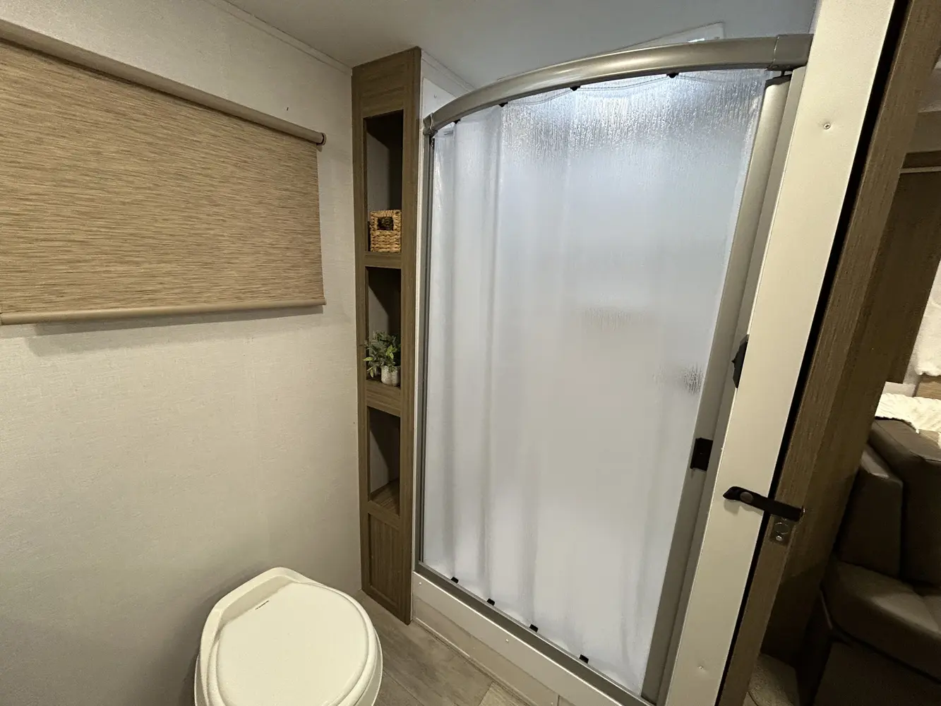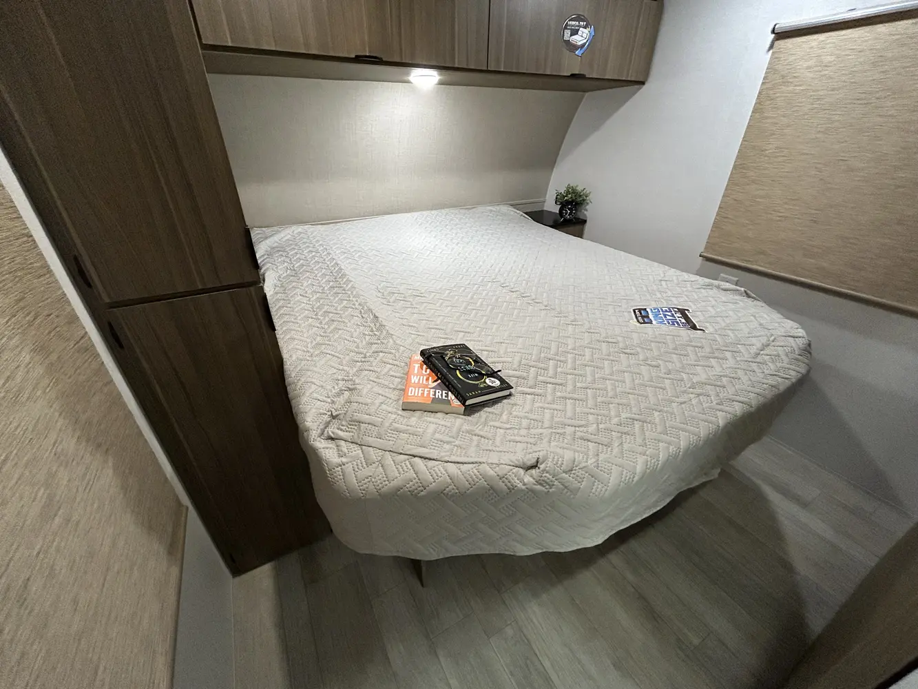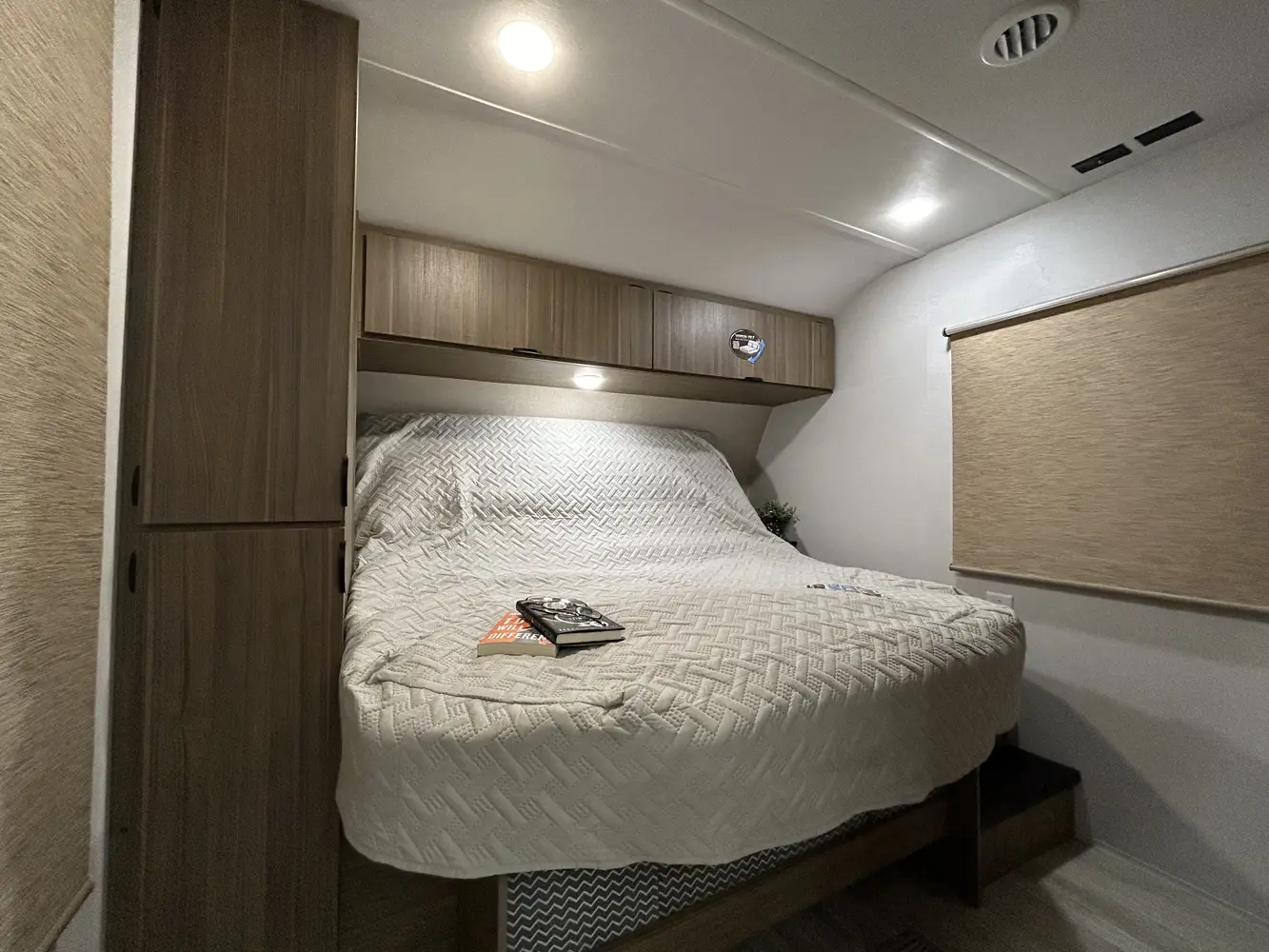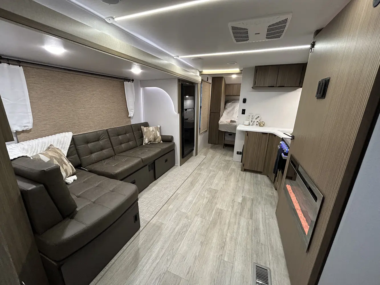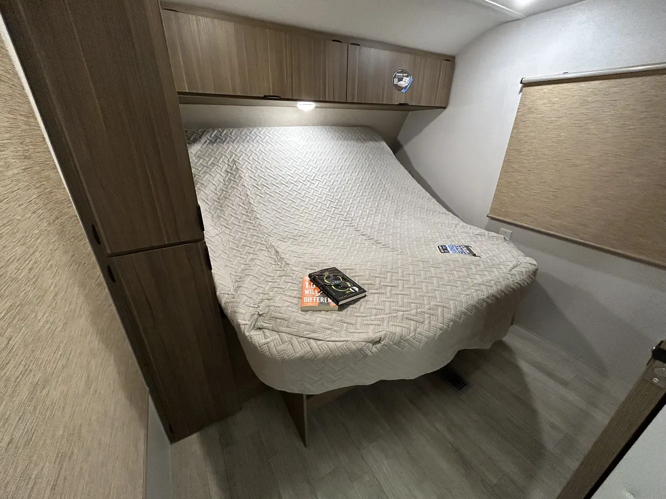 The Salem 22RBS is the perfect couple's coach, with a front queen bedroom and HUGE rear bath with walk-in shower. The living area features a unique 8' chaise lounge/dinette that has a direct view of the entertainment center and fireplace.