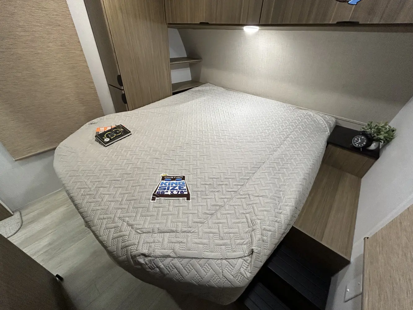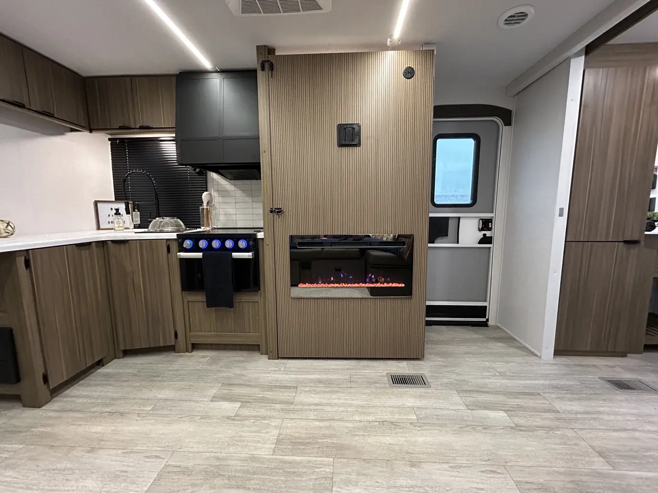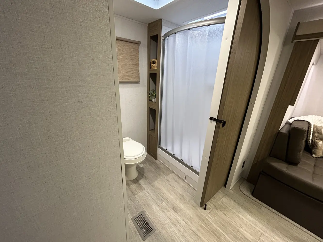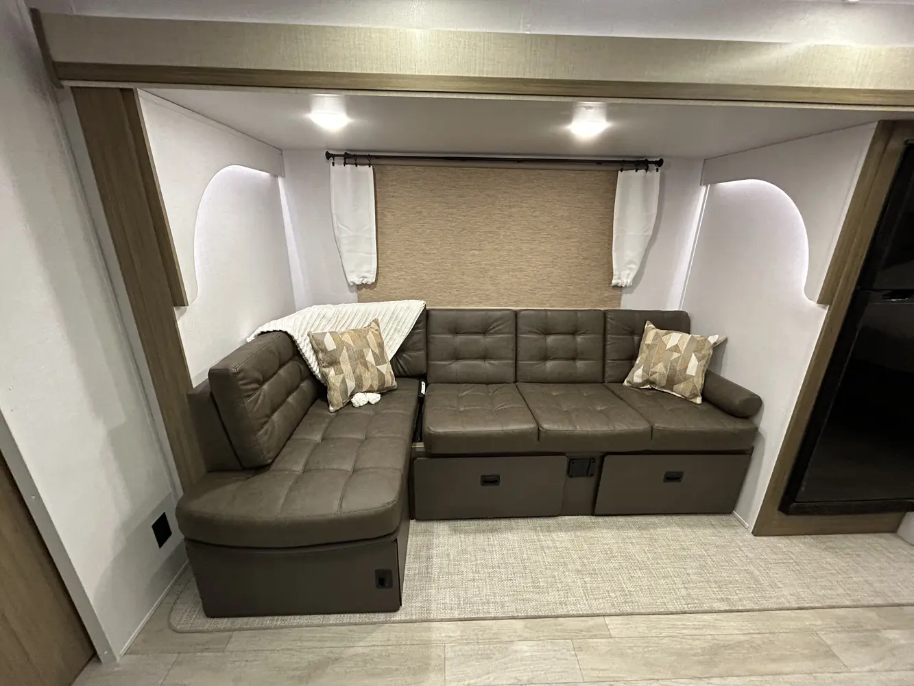 The Salem 22RBS is the perfect couple's coach, with a front queen bedroom and HUGE rear bath with walk-in shower. The living area features a unique 8' chaise lounge/dinette that has a direct view of the entertainment center and fireplace.