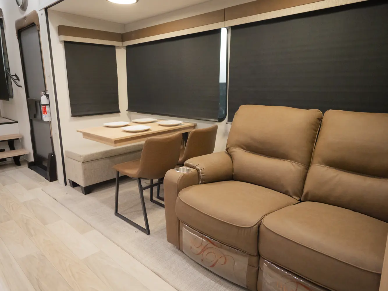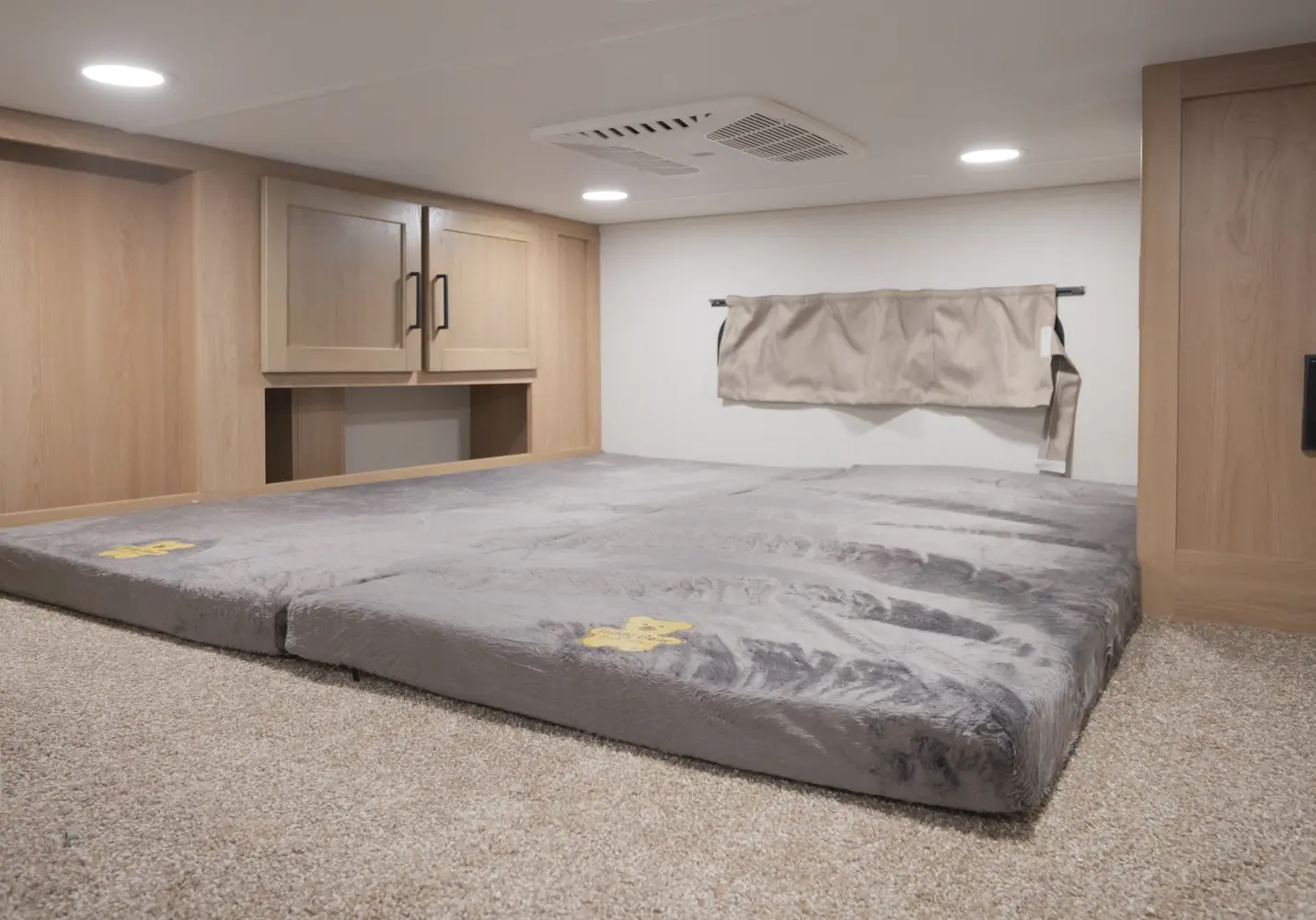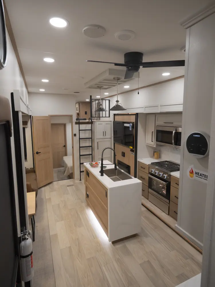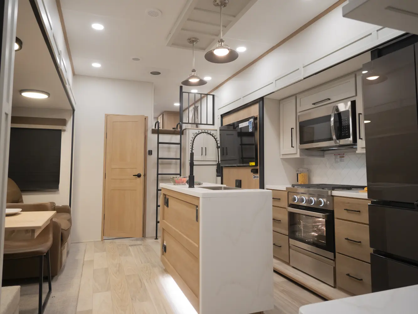 The 4002FB is a double queen bed and loft coach. With 4 slideouts and a double bunk loft, this floorplan has enough sleeping space for whoever wants to tag along. Rear entry into the 2nd full bath will offer full amenities without cluttering or using the master bath. The island kitchen and theater seating provide a great space to entertain and unwind. The 4002FB is extremely versatile, utilizing the extra bedroom or loft for storage when the sleeping space isn't needed.