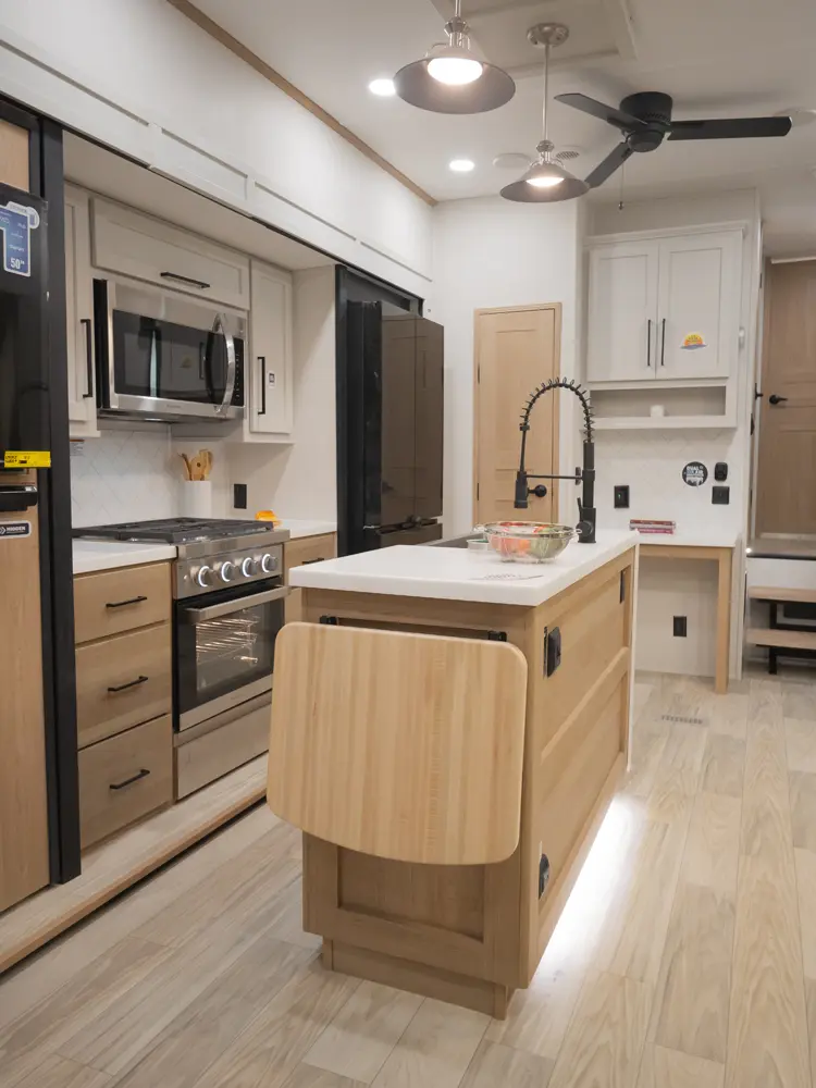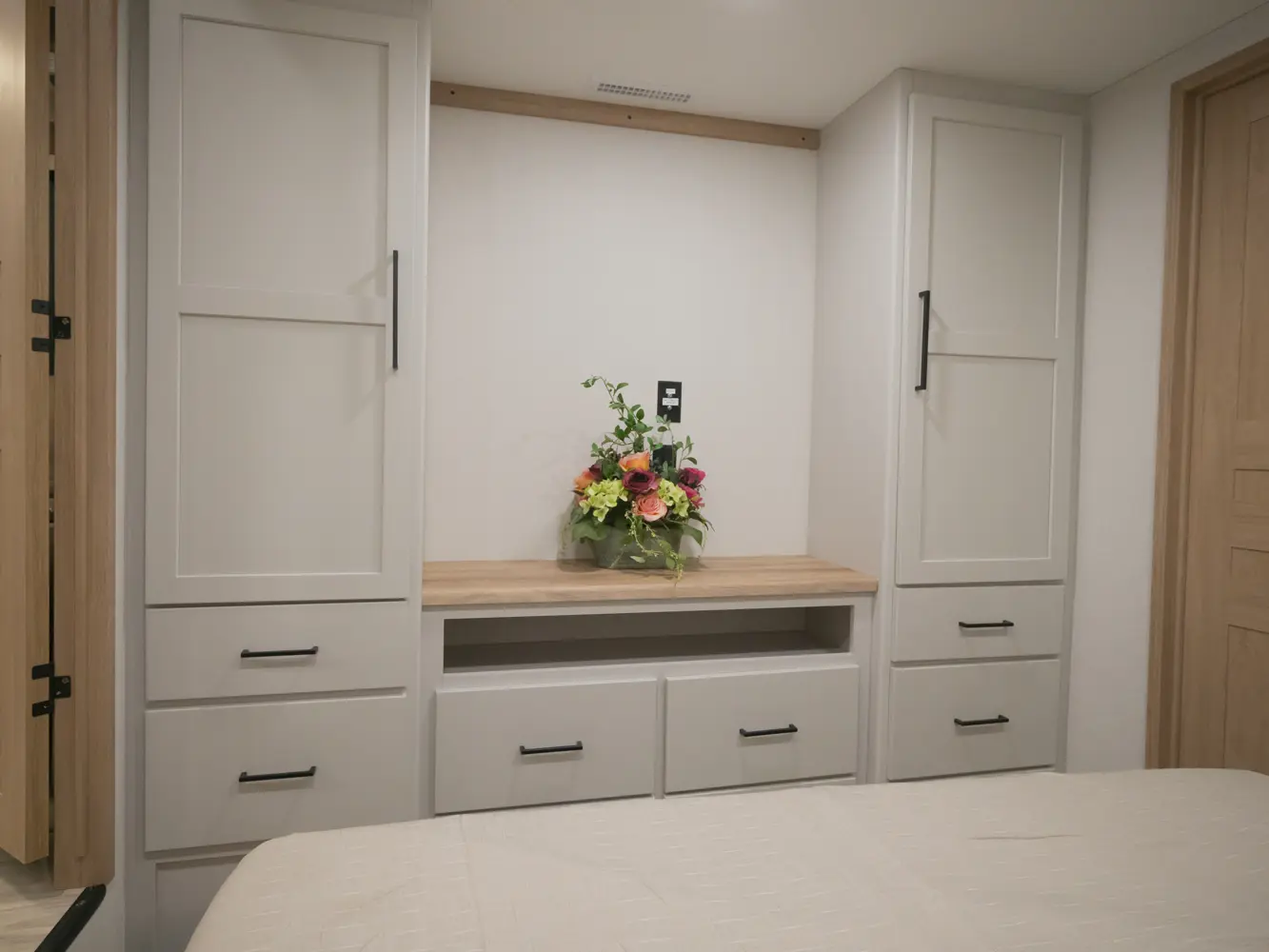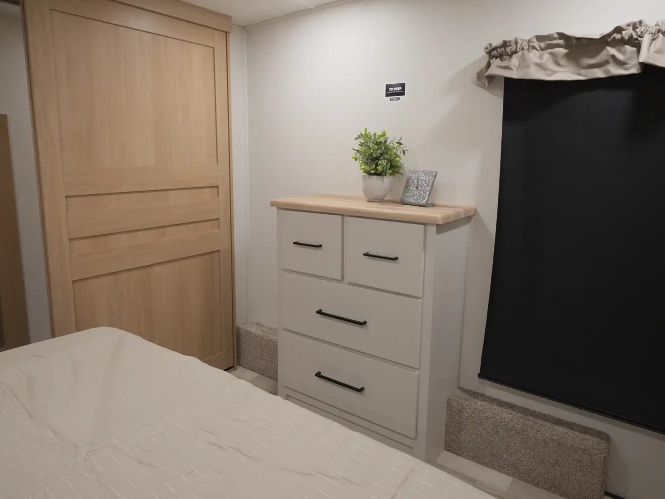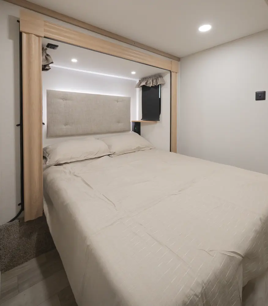The 4002FB is a double queen bed and loft coach. With 4 slideouts and a double bunk loft, this floorplan has enough sleeping space for whoever wants to tag along. Rear entry into the 2nd full bath will offer full amenities without cluttering or using the master bath. The island kitchen and theater seating provide a great space to entertain and unwind. The 4002FB is extremely versatile, utilizing the extra bedroom or loft for storage when the sleeping space isn't needed.
