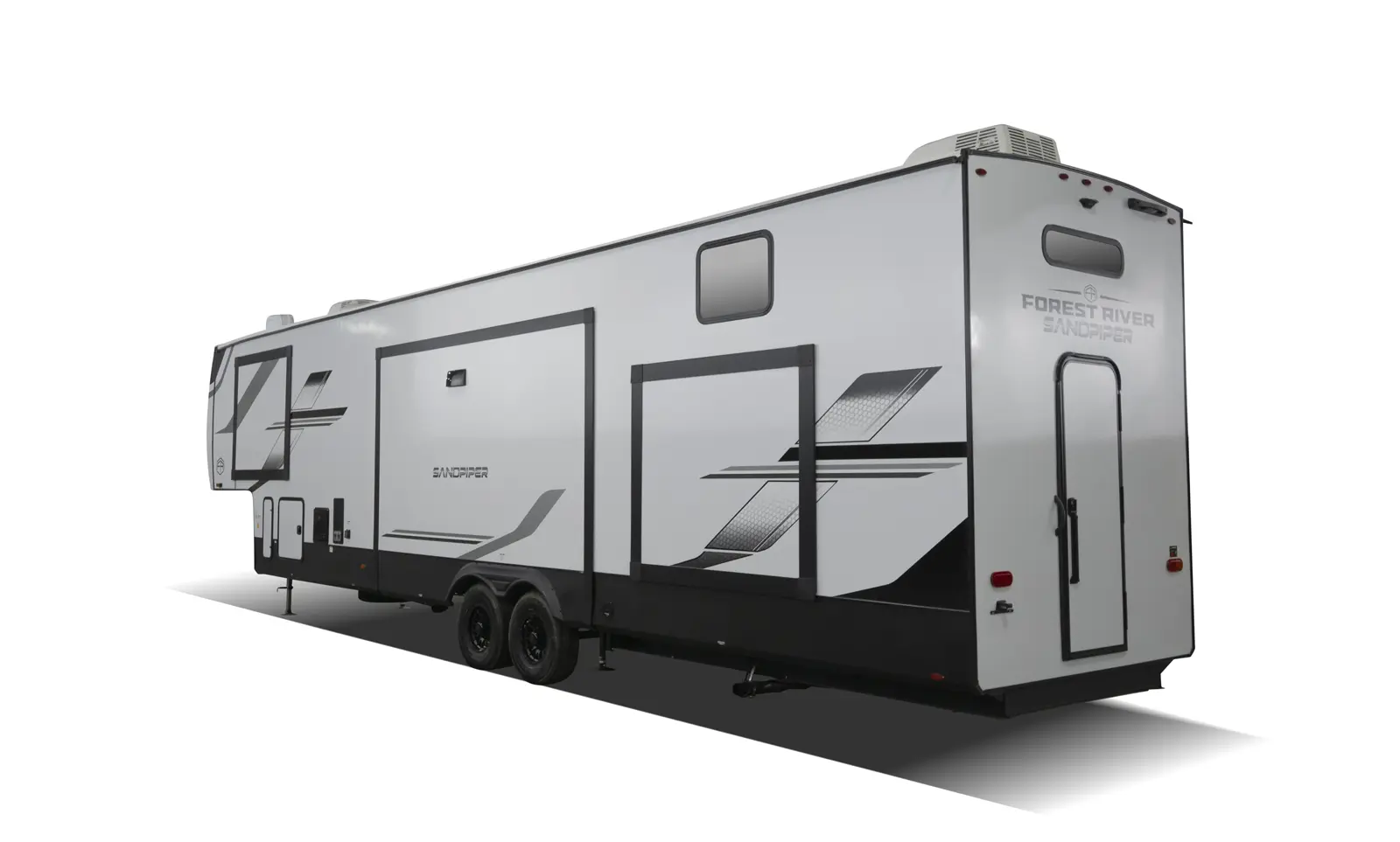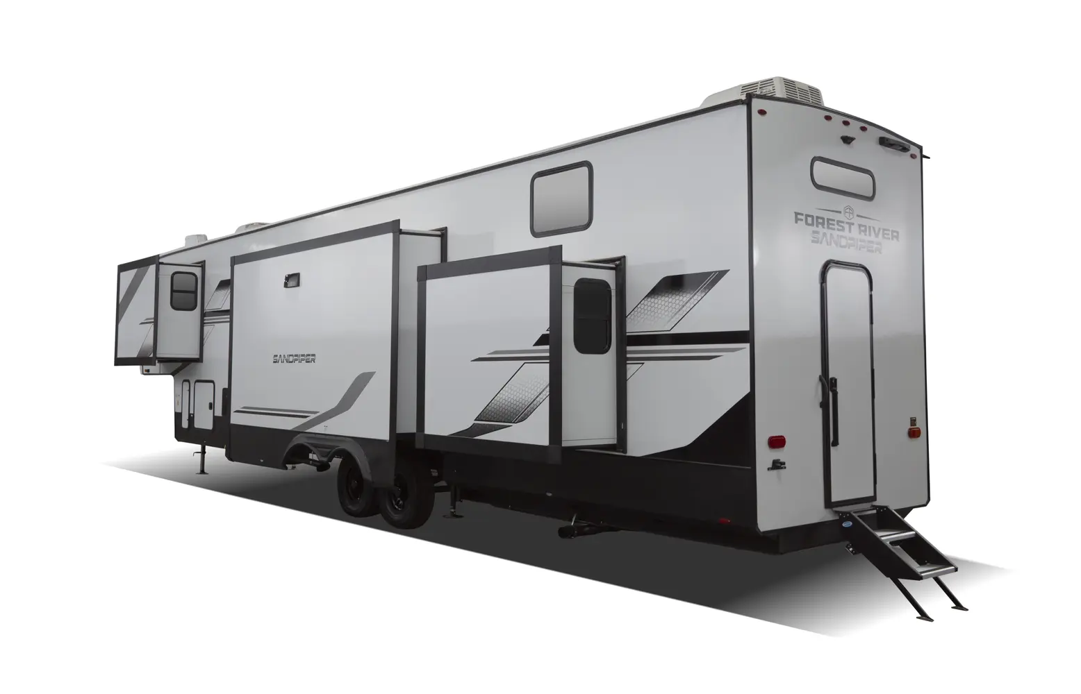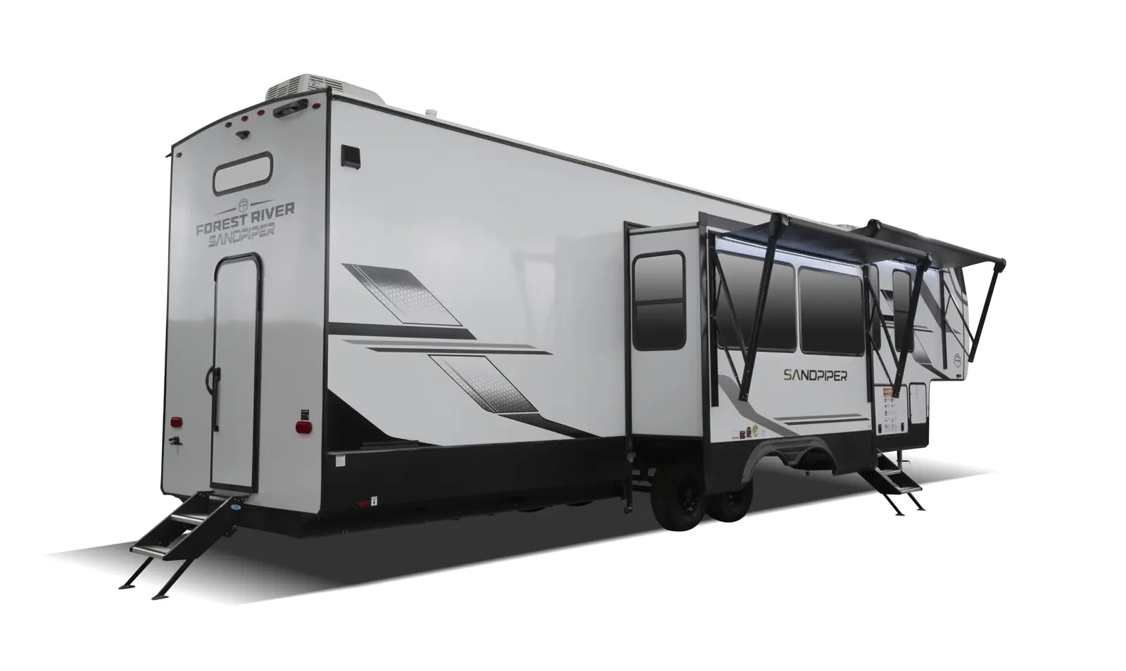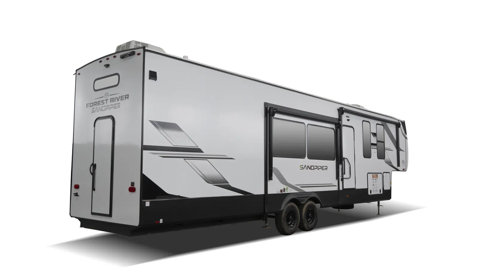 The Sandpiper Fifth Wheels 4002FB floorplan has two entries and four slide outs. Exterior features include: fiberglass exterior and 10'8" & 15' awning. Interiors features include: loft, kitchen island, free-standing dinette option, front bedroom, two bedrooms, rear bathroom and two full bathrooms.