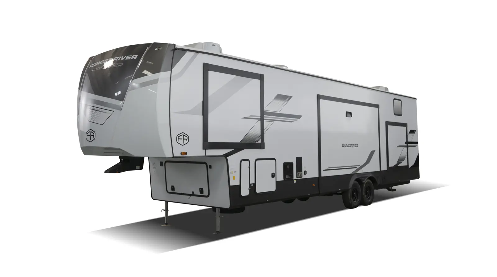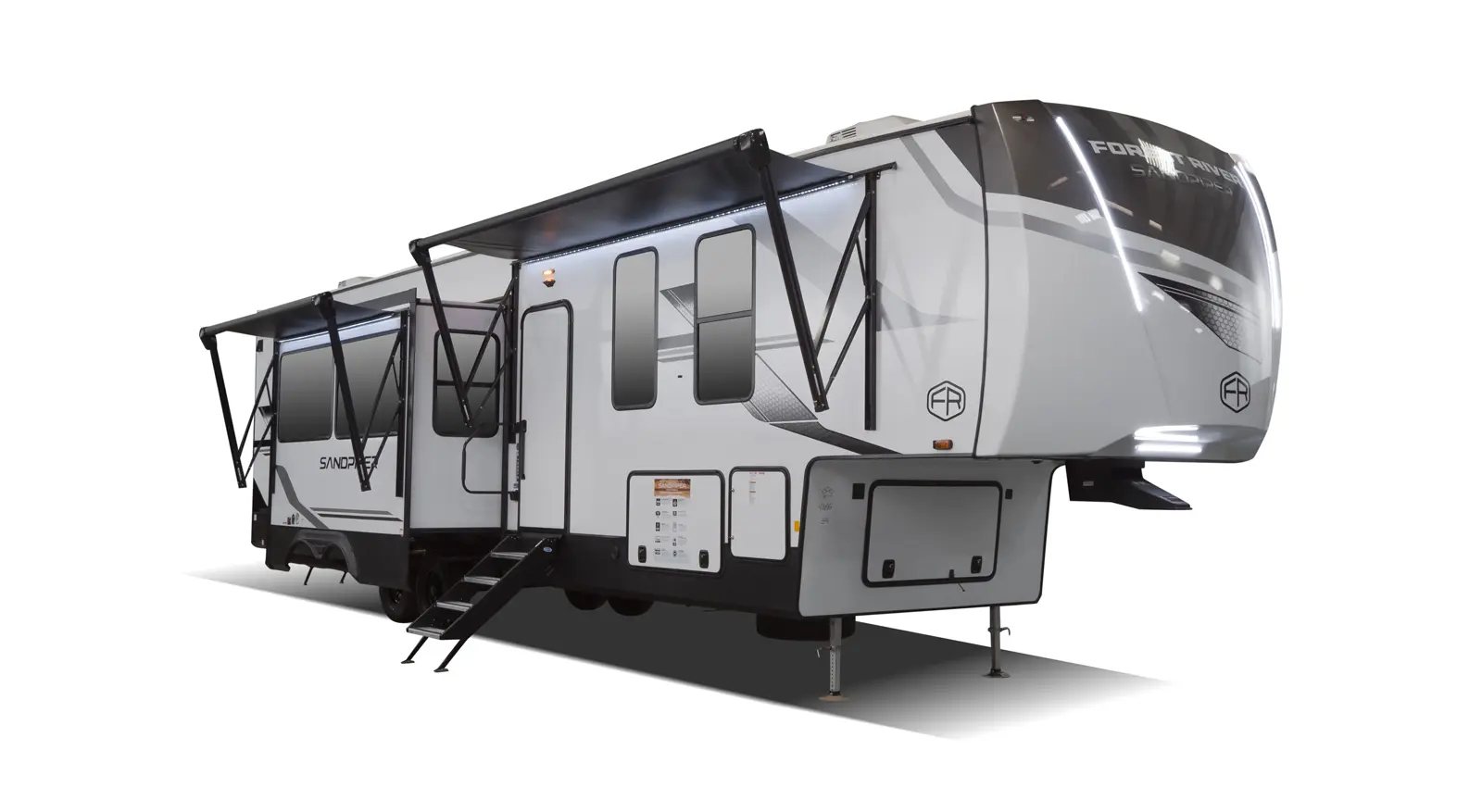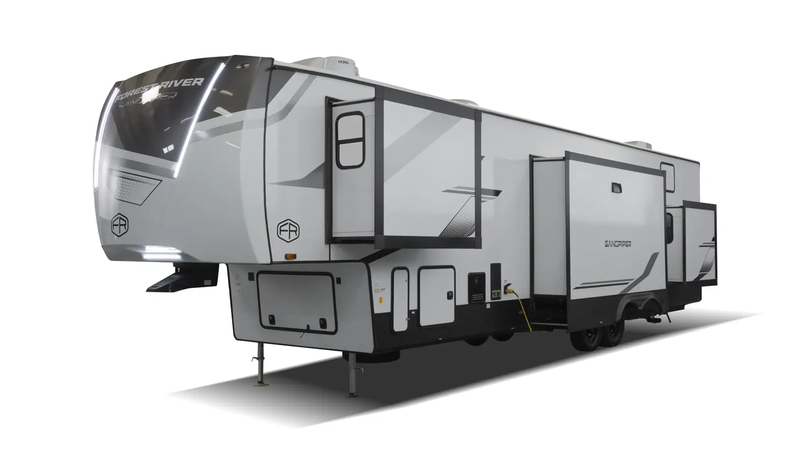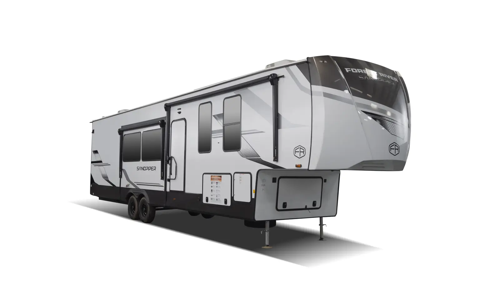 The Sandpiper Fifth Wheels 4002FB floorplan has two entries and four slide outs. Exterior features include: fiberglass exterior and 10'8" & 15' awning. Interiors features include: loft, kitchen island, free-standing dinette option, front bedroom, two bedrooms, rear bathroom and two full bathrooms.