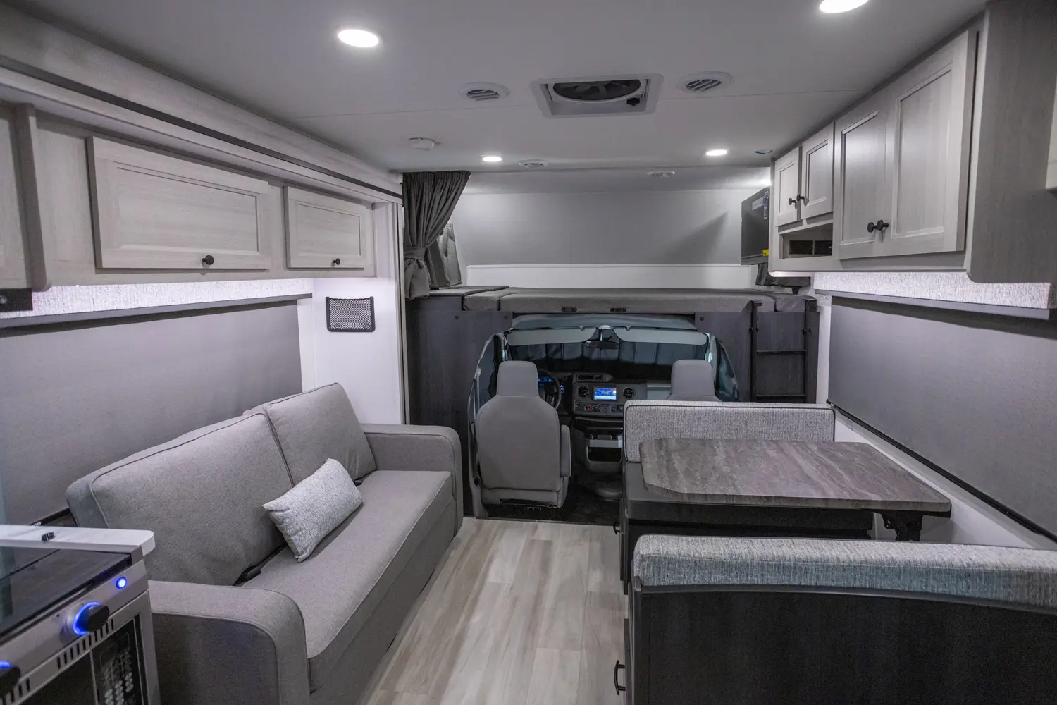 The Solera 32DSB is built on the Ford E450 chassis. This motorhome provides sleeping space for adults and kids alike, with a rear 60" x 74" queen bedroom that includes a wardrobe, plus a 28" x 72" flip-down bunk above the kid's sofa sleeper and the 60" x 80" bunk over cab. You could even transform the booth dinette and sofa into extra sleeping spaces if needed. The kitchen area is fully equipped for meals on the go, with a 10.7 cu ft 12V refrigerator, recessed 3-burner range with flush glass cover, and a 1.3 cu ft convection microwave oven. Overhead cabinets provide additional storage. The 60" x 80" bunk over cab provides more room for sleeping plus a 12V LED TV for extra entertainment!