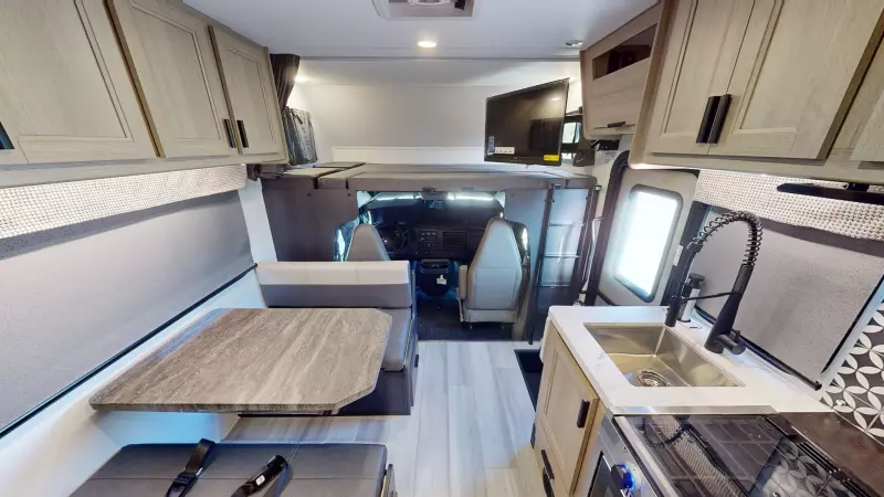 This 2250SLE is built on a Chevy 3500 or Ford E350 chassis. There is a rear bedroom with slideout and a 60" x 80" wedge mattress for enhanced sleep. The main living area includes a kitchen with 12V refrigerator, booth dinette, cooktop, convection microwave, and sink with a flip-up counter extension. In the front, there's a 60" x 80" cab over bunk for sleeping and additional storage.