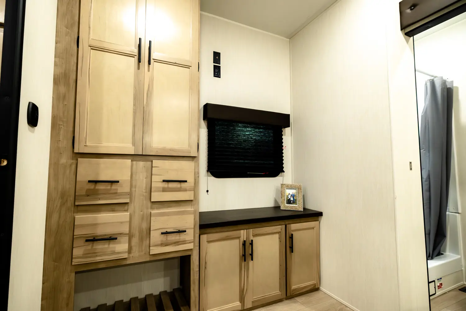 • Cherokee Black Label Timberwolf (Deep Tinted Frameless Automotive Glass Windows, High Gloss Gel Coat Exterior Sidewalls, Multicolor Reading Lights, Pillowtop Mattress Upgrade, Thermo Foil Arctic Insulation, Wall Controlled Power Shades for Living Room and Kitchen)
