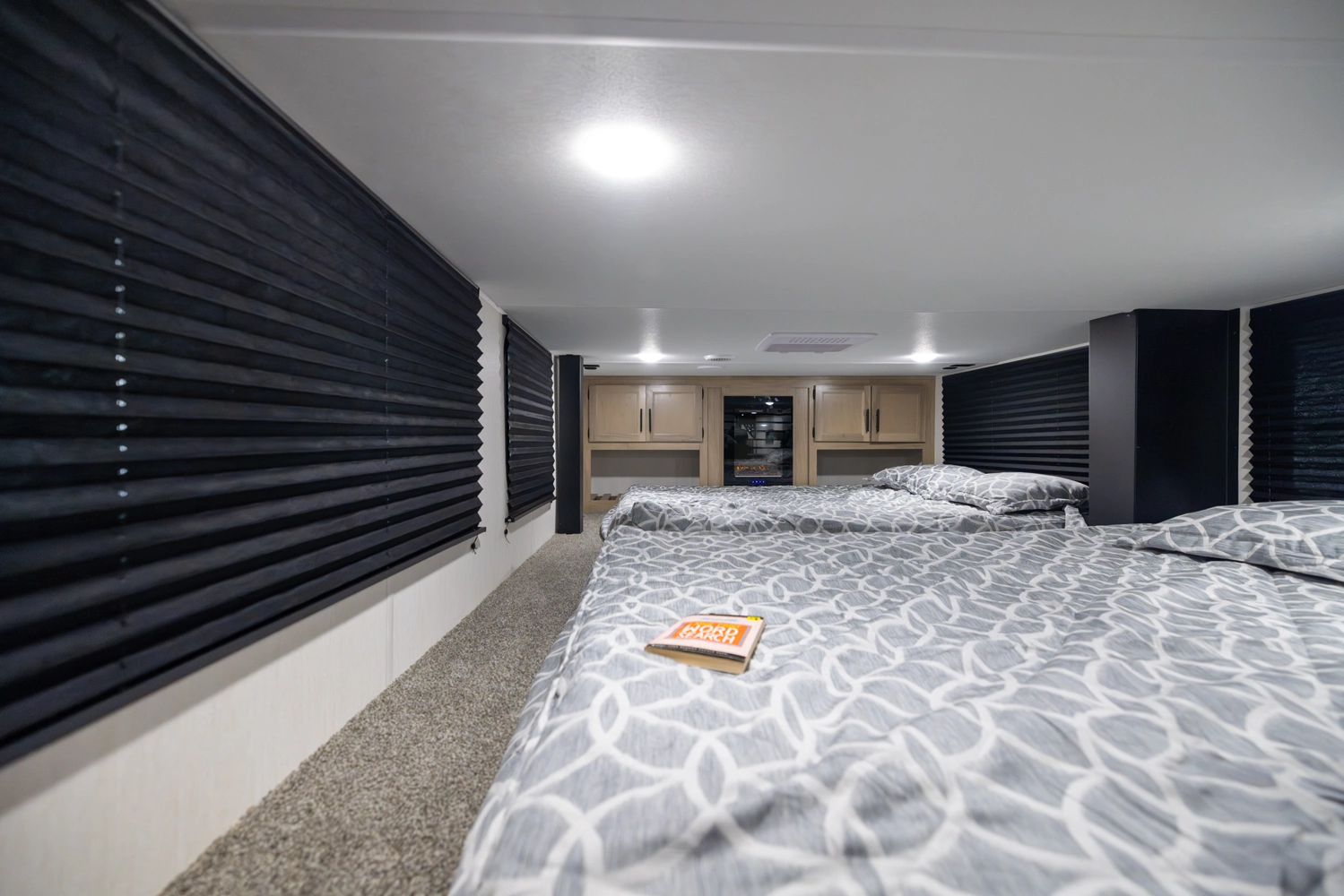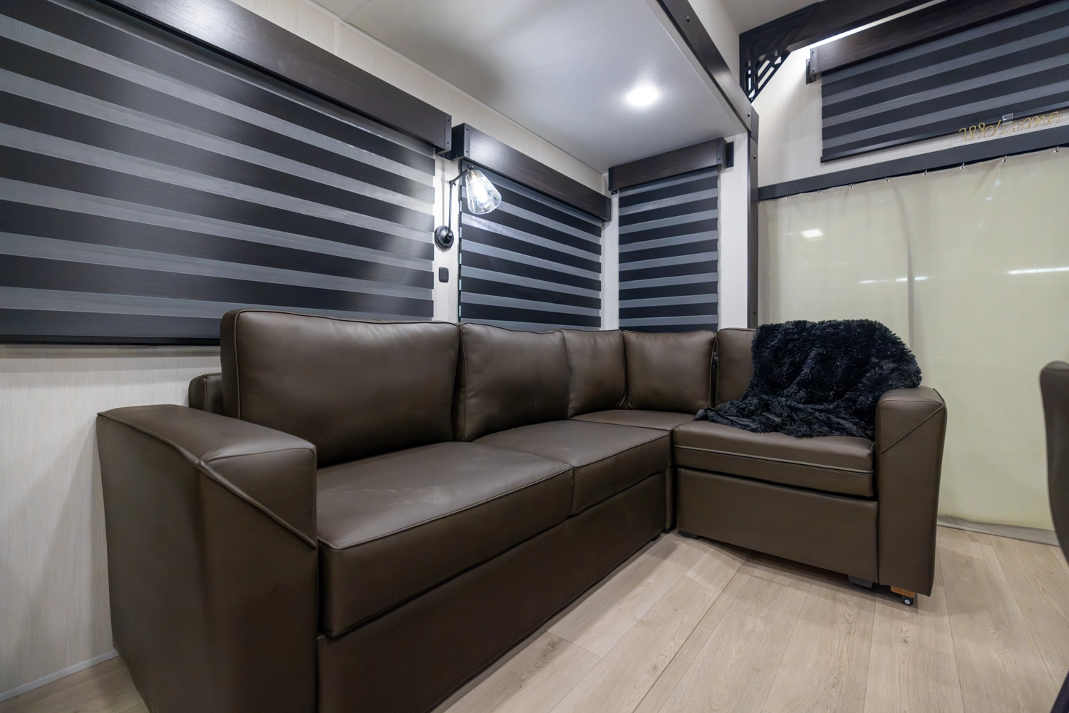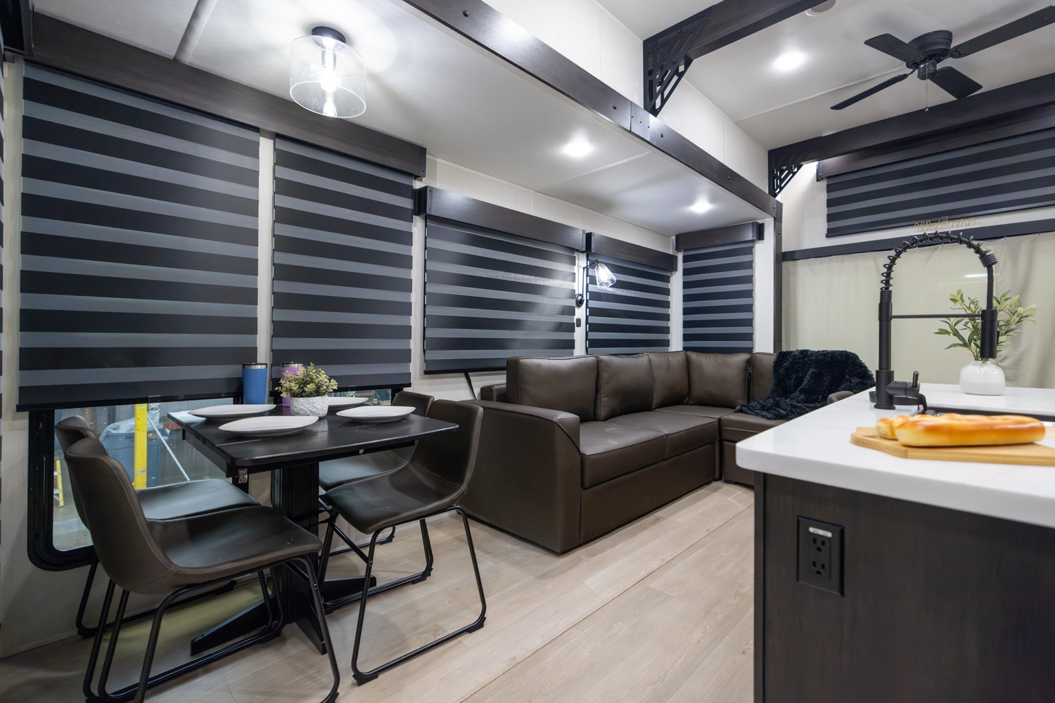 • Cherokee Black Label Timberwolf (Deep Tinted Frameless Automotive Glass Windows, High Gloss Gel Coat Exterior Sidewalls, Multicolor Reading Lights, Pillowtop Mattress Upgrade, Thermo Foil Arctic Insulation, Wall Controlled Power Shades for Living Room and Kitchen)