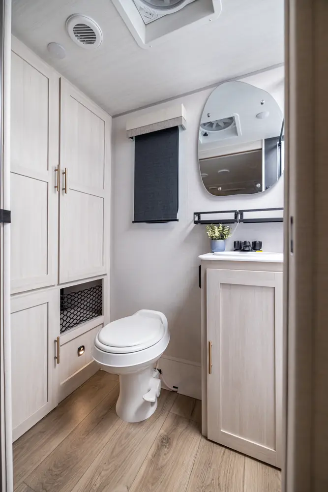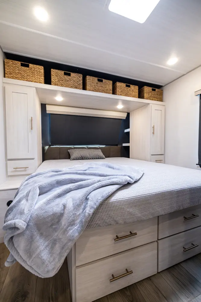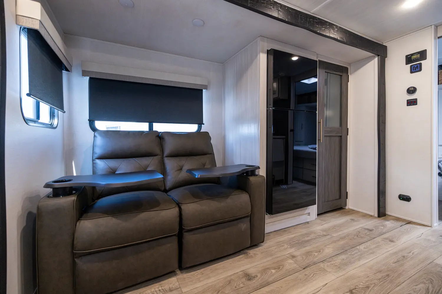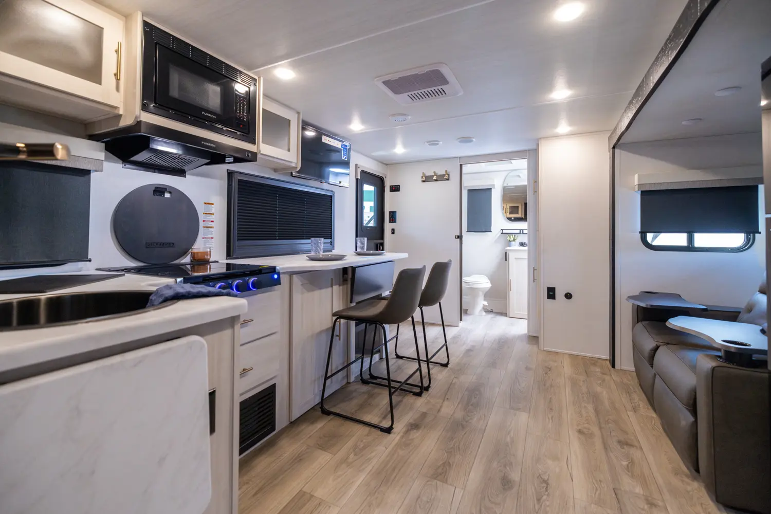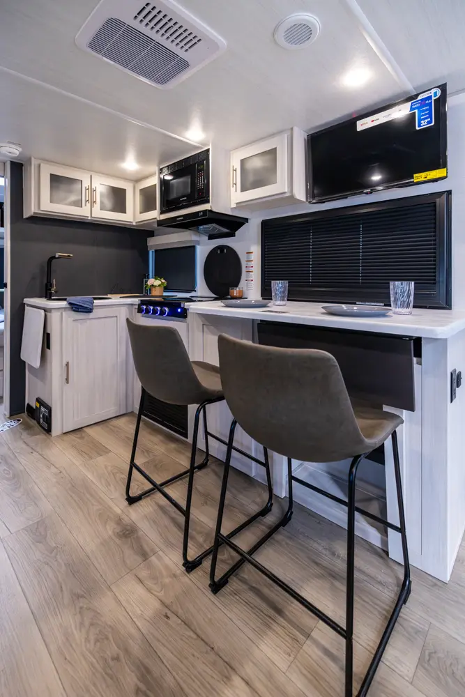 The Un•Mapped 22RB offers a front king bed and full rear bath. The kitchen features a bar top with flip-up window, convection microwave, and 12V refrigerator, plus a bar-to-table conversion for flexible dining. Inside, theater seating provides comfort, while outside, enjoy a TrailGate outdoor bar, 19' power awning, and hot & cold spray port—perfect for compact adventures.