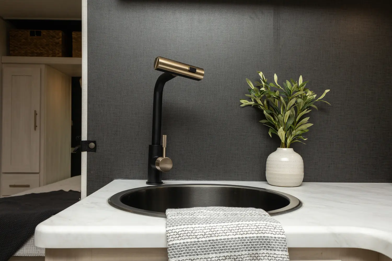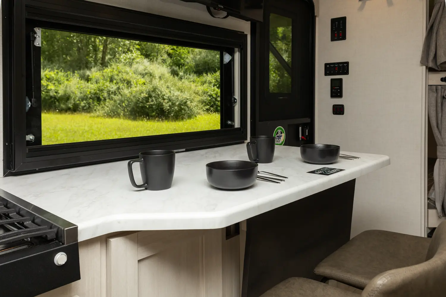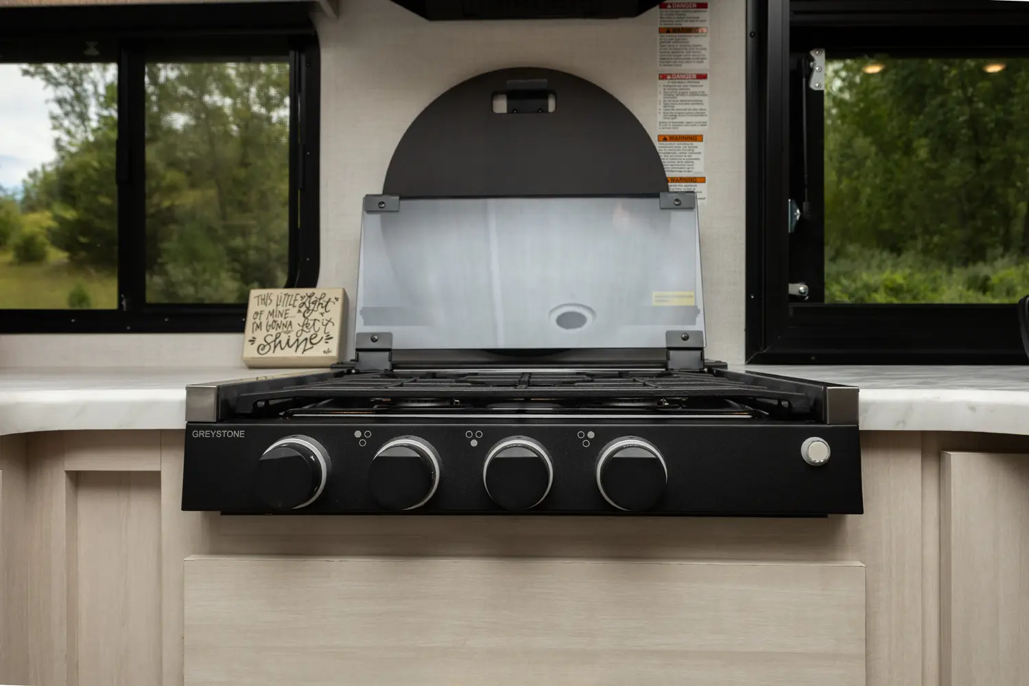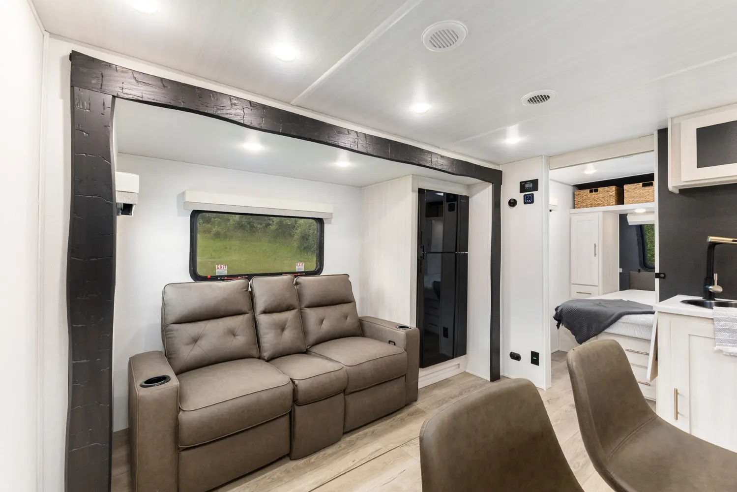 The Un•Mapped 26BH features a rear bunkhouse with double-over-double bunks, accommodating up to four sleepers. The kitchen is equipped with a 12V black glass refrigerator and an air fryer microwave. The Bar2Table pull-out dinette and TrailGate outdoor bar enhance dining flexibility and outdoor entertaining. Inside, enjoy a king bed, 15K A/C, and a tankless on-demand water heater. Exterior amenities include a 21' powered awning and a hot & cold spray port, perfect for compact adventures.