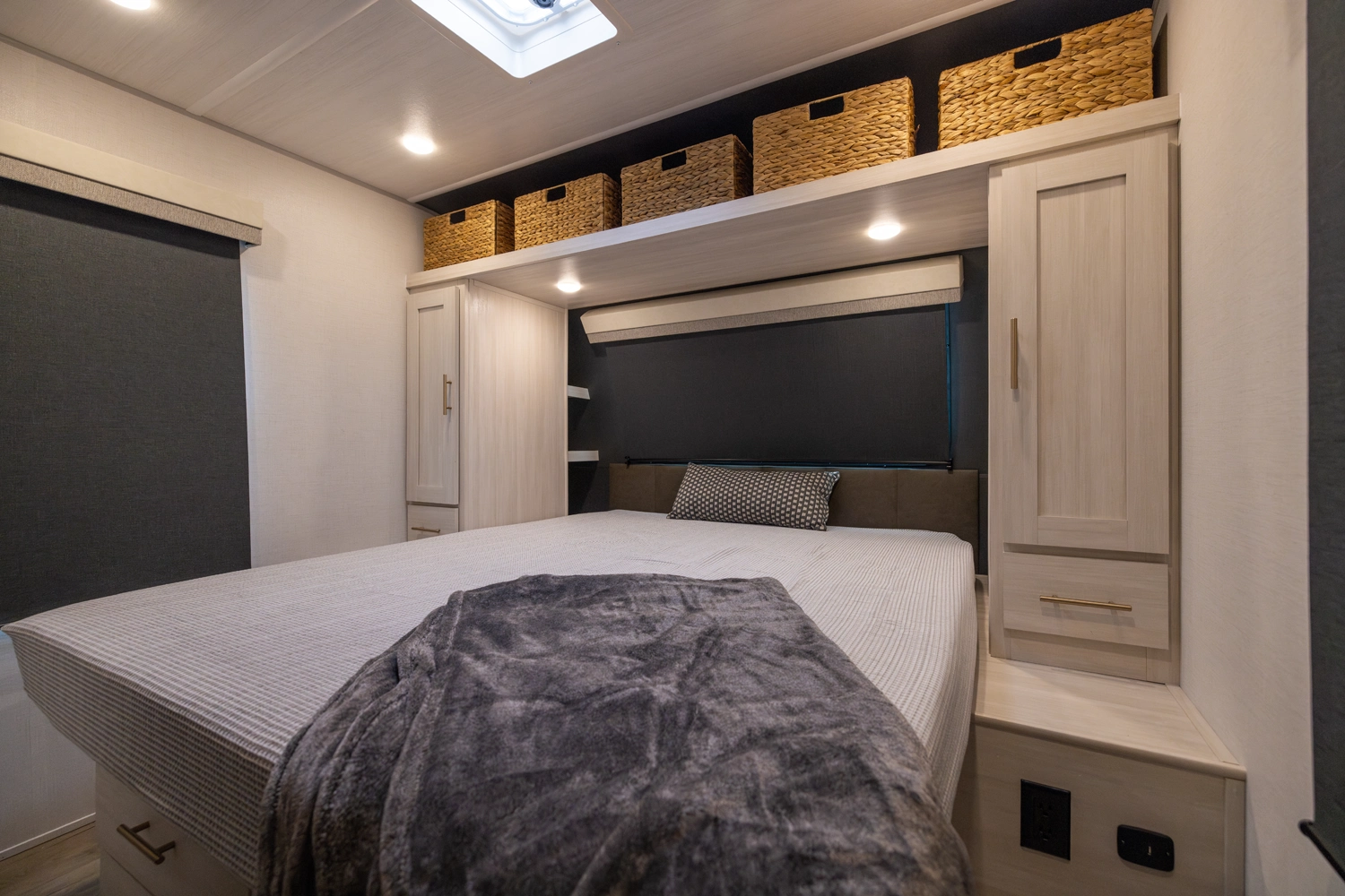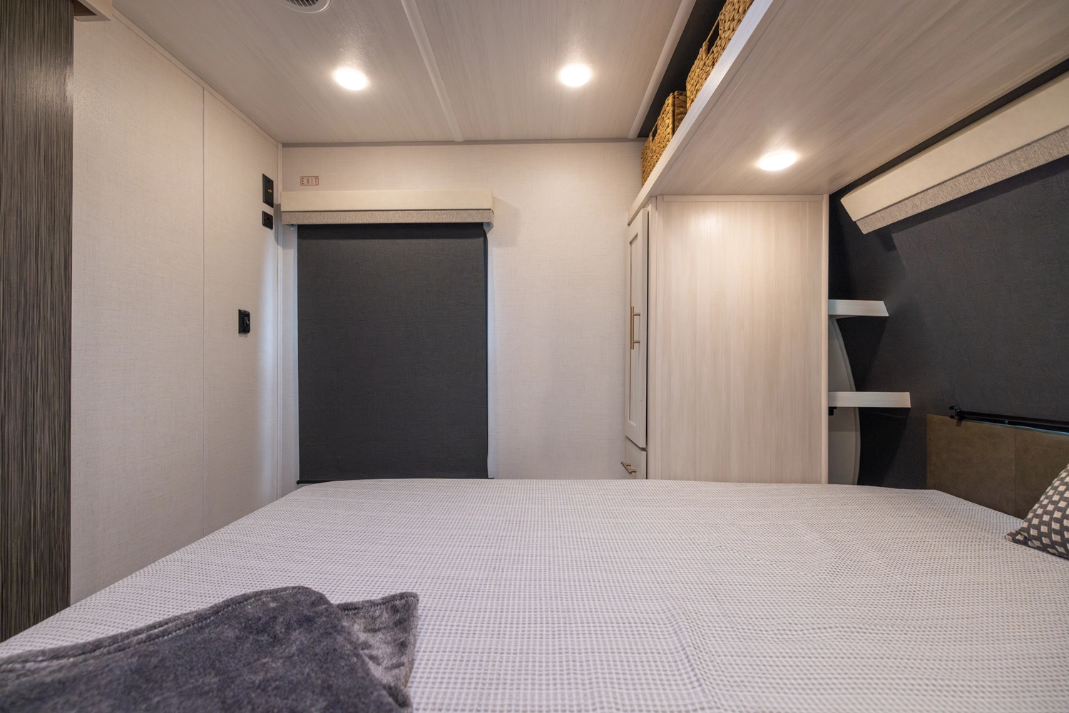 The Un•Mapped 26ML features a 12V black glass refrigerator and an air fryer microwave. The Bar2Table pull-out dinette and TrailGate outdoor bar enhance dining flexibility and outdoor entertaining. Inside, enjoy a private custom king bed, 15K A/C, and a tankless on-demand water heater. Exterior amenities include a 21' powered awning, outdoor camp kitchen, and a hot & cold spray port.