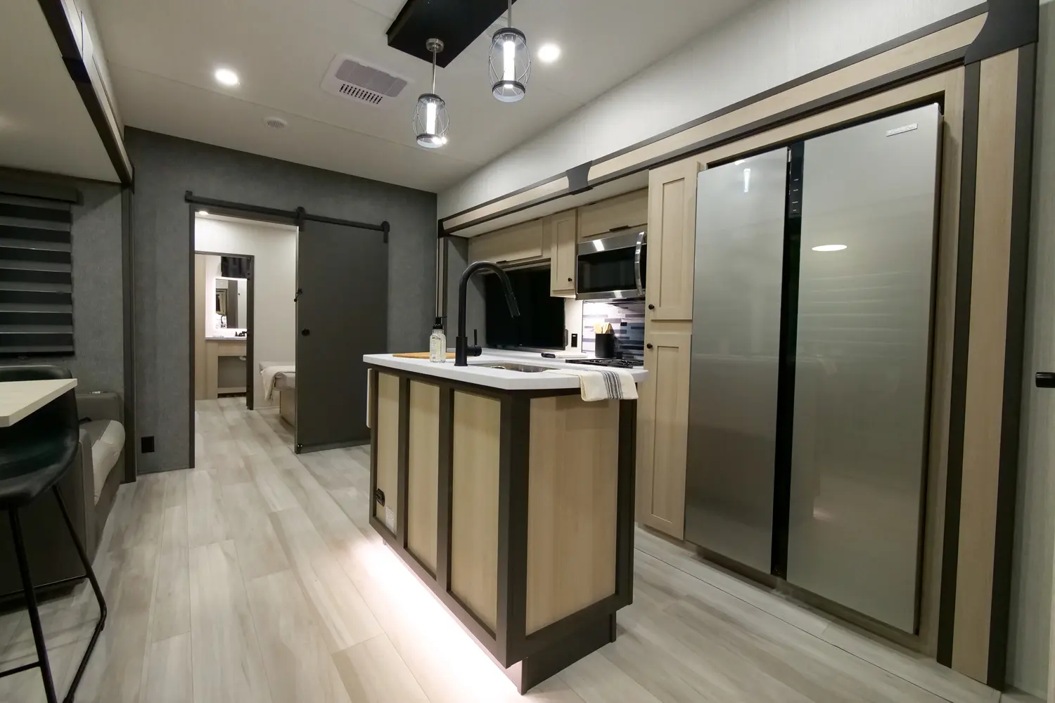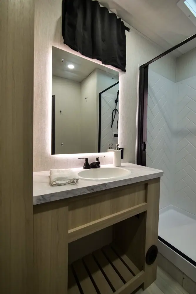 The Wildcat Fifth Wheels 35FUN floorplan has two entries and three slide outs. Exterior features include: fiberglass exterior and 13' & 12' awning. Interiors features include: bunk beds, kitchen island, rear bathroom and two full bathrooms.