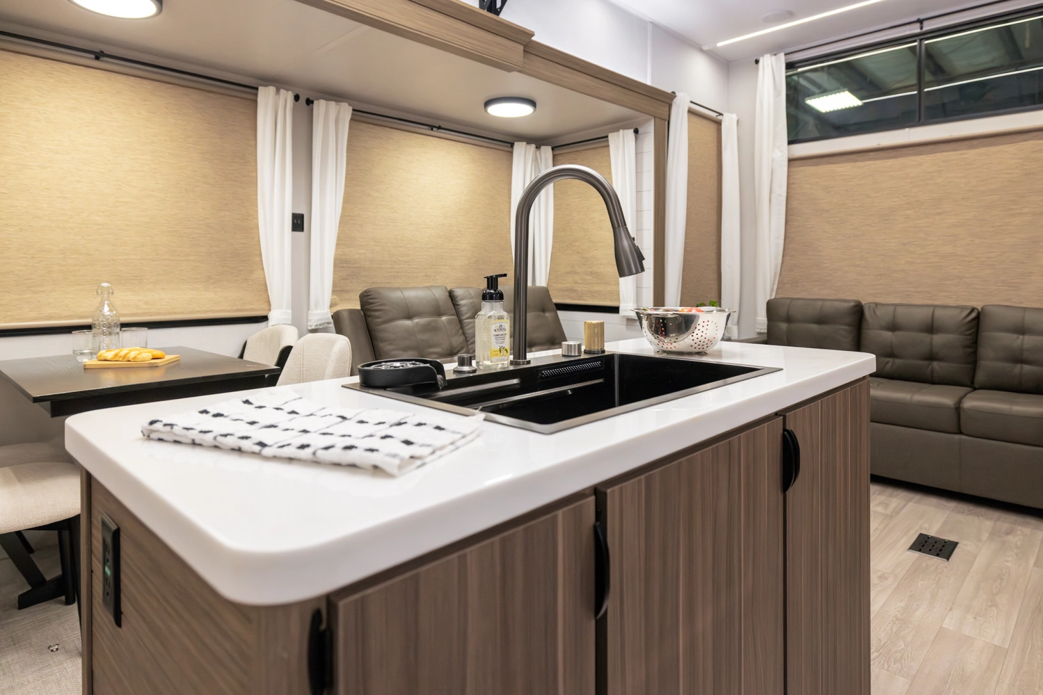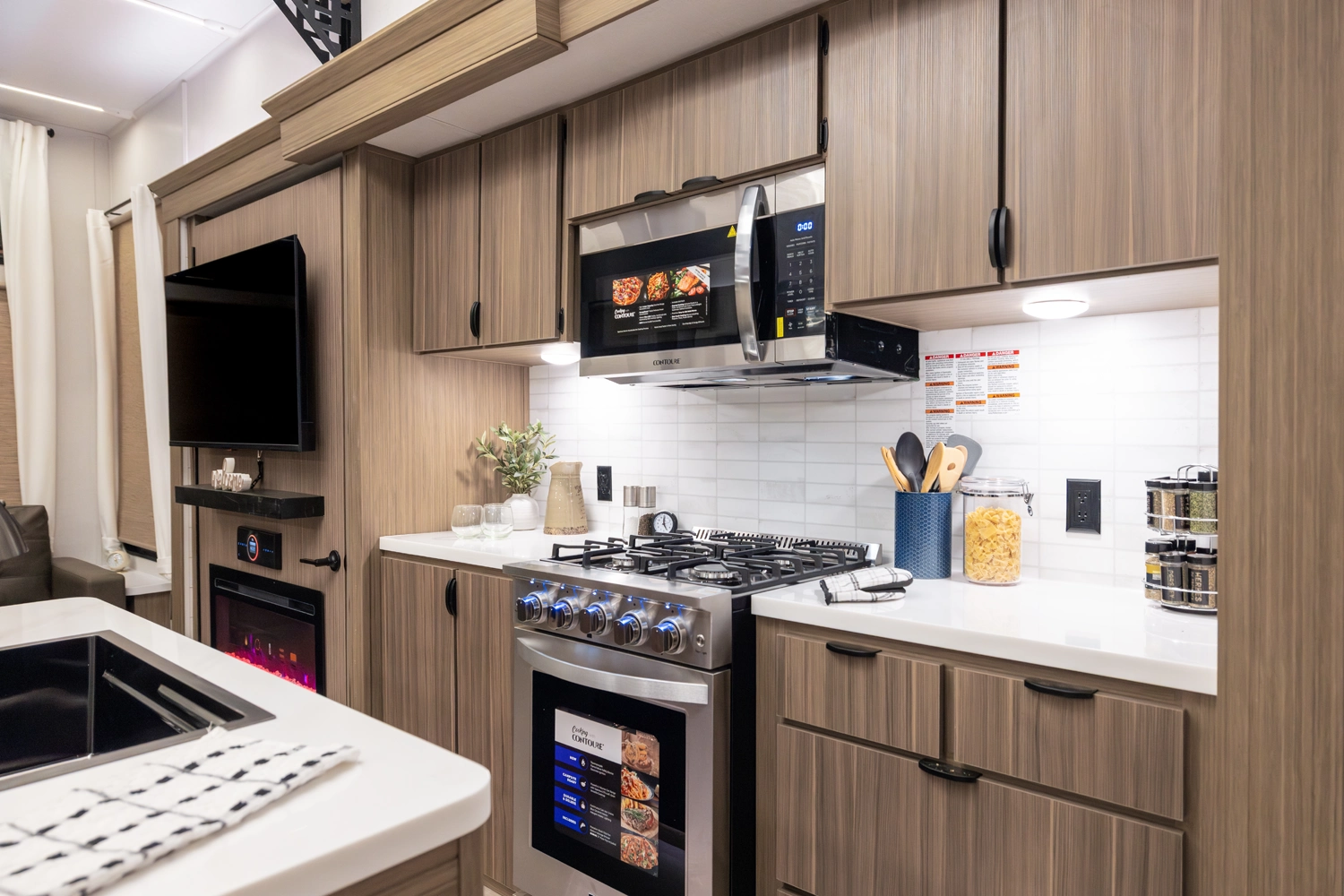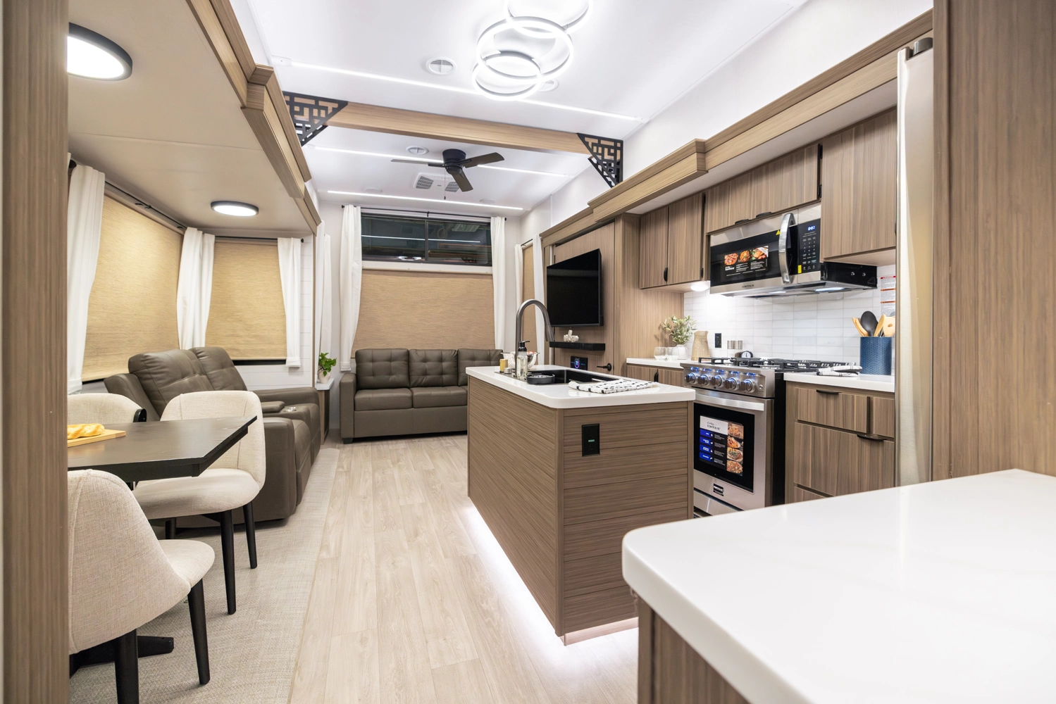 The Wildwood Grand Lodge 42DL is another fantastic double loft destination trailer. In addition to the HUGE double loft bonus room for the kids, there is a front queen bedroom for the adults, plus additional sleep options in the living room. The bathroom includes a walk-in shower with a built-in seat, while the island kitchen provides residential appliances and plenty of room for all the cooking essentials.
