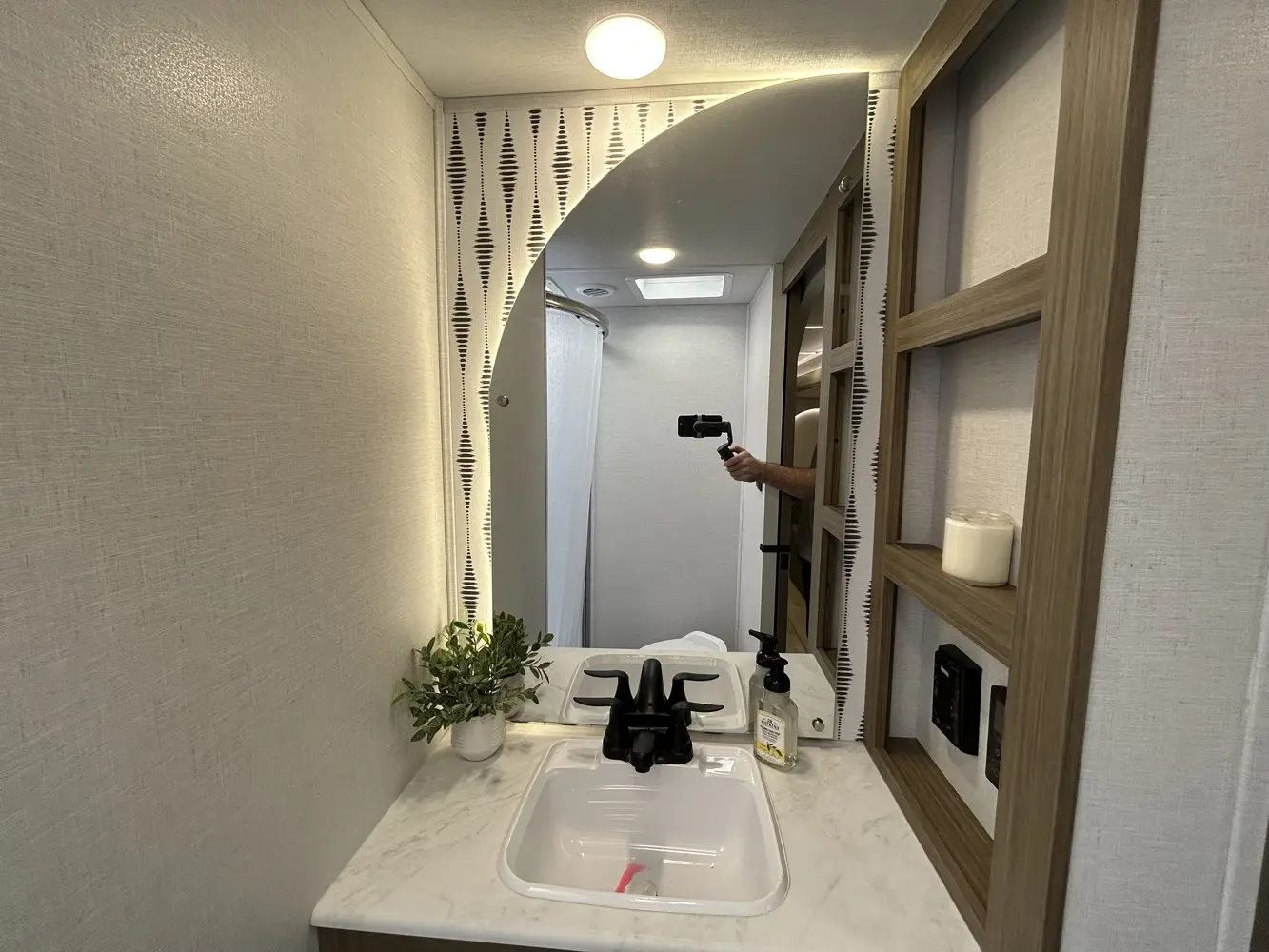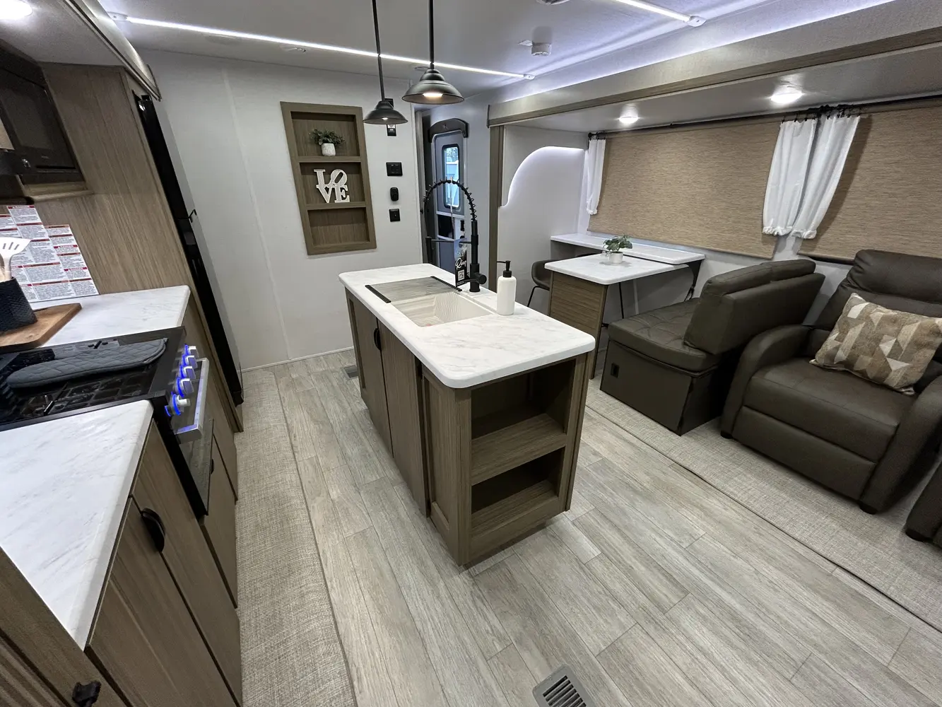 The Wildwood 27RE gives you a spacious living room area thanks to two slideouts. The island kitchen is well equipped with a stove top, oven, residential refrigerator, and pantry. The bathroom features a walk-in shower, plus a skylight and linen cabinet, while the front bedroom includes a walk-in closet.