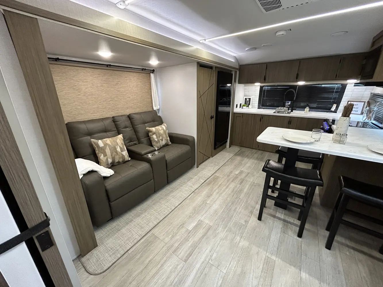 The Wildwood 28FKG floorplan has two entries and two slide outs. Exterior features include: fiberglass exterior, 20' awning and outside kitchen. Interiors features include: front kitchen and rear bathroom.