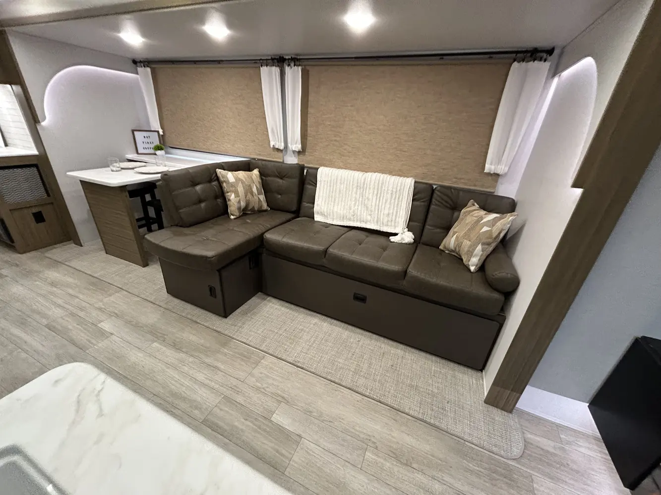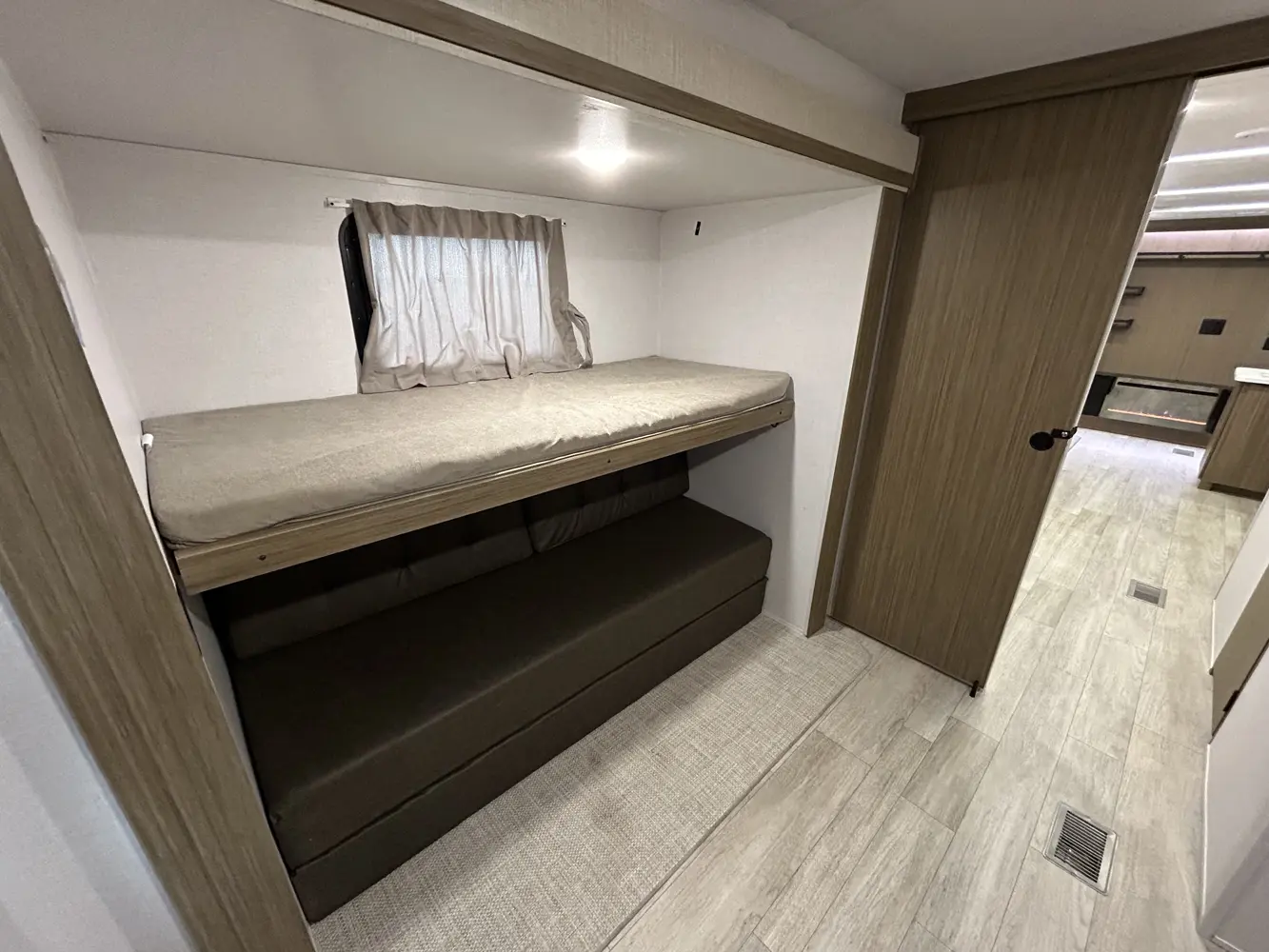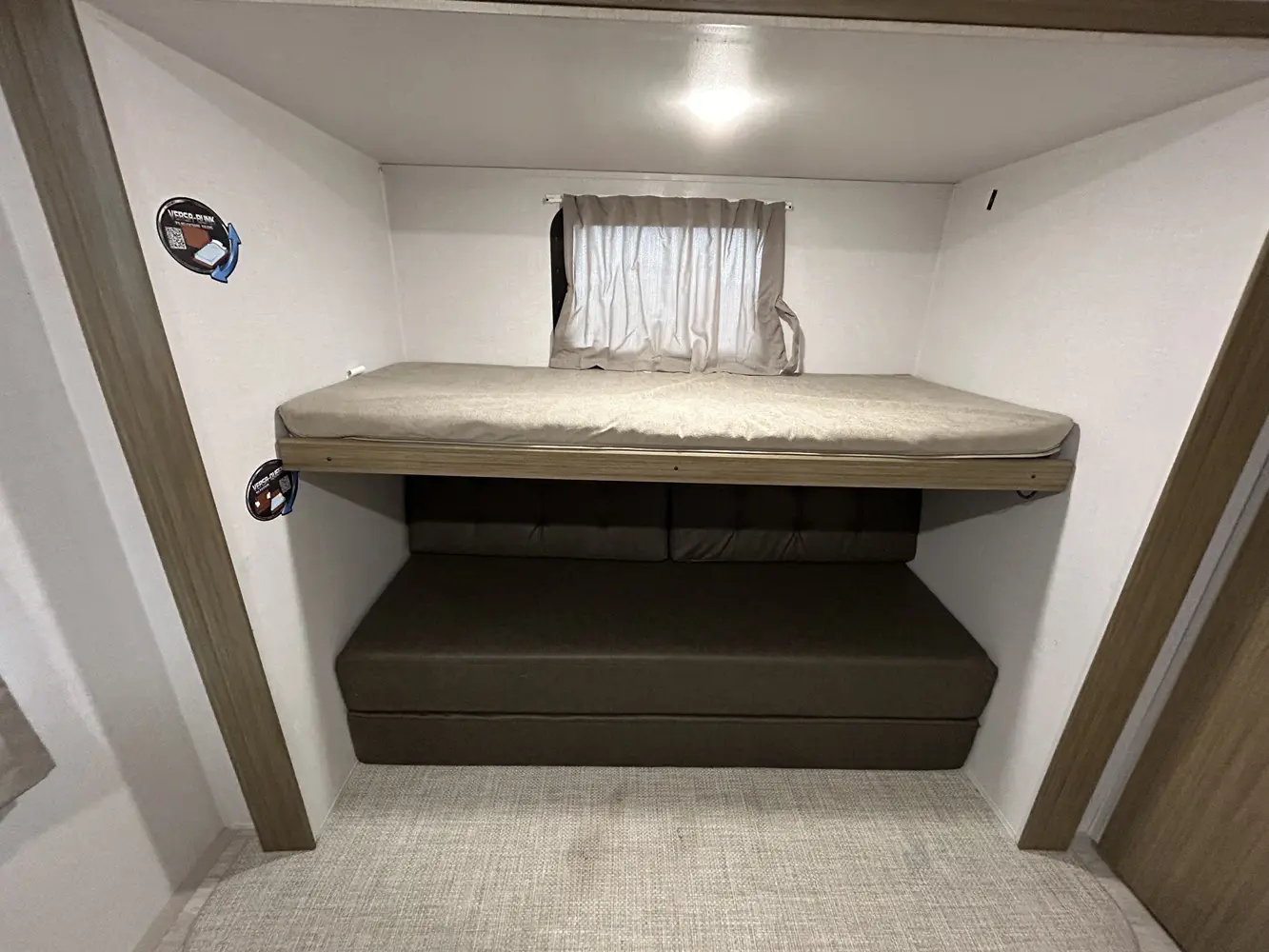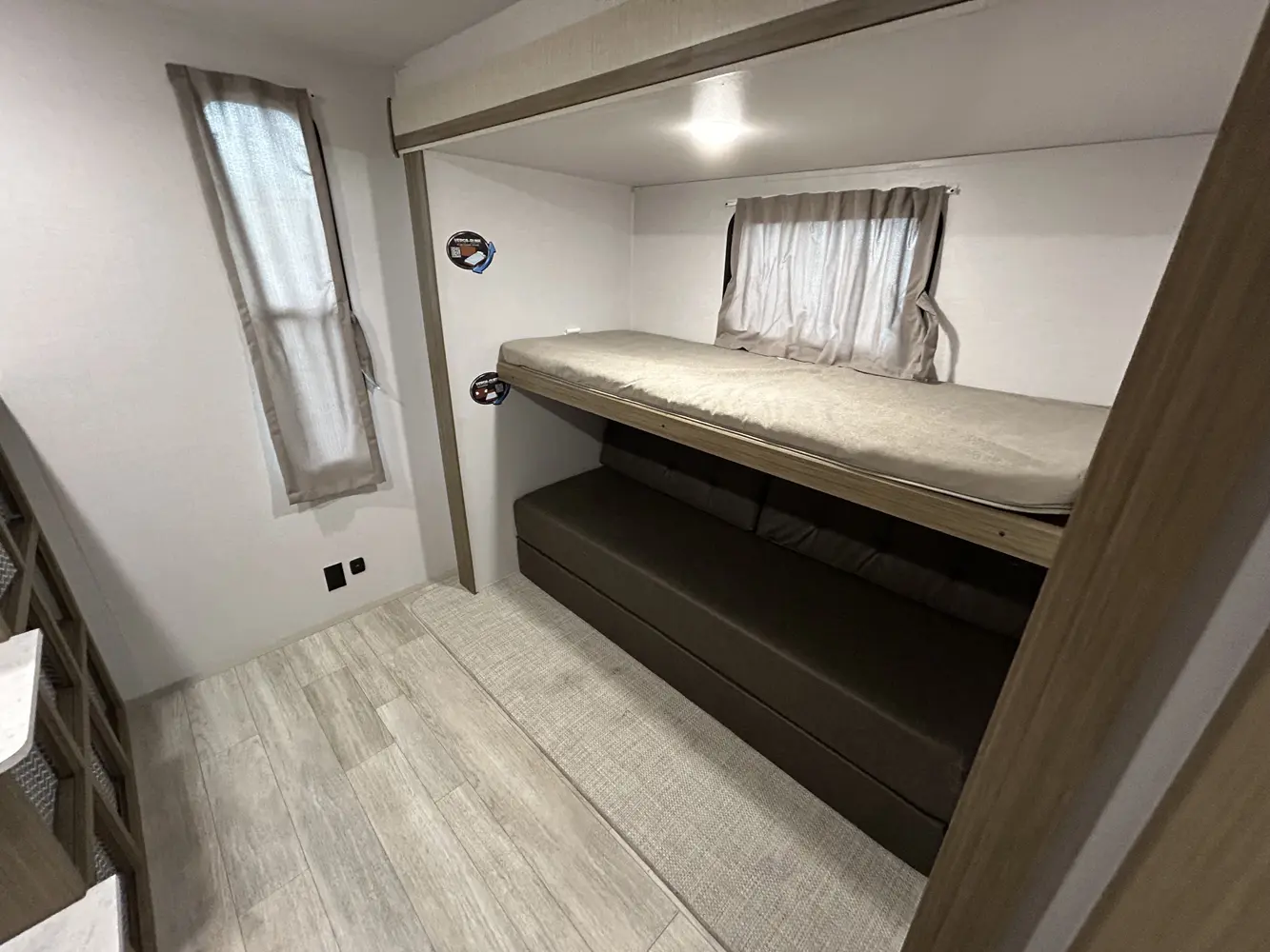 The 32BHDS is the ultimate bunkhouse, with two total slide outs and an outside kitchen. This well-equipped travel trailer features oversized panoramic windows, the ever-popular U-dinette, which you can customize with the adjacent Versa-Lounge. The kitchen includes a 11 CU. FT. refrigerator and stovetop with oven and LED accents, plus cabinets for all your cooking essentials!