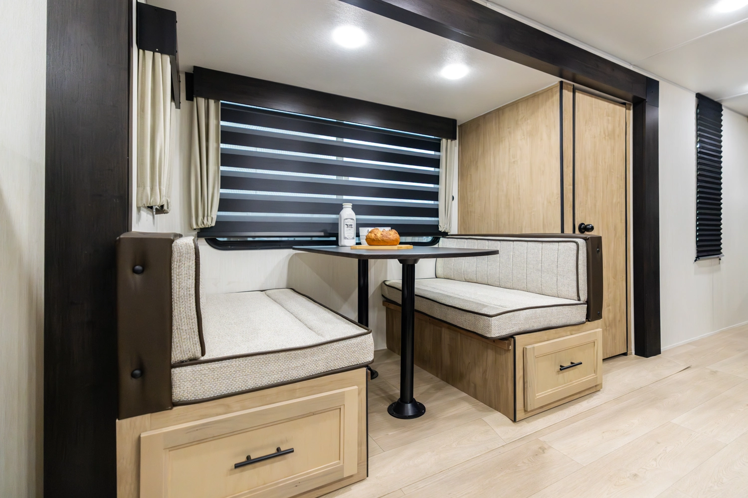 • Cherokee Black Label Wolf Den (Deep Tinted Frameless Automotive Glass Windows, High Gloss Gel Coat Exterior Sidewalls, Multicolor Reading Lights, Pillowtop Mattress Upgrade, Solid Surface Countertops, Thermo Foil Arctic Insulation)