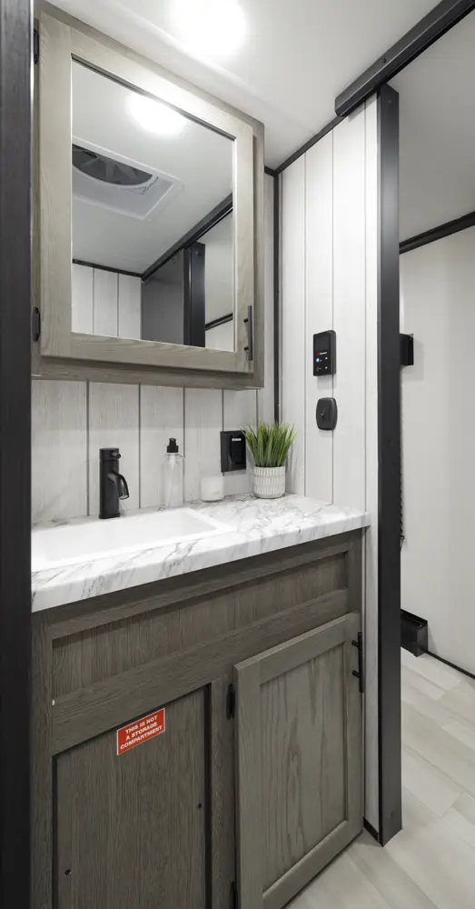 The Wolf Pack 350PACK15 Toy Hauler 5th Wheel by Forest River combines versatility and comfort. Its 15-foot garage doubles as an extra bedroom and features a sliding glass door for a bright, open feel. The kitchen and living area offer hidden pantry storage behind the entertainment center, cozy theater seating, and a dinette that converts into a bed. The primary bedroom boasts a king-size bed with no slide-out for reduced hitch weight, making this model perfect for adventurous families.