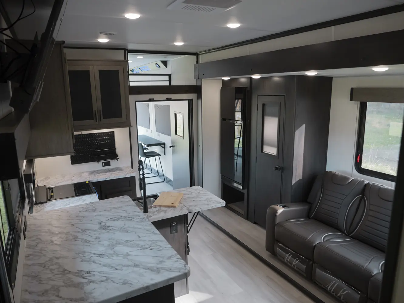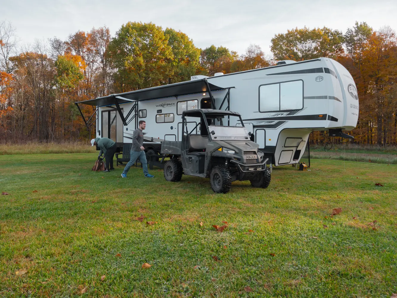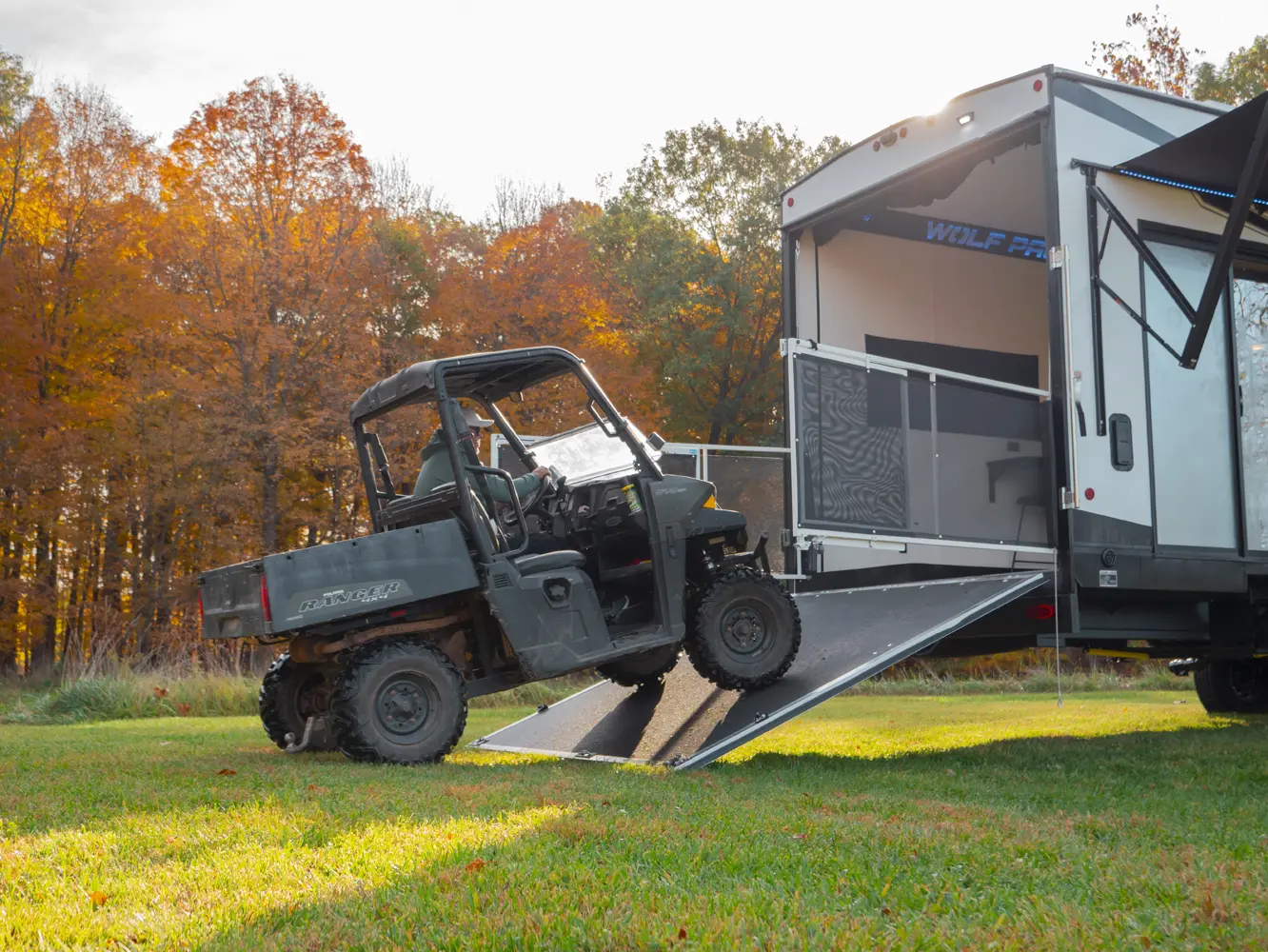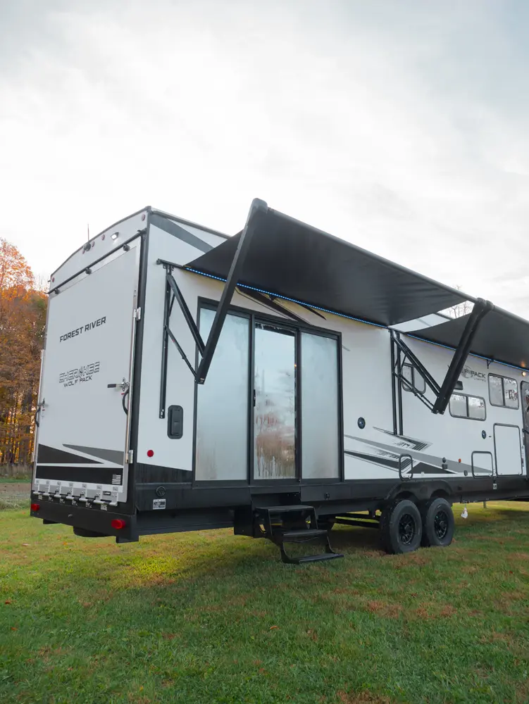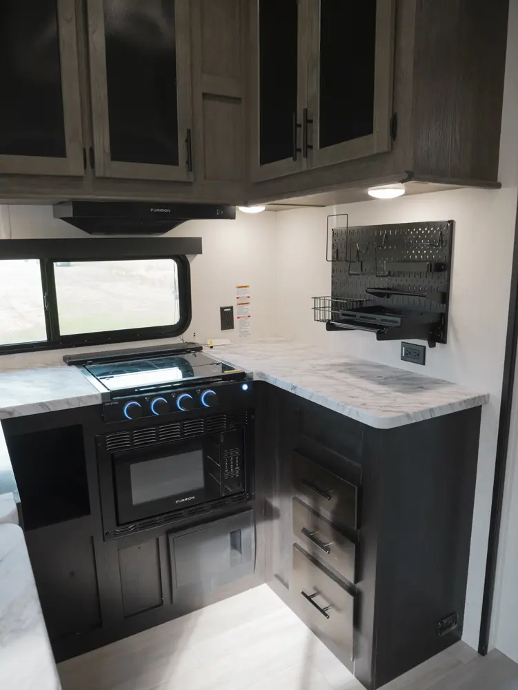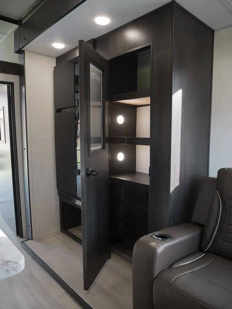 Experience the ultimate in versatility and luxury with the Wolf Pack 360PACK15.5 Toy Hauler 5th Wheel by Forest River. This model boasts an expansive 15.5-foot garage, perfect for hauling your favorite toys, and features Wolf Pack's signature sliding glass door with oversized windows for natural light and outdoor views. The thoughtfully designed living area includes bar-top seating, a spacious kitchen with a flip-up counter extension for added prep space, and a generously sized pantry.