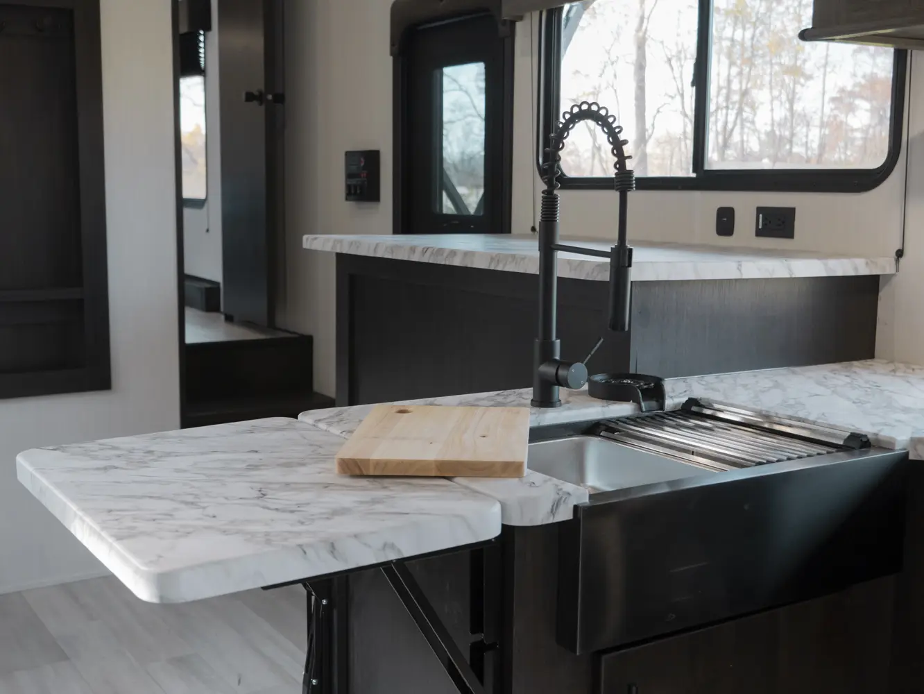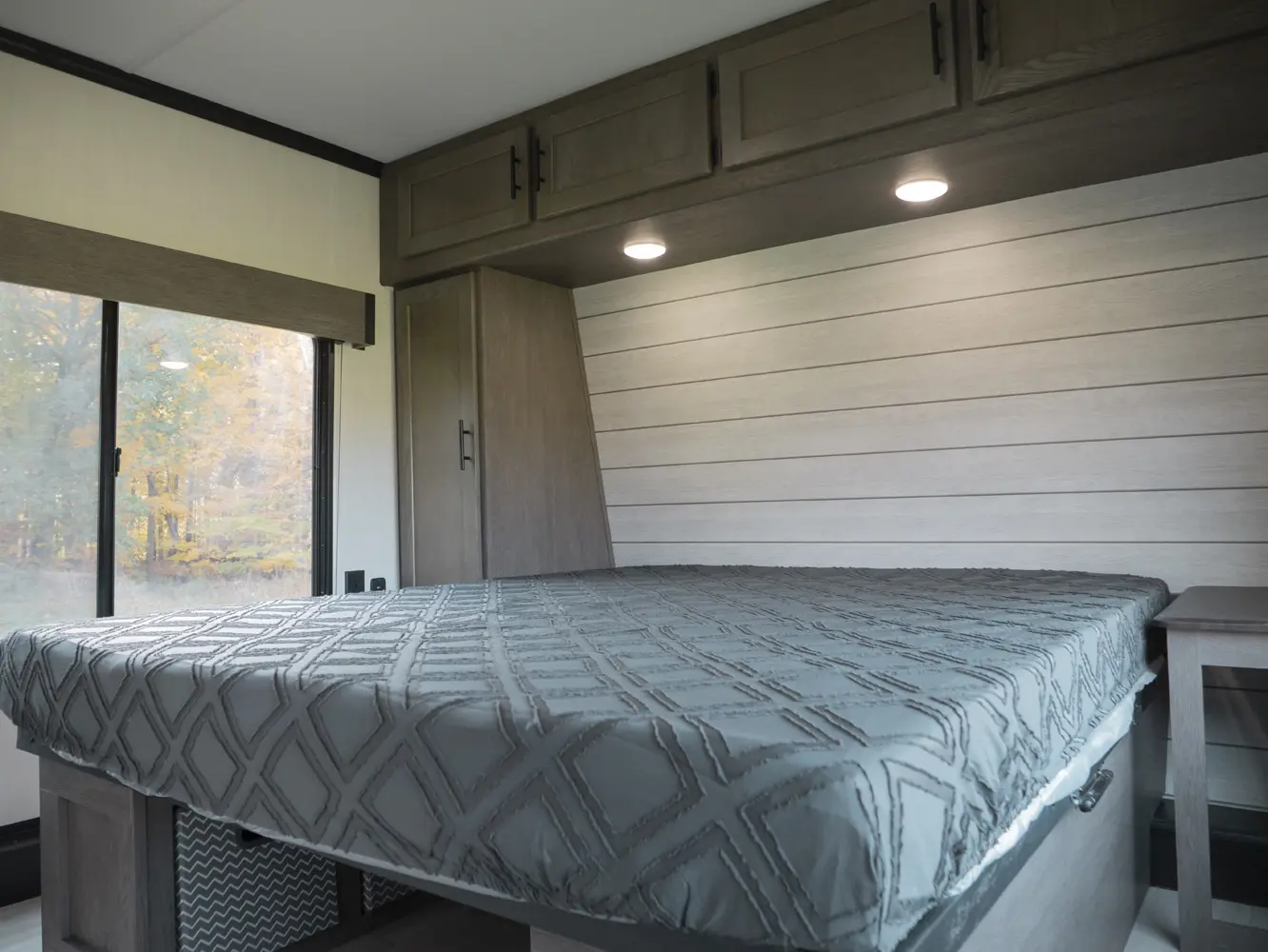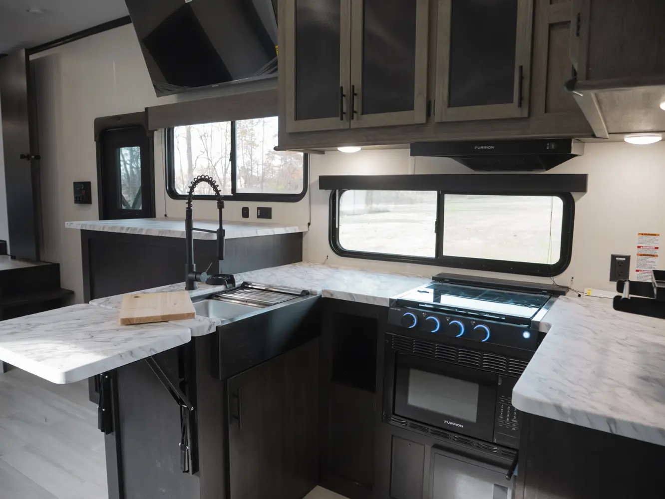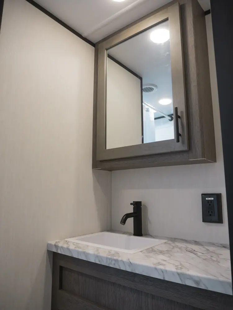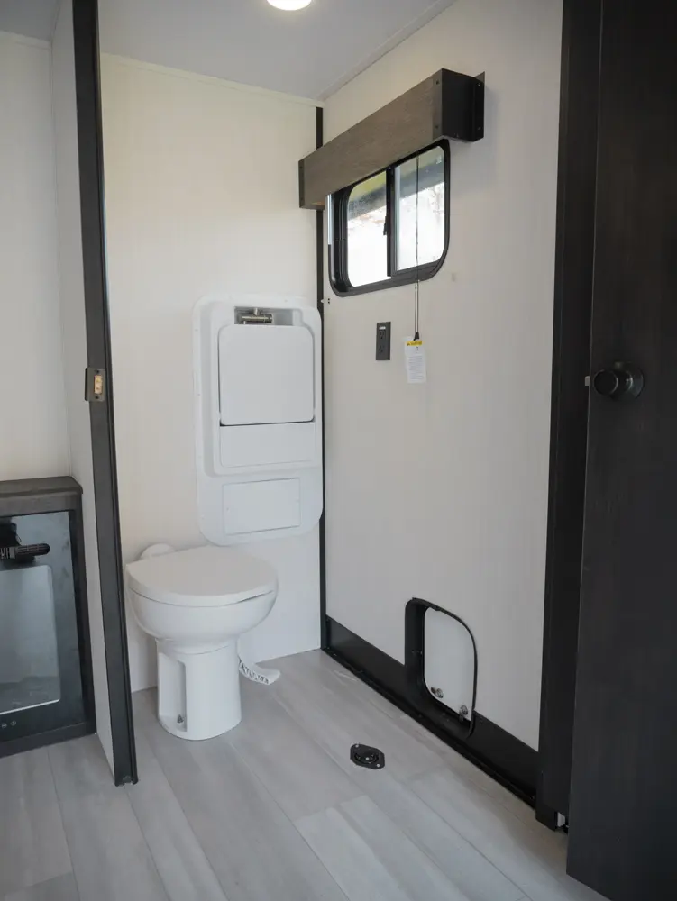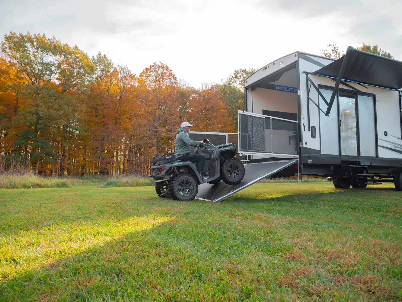 Experience the ultimate in versatility and luxury with the Wolf Pack 360PACK15.5 Toy Hauler 5th Wheel by Forest River. This model boasts an expansive 15.5-foot garage, perfect for hauling your favorite toys, and features Wolf Pack's signature sliding glass door with oversized windows for natural light and outdoor views. The thoughtfully designed living area includes bar-top seating, a spacious kitchen with a flip-up counter extension for added prep space, and a generously sized pantry.