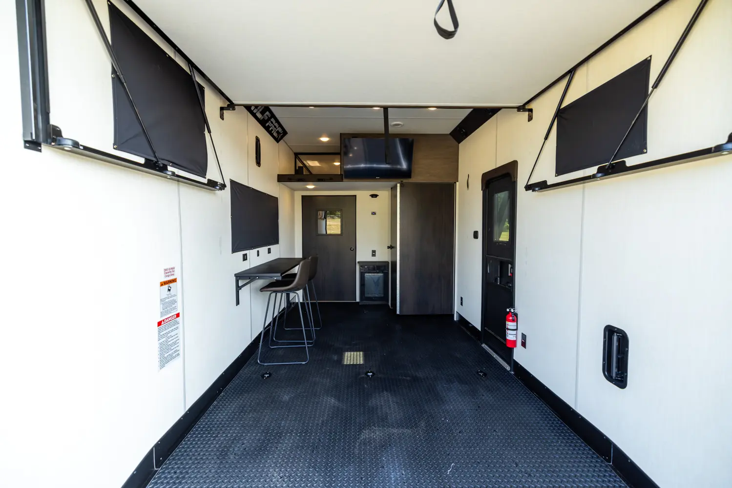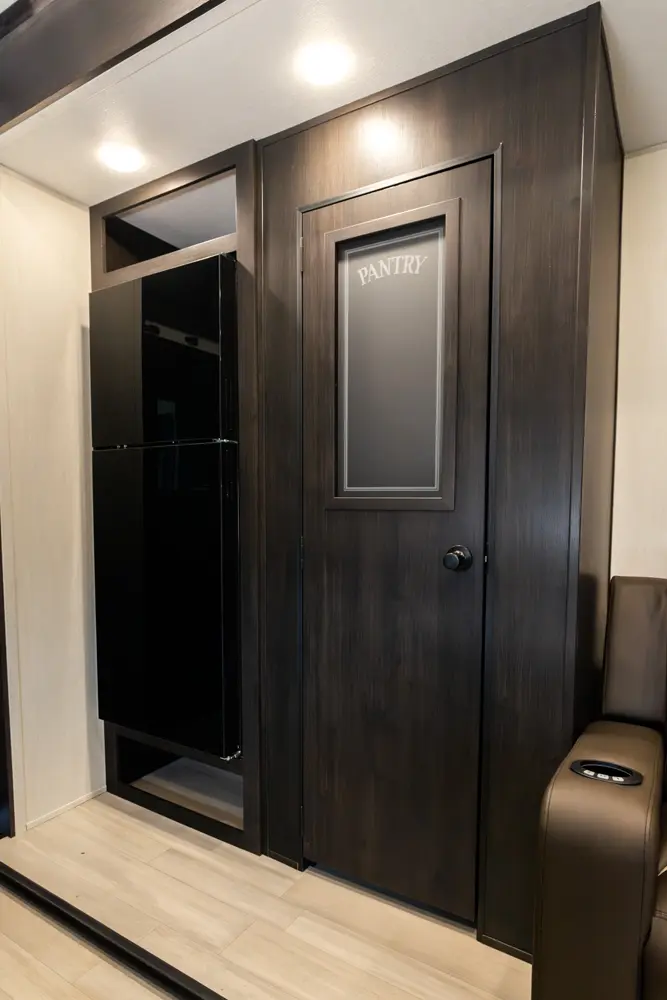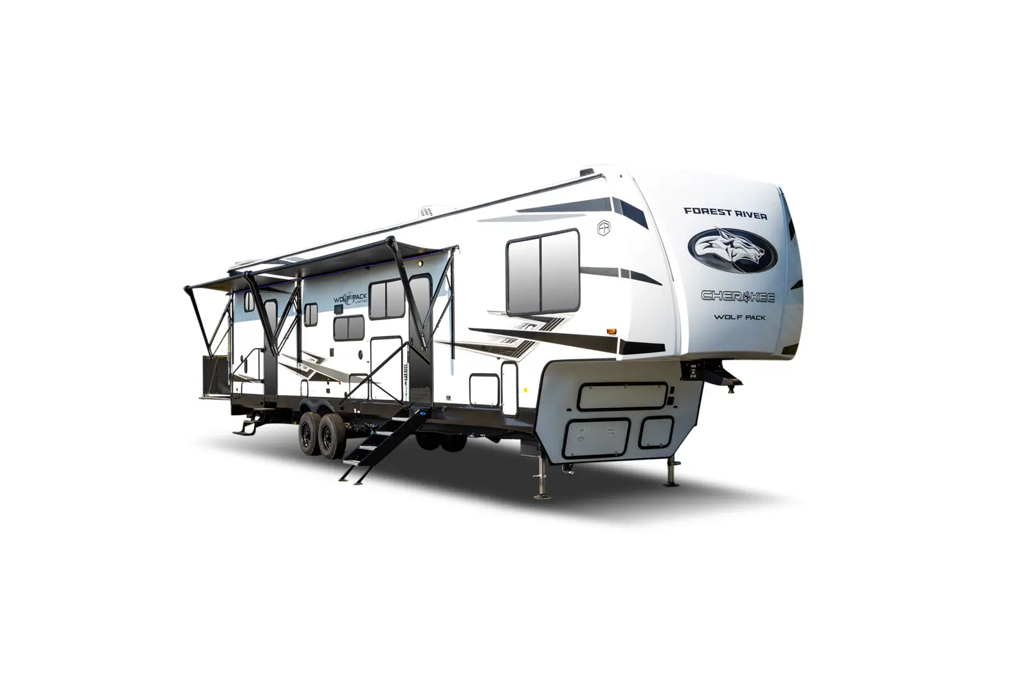 Experience the ultimate in versatility and luxury with the Wolf Pack 360PACK15.5 Toy Hauler 5th Wheel by Forest River. This model boasts an expansive 15.5-foot garage, perfect for hauling your favorite toys, and features Wolf Pack's signature sliding glass door with oversized windows for natural light and outdoor views. The thoughtfully designed living area includes bar-top seating, a spacious kitchen with a flip-up counter extension for added prep space, and a generously sized pantry.