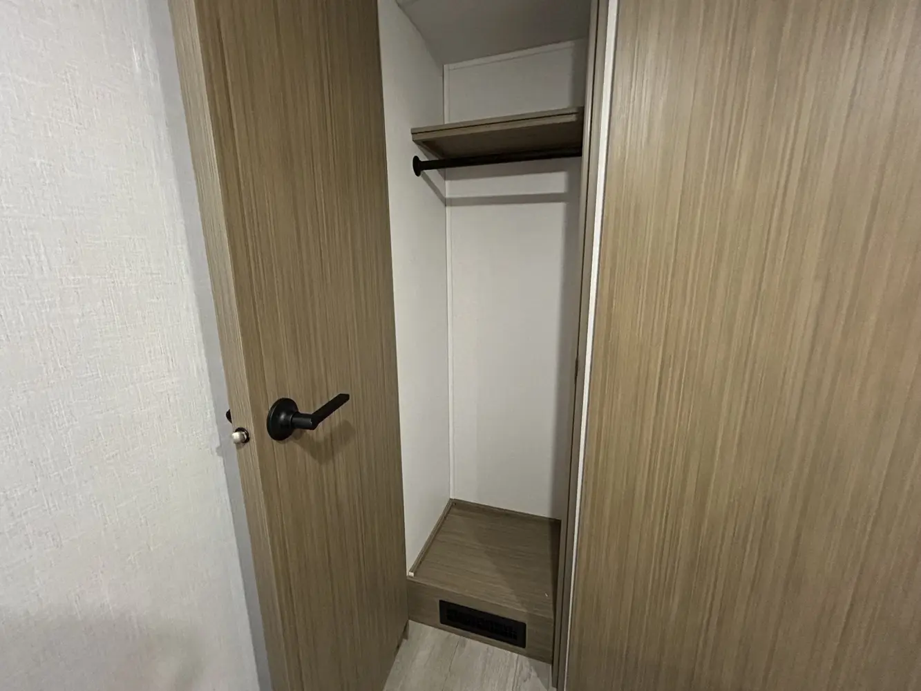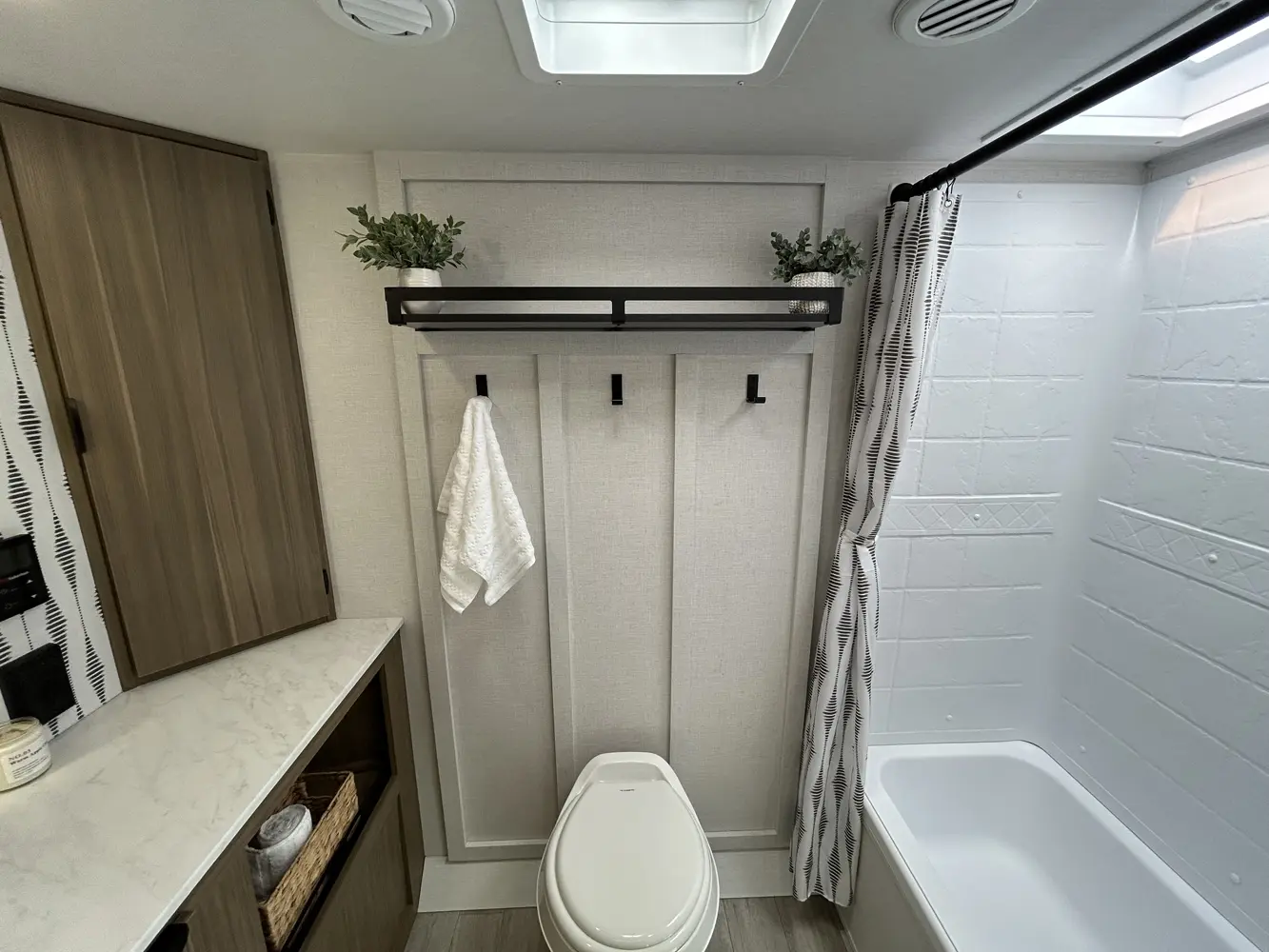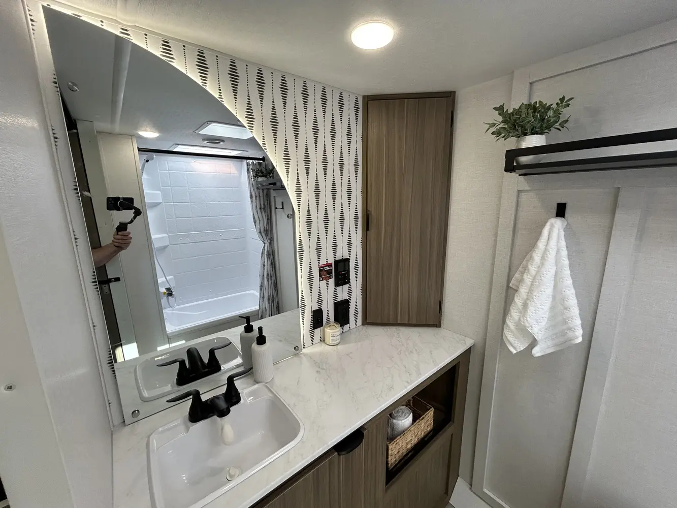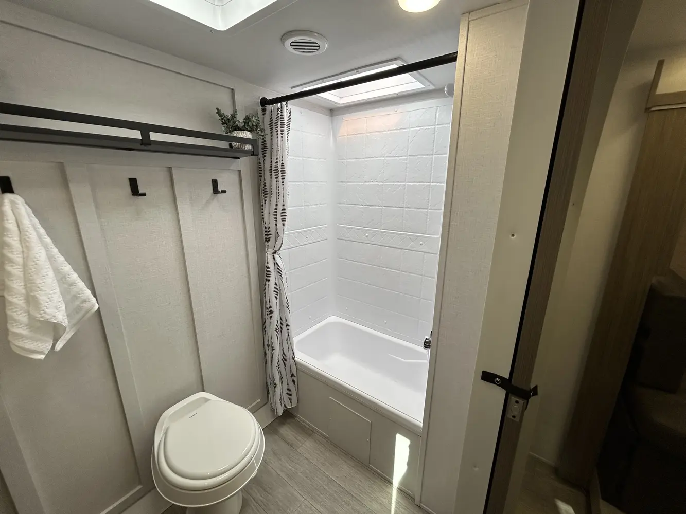 The X-Lite 25ICE floorplan has one entry and one slide out. Exterior features include: metal exterior and 16' awning. Interiors features include: front bedroom and rear bathroom.