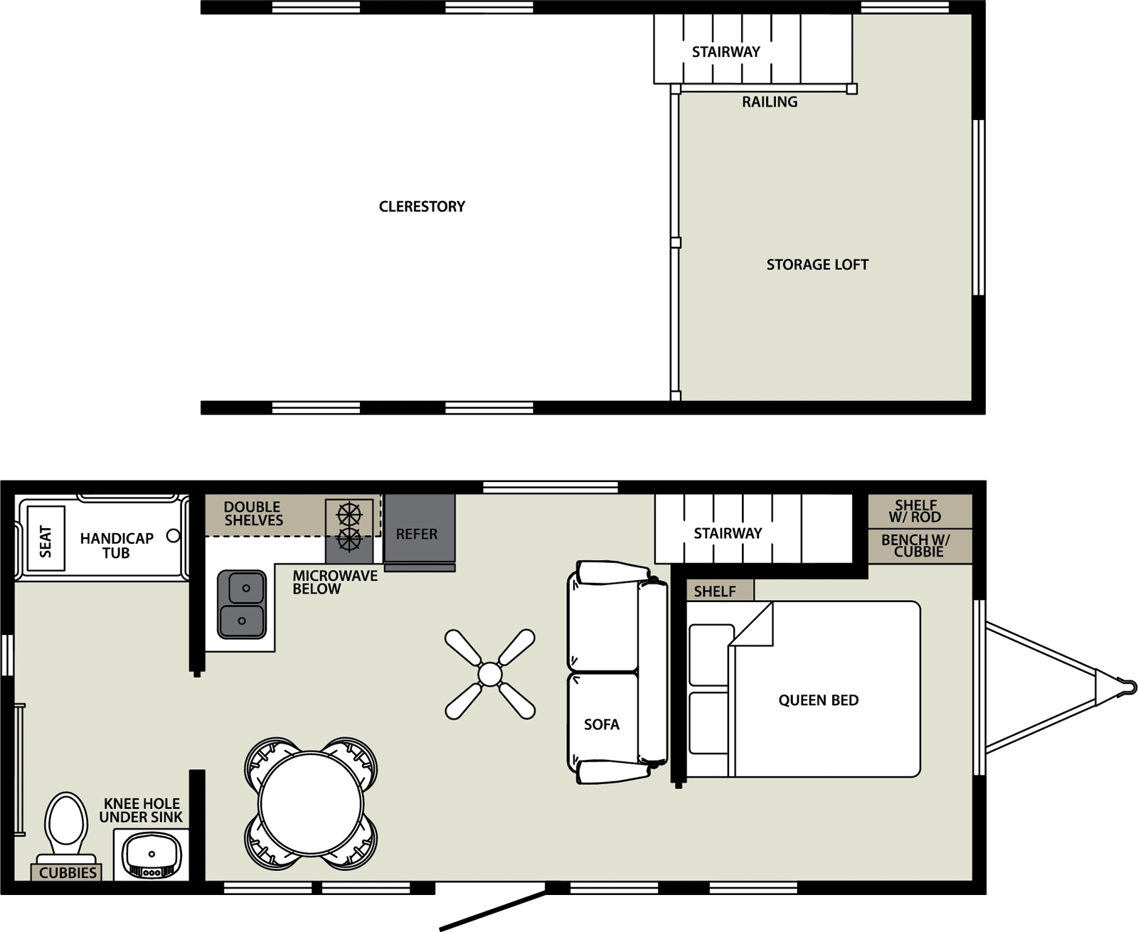 This loft model’s 336 sq ft footprint delivers cozy vertical space for an open feel. A full bath and elevated sleeping area free up living room below for relaxing, making it a great pick for those who value a compact but thoughtfully designed park model.