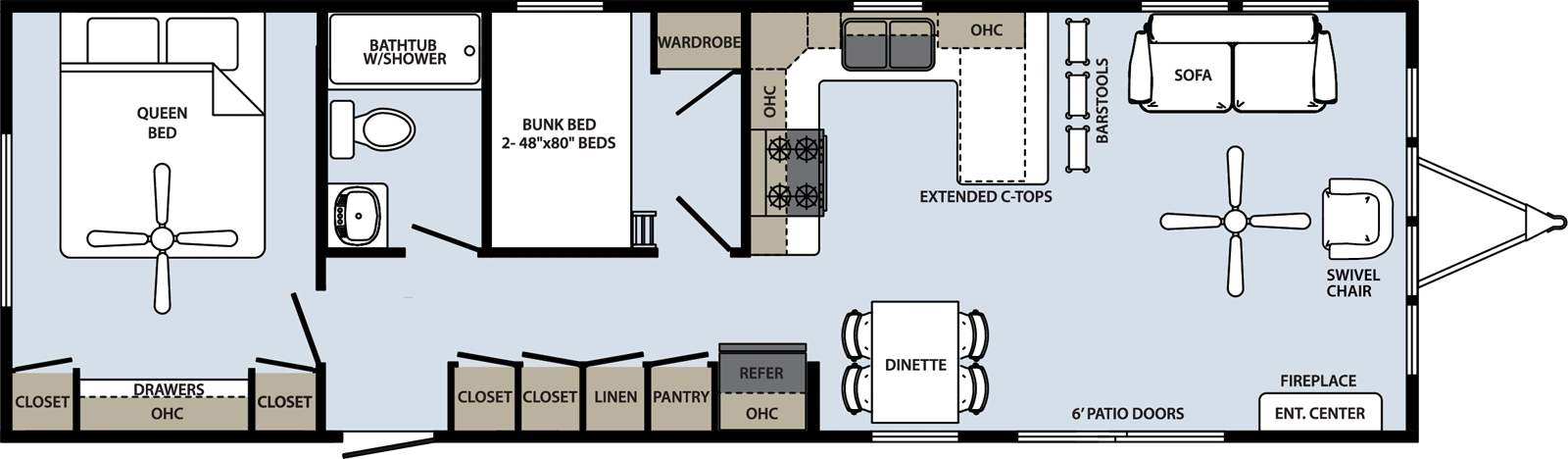 The Summit 45-2B-C-S delivers 533 sq ft with two separate bedrooms and a bath. Its split-room design provides privacy and thoughtful use of space. Quality materials and a tough frame make it a reliable and comfortable park model.