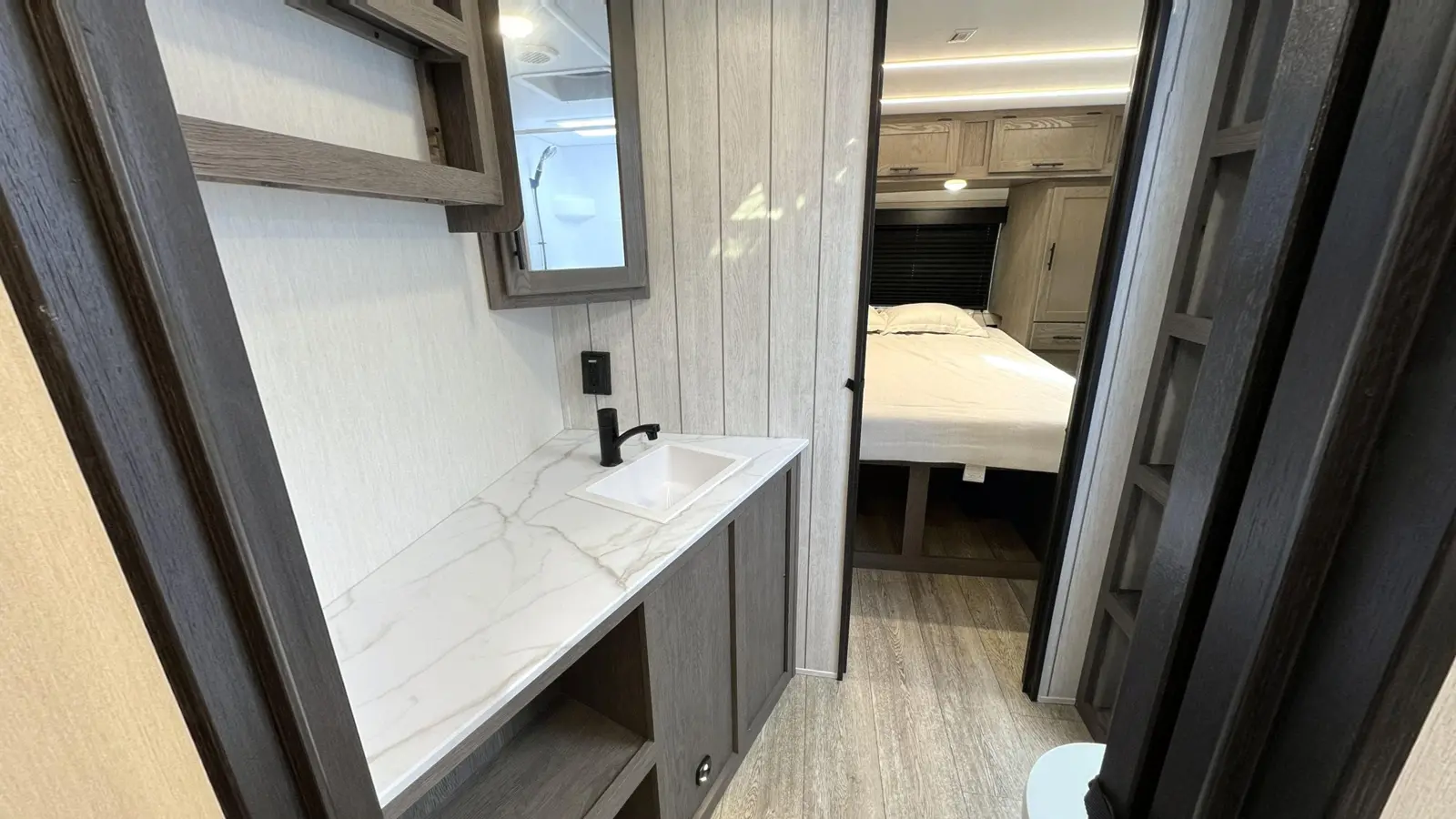 The Alpha Wolf 23LDE by Forest River is both compact and lightweight coming in at 28ft 6in and 5,850lbs unloaded! Our rear kitchen offers plenty of countertop space, a farm style sink, 12-volt refrigerator, microwave, oven and an abundance of dry good storage. The living room is intelligently designed with the tri-fold sleeper sofa placed directly across from the TV overhead the U-shape dinette that also doubles as an extra bed. Up front is a full bathroom, queen size bed and two wardrobes.