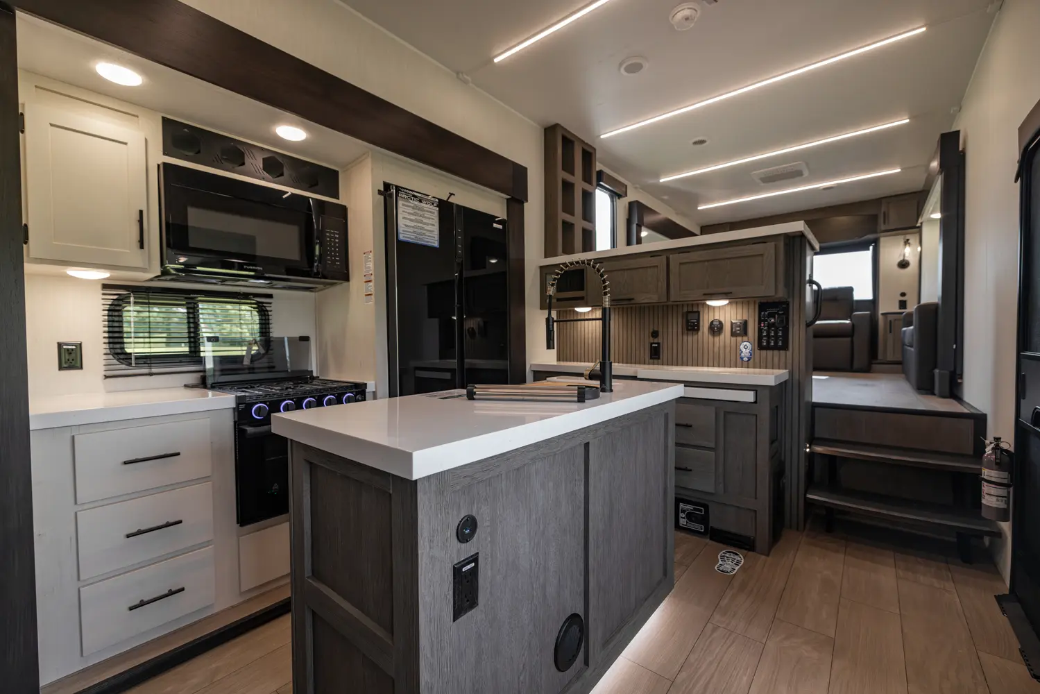 If you enjoy entertaining guests, you're going to love the Arctic Wolf 3950SUITE by Forest River! Our front living room features two tri-fold sleeper sofas and relaxing theatre seating directly across from the cozy fireplace. The island kitchen is highlighted by two 10 cu. ft. refrigerators, 30" microwave, oven, dinette seating and a half bathroom. In the primary suite you'll find a king size bed, fireplace, ample wardrobe space and an incredible bathroom with washer and dryer prep.