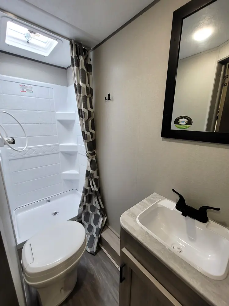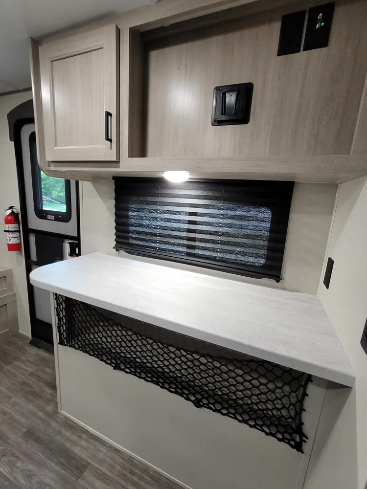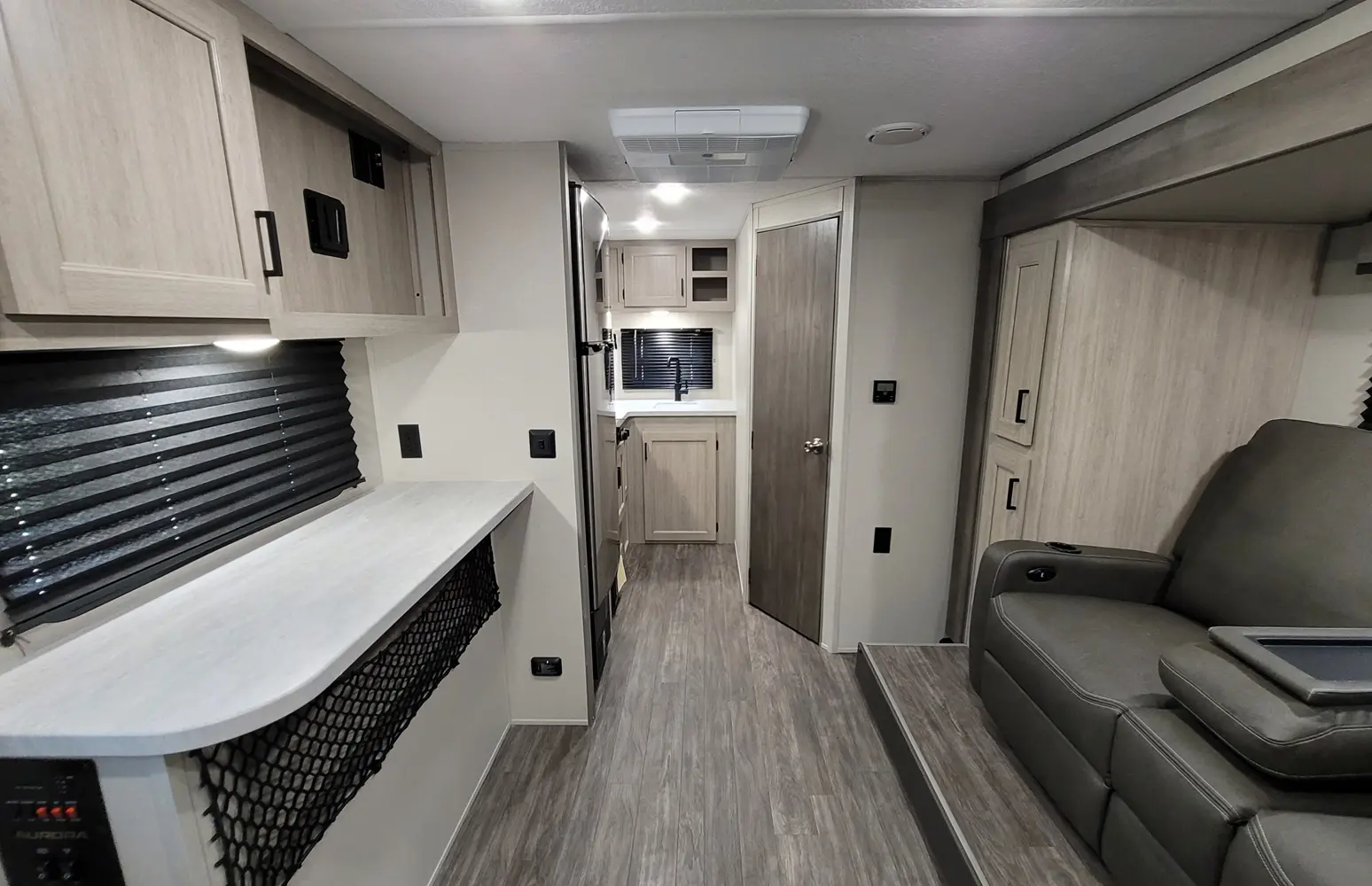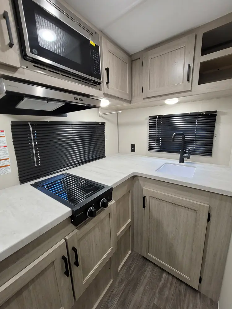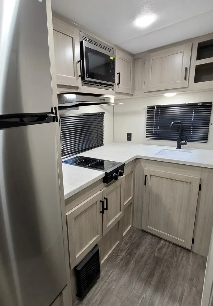 The Aurora 18RBS floorplan has one entry and one slide out. Exterior features include: metal exterior, 15' awning and outside kitchen. Interiors features include: murphy bed.