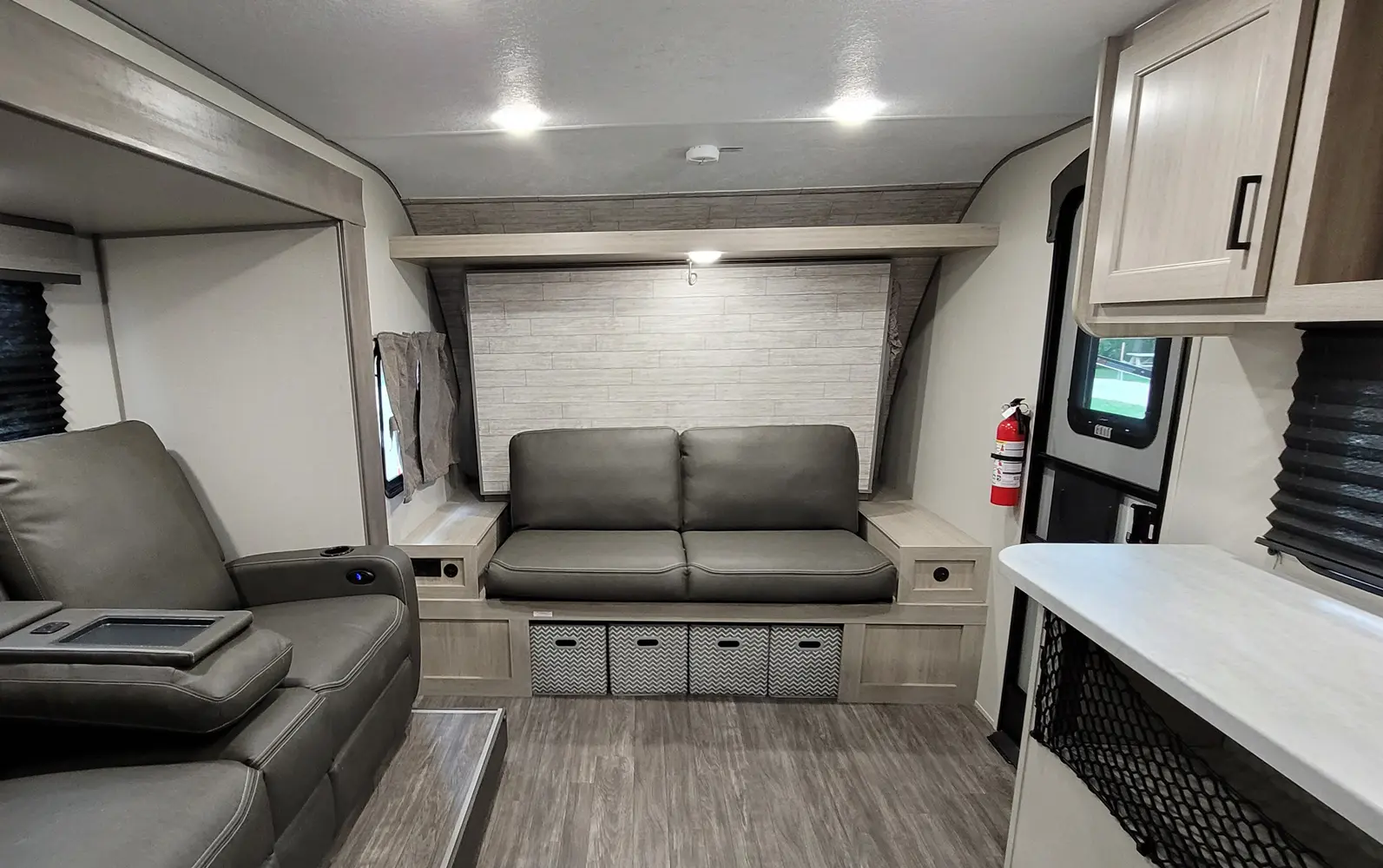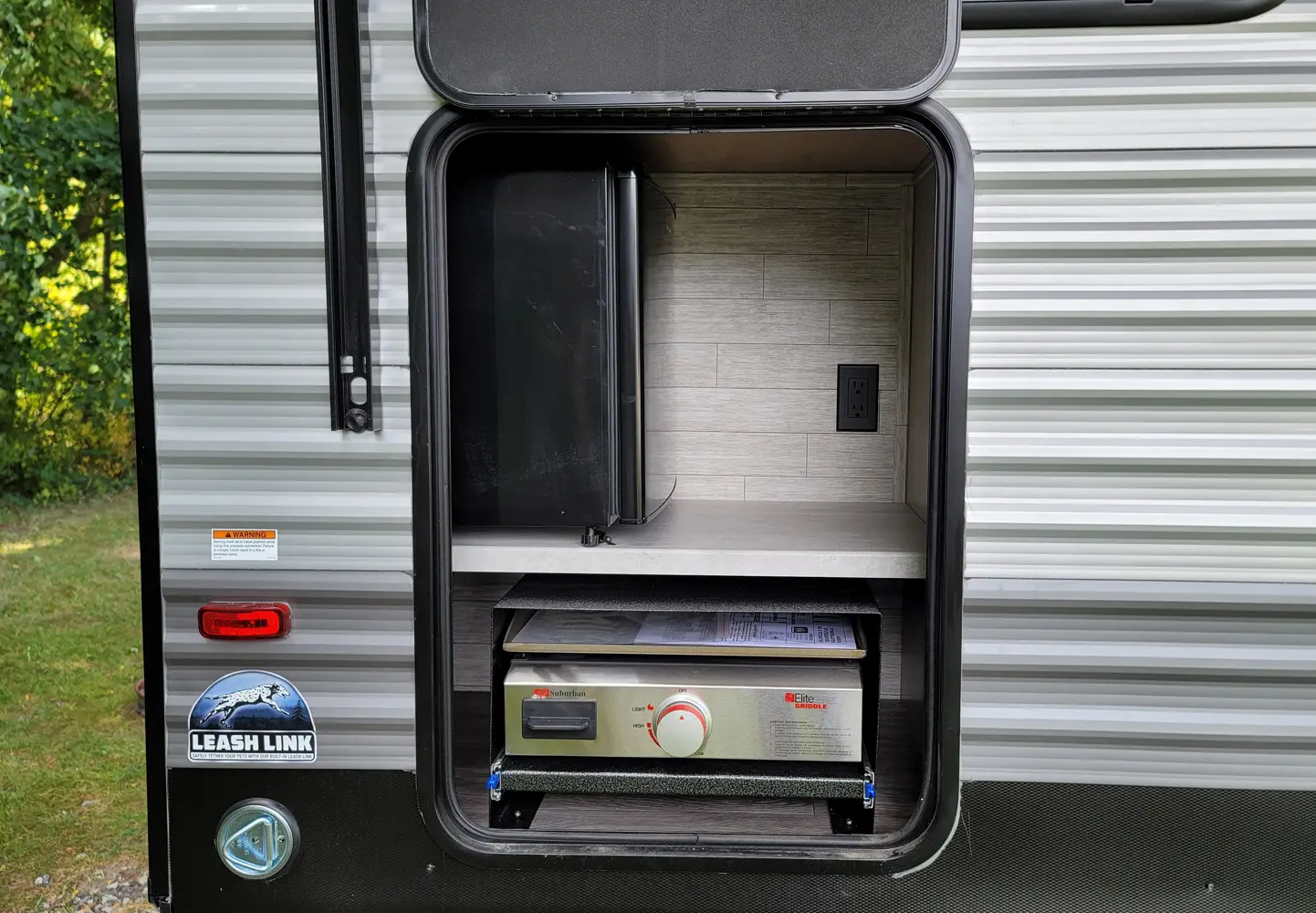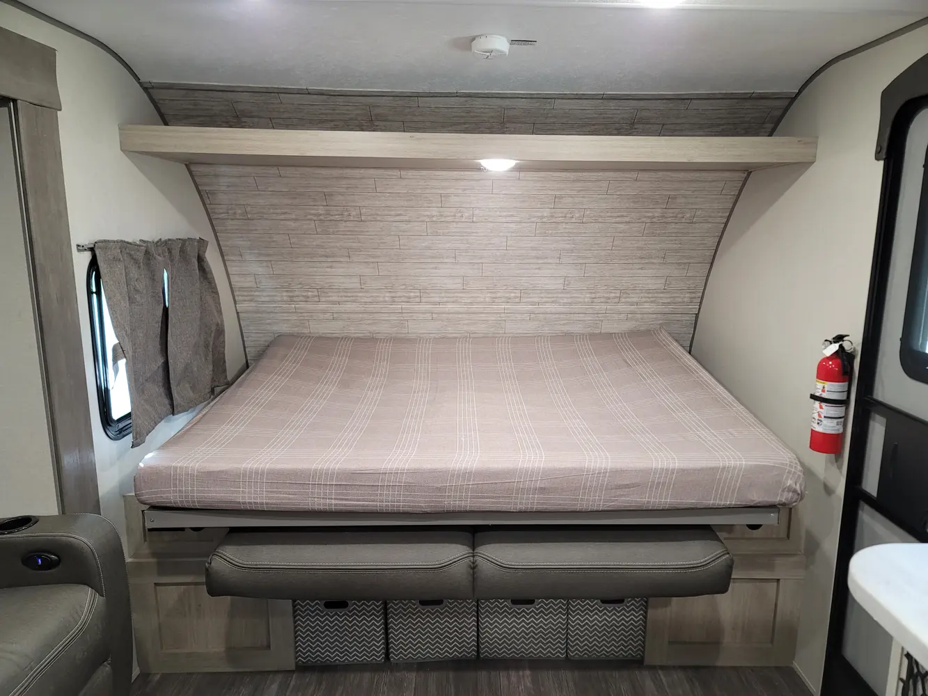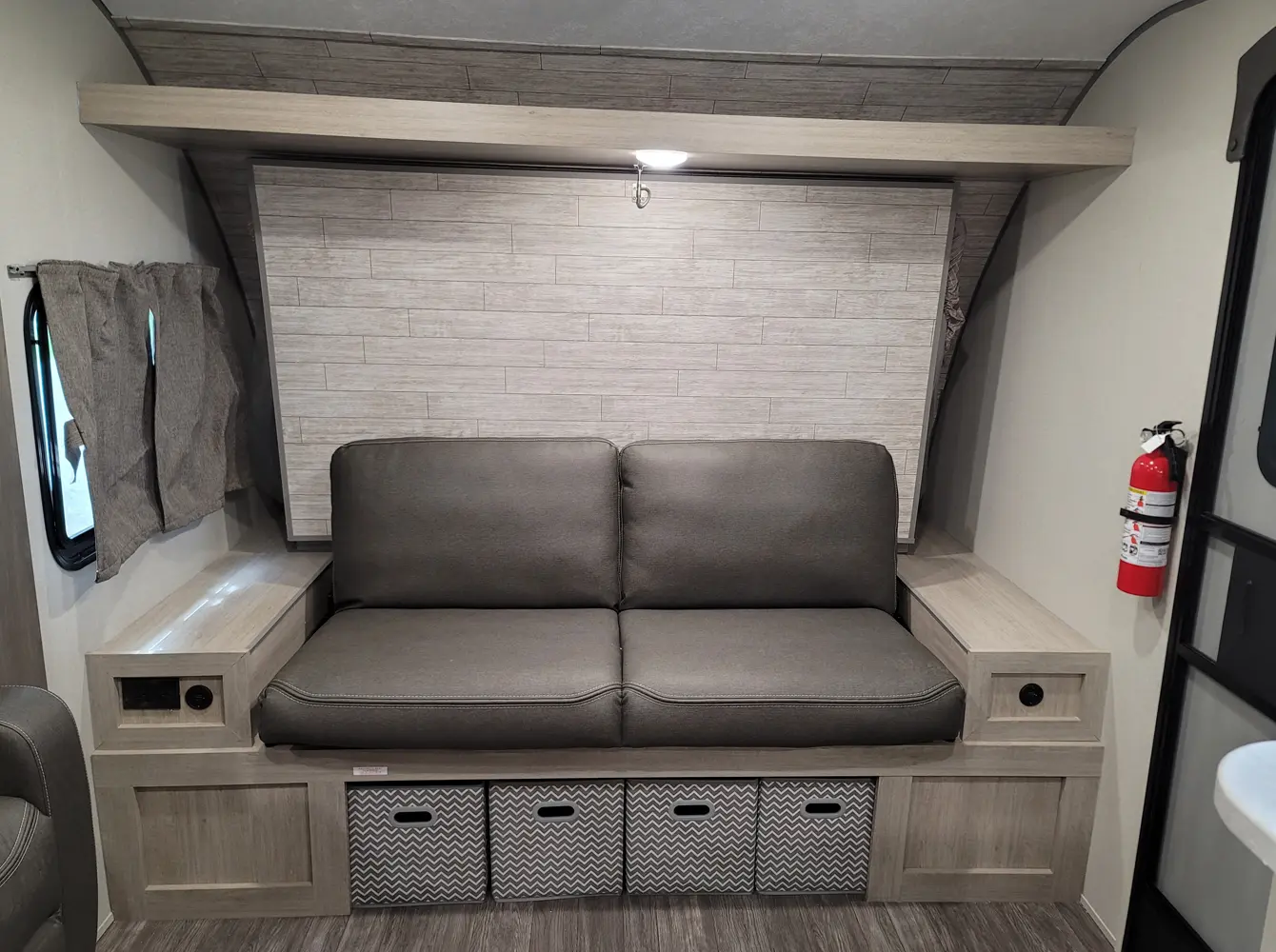 The Aurora 18RBS floorplan has one entry and one slide out. Exterior features include: metal exterior, 15' awning and outside kitchen. Interiors features include: murphy bed.