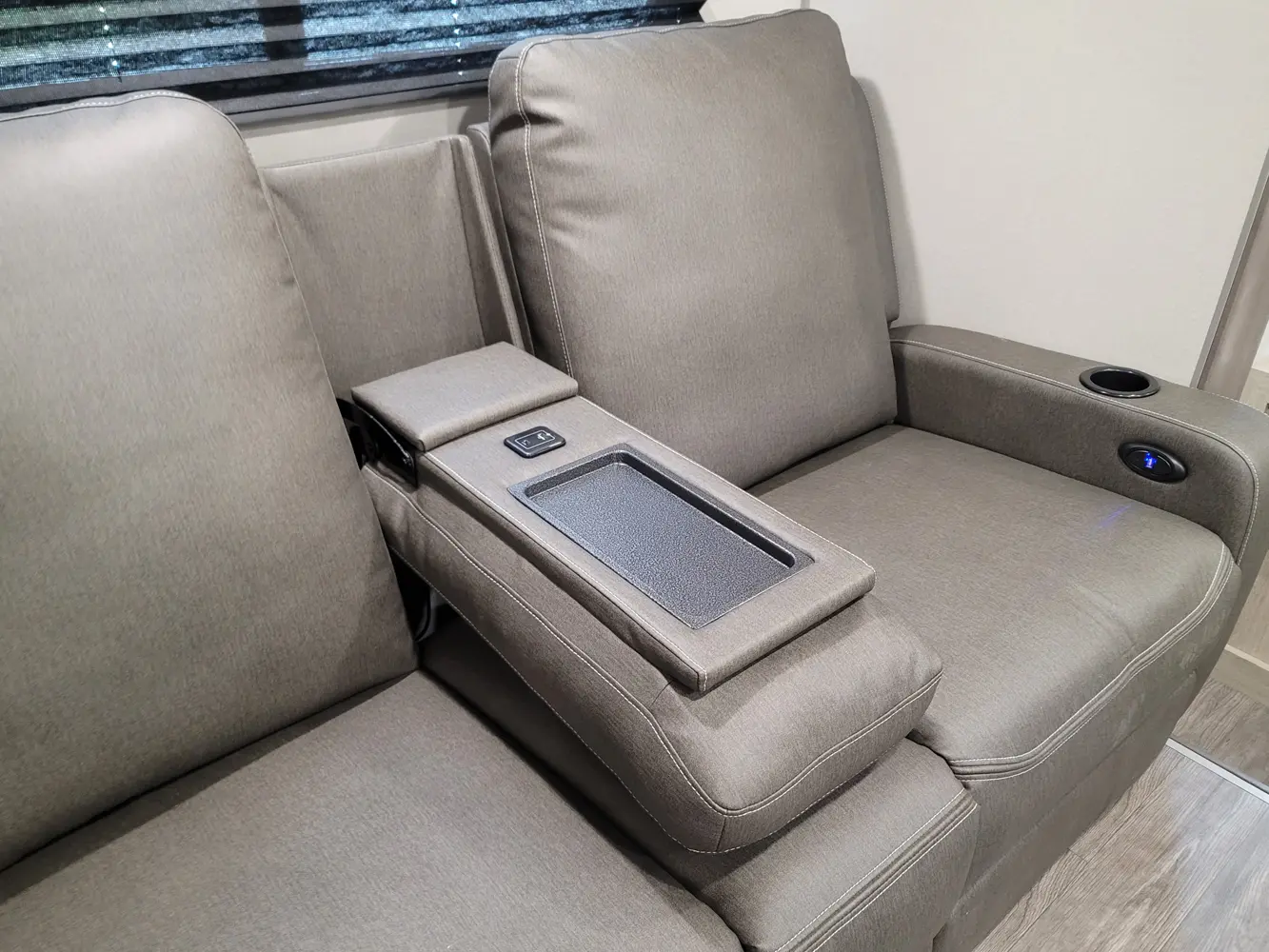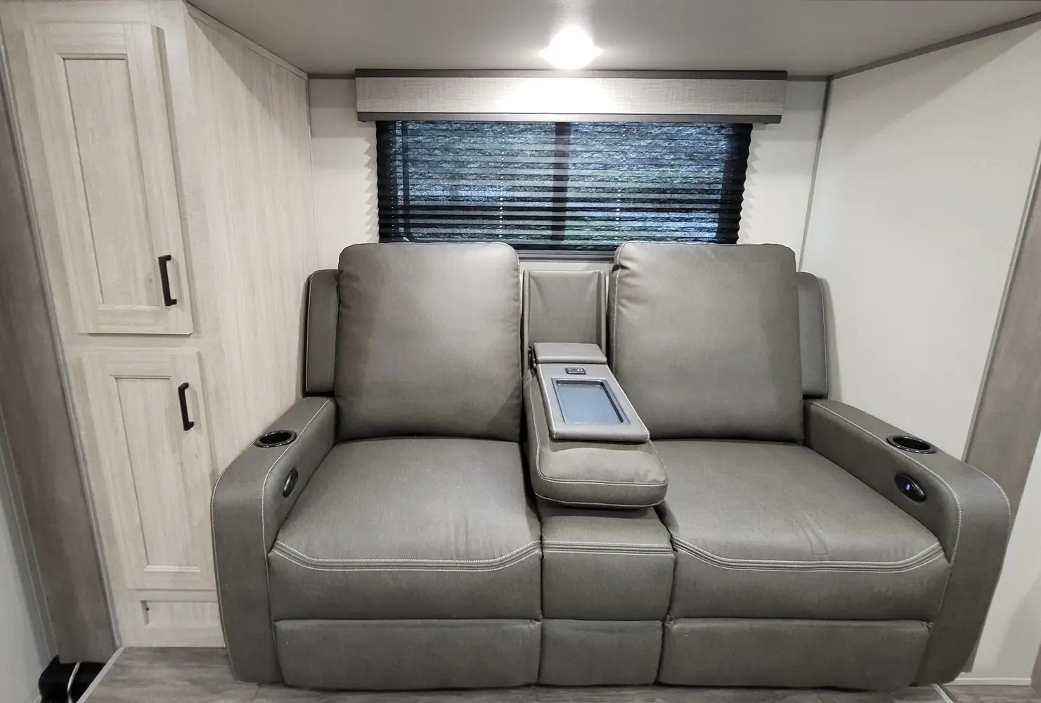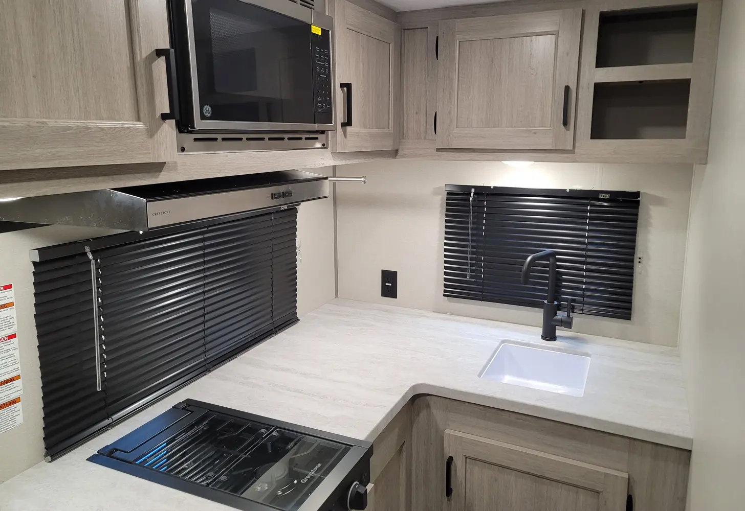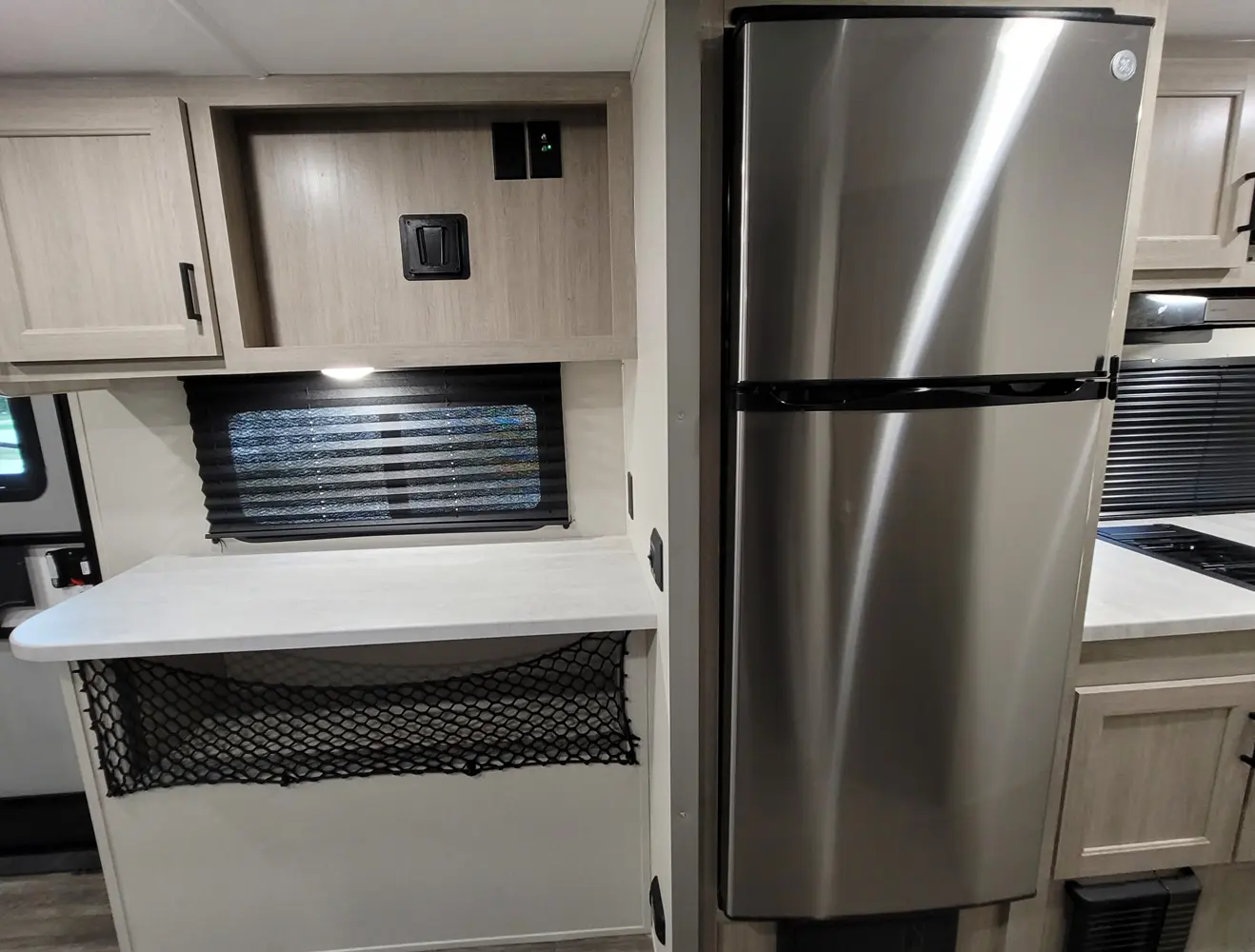 The Aurora 18RBS floorplan has one entry and one slide out. Exterior features include: metal exterior, 15' awning and outside kitchen. Interiors features include: murphy bed.