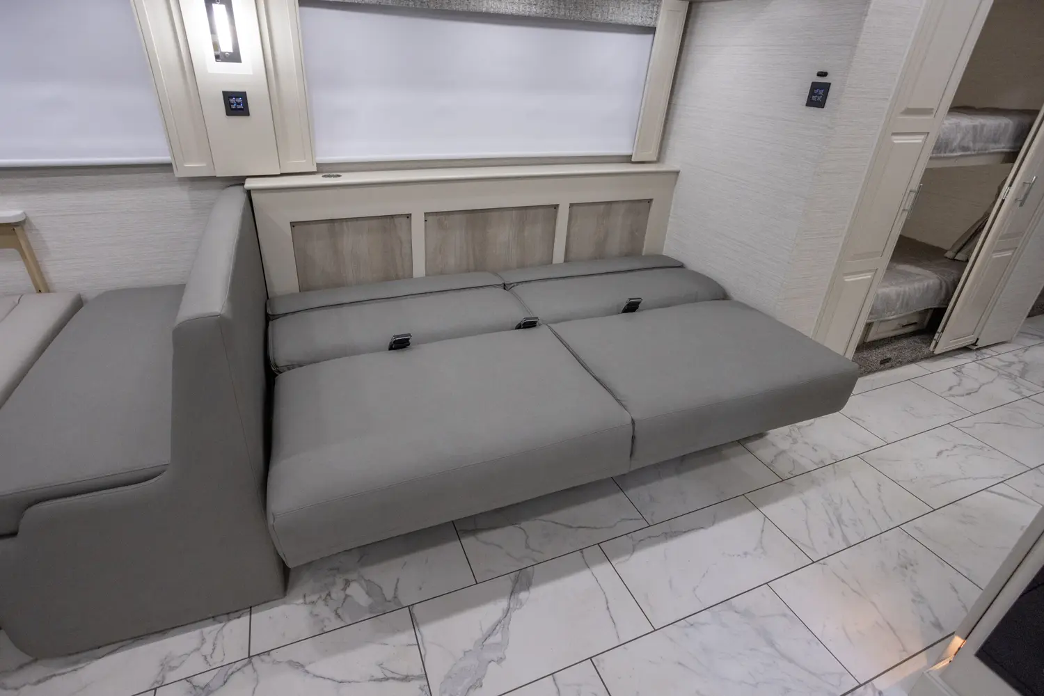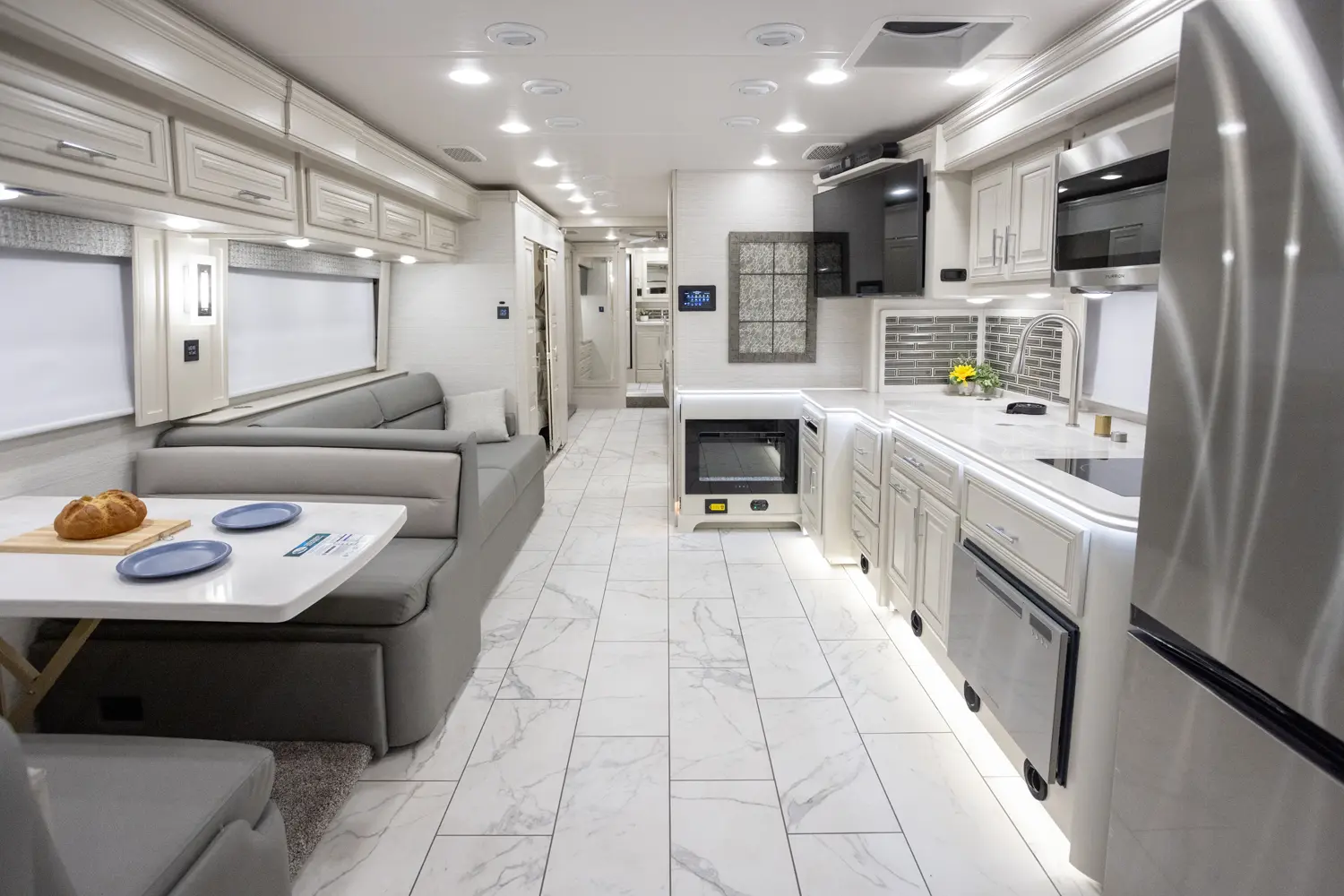 The Berkshire XL 40E is a three-slide bunkhouse model with two full bathrooms. The rear full bath includes a shower, vanity sink with medicine cabinet, and stacking washer/dryer. The bedroom has a slideout, 72" x 80" Tilt-a-View king bed, plus a dresser, wardrobe cabinet, TV, and overhead cupboard. The second full bath sits across from the bunk room/wardrobe combo. The kitchen is fully equipped, with a convection microwave, induction cooktop, and residential-style refrigerator.