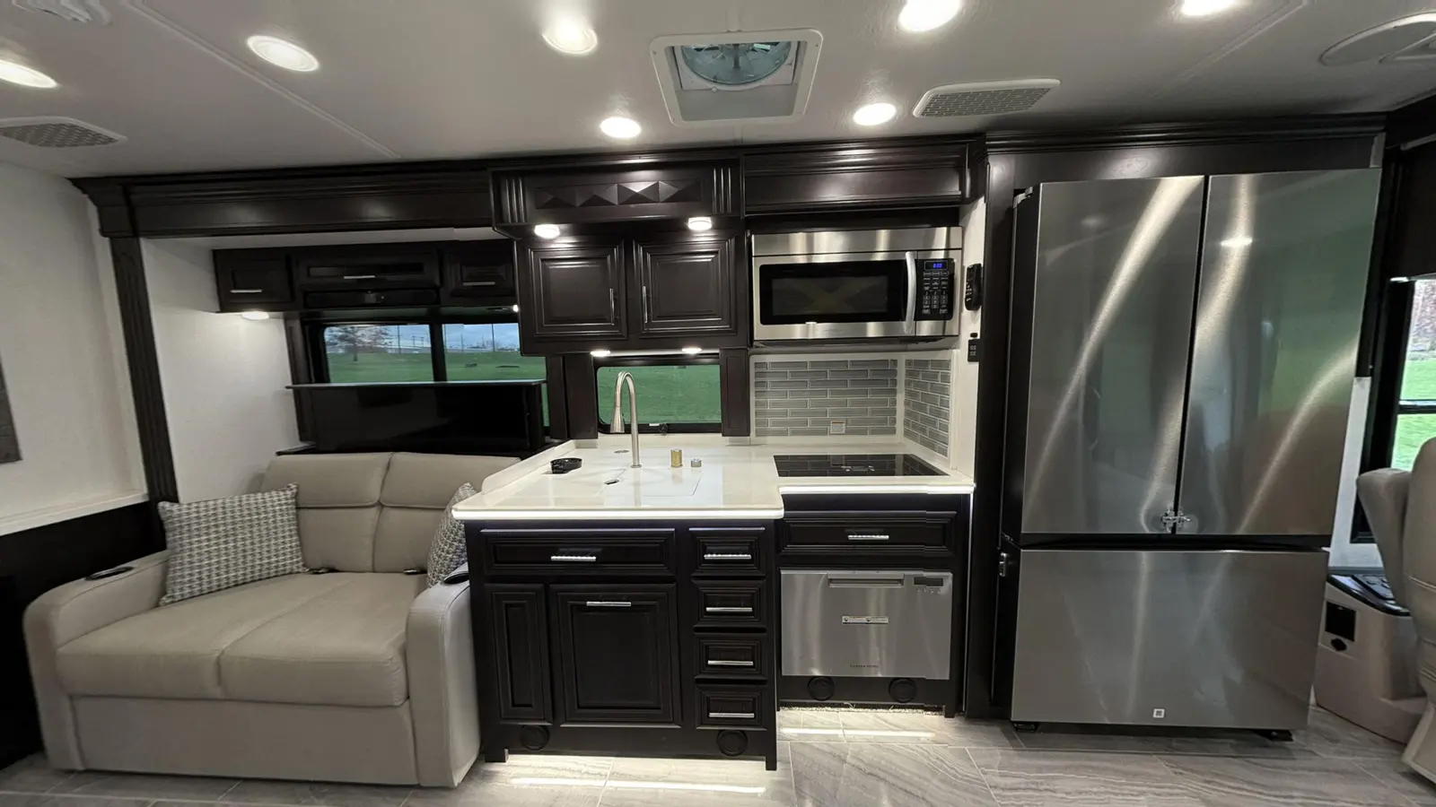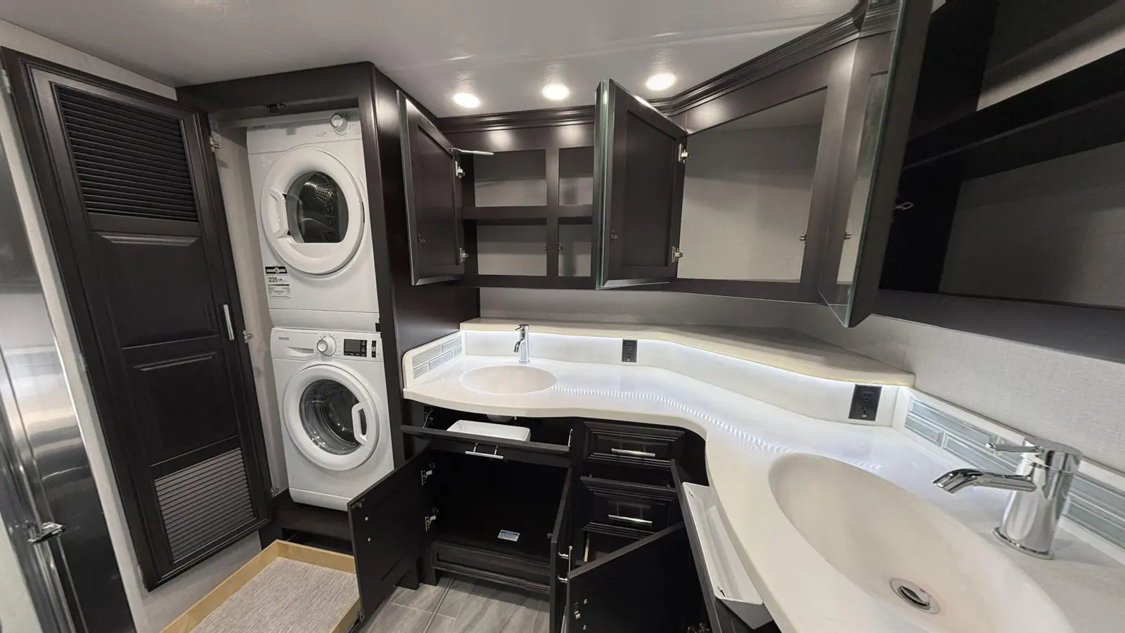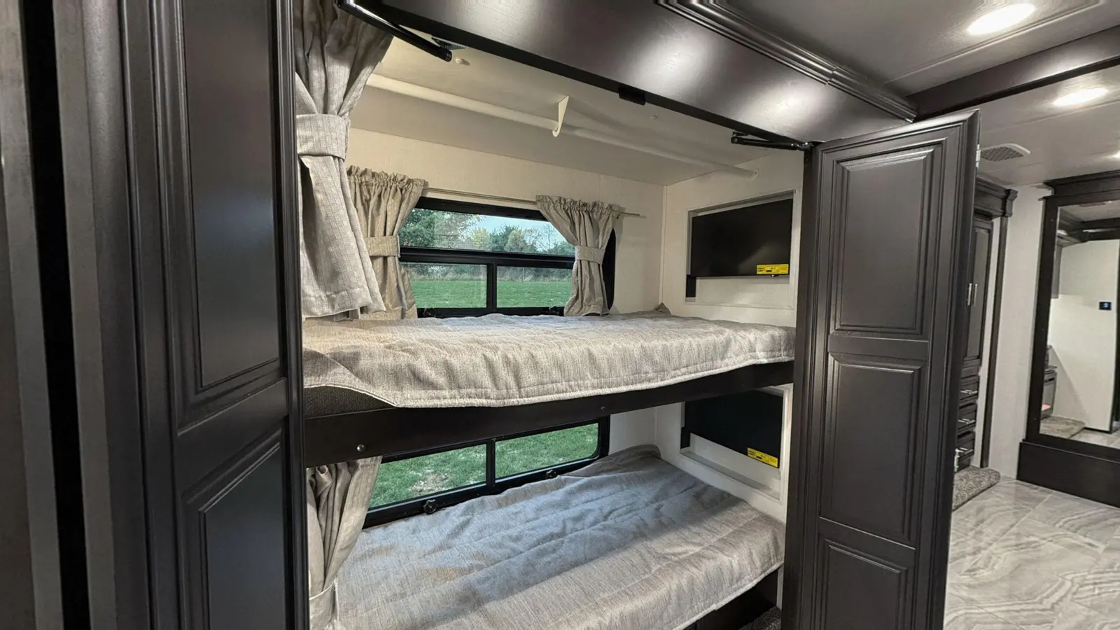 The Berkshire XLT 45CA is a three-slide bunkhouse model with two full bathrooms. The large full rear bath includes a roomy shower, vanity with dual sinks overhead cabinets, and stacking washer/dryer. The main bedroom is just off the bath, with a slideout, 72" x 80" Tilt-a-View king bed, plus a dresser, wardrobe cabinet, 43" TV, and overhead cupboards. The second full bath has a shower, vanity sink, medicine cabinet, and commode. Across across from this bathroom is the bunk room/wardrobe combo. The kitchen is fully equipped, with a convection microwave, induction cooktop, and residential-style refrigerator. Just over the cockpit, you'll find a unique drop-down bed for an added sleeping surfac
