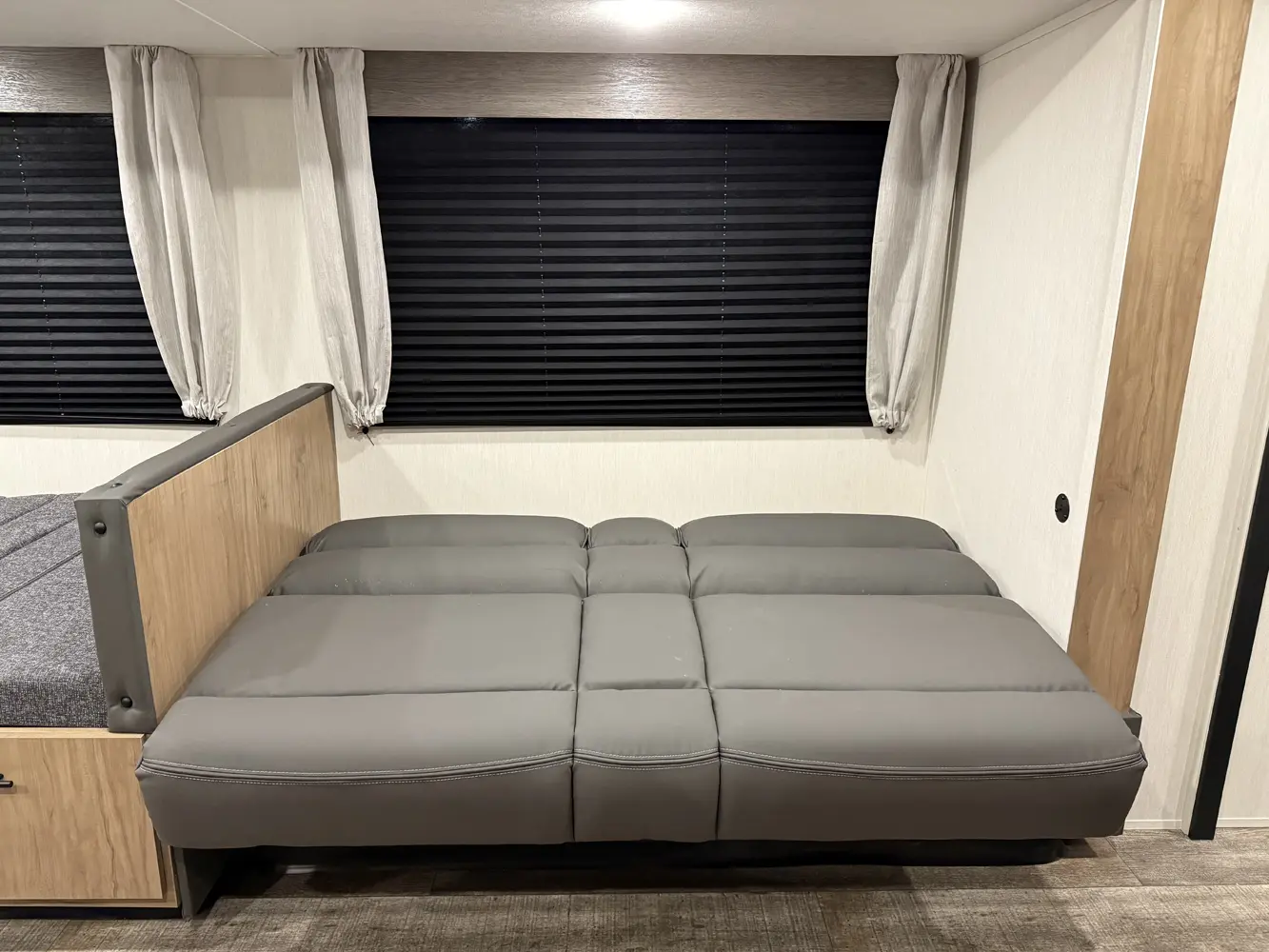 The Campsite Ultra 26CJL floorplan has two entries and one slide out. Exterior features include: fiberglass exterior, 18' awning and outside kitchen. Interiors features include: bunk beds and front bedroom.