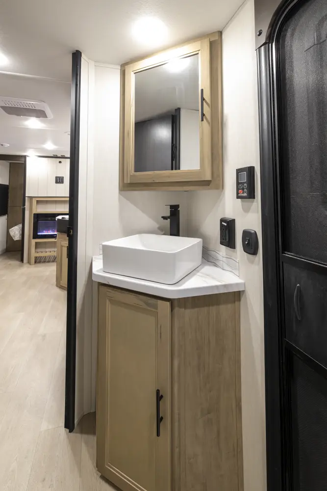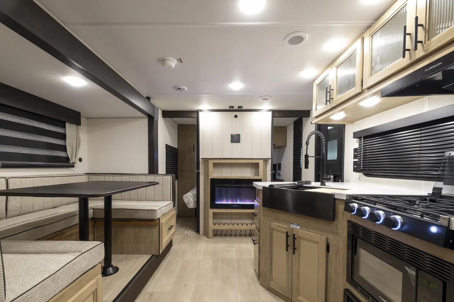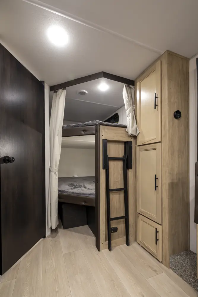 The 23DBHBL is a family bunkhouse featuring a huge double bunk with ladder for kids. The double entry doors allow easy access to the bathroom and kitchen from the exterior. The modern chef’s kitchen, oversized pantry, and extra-large U-shaped dinette with full length drawers give you more than enough storage. The private master suite provides a queen size bed with ample overhead and side cabinetry. The exterior provides under awning entertainment area with TV bracket, and outside speakers.