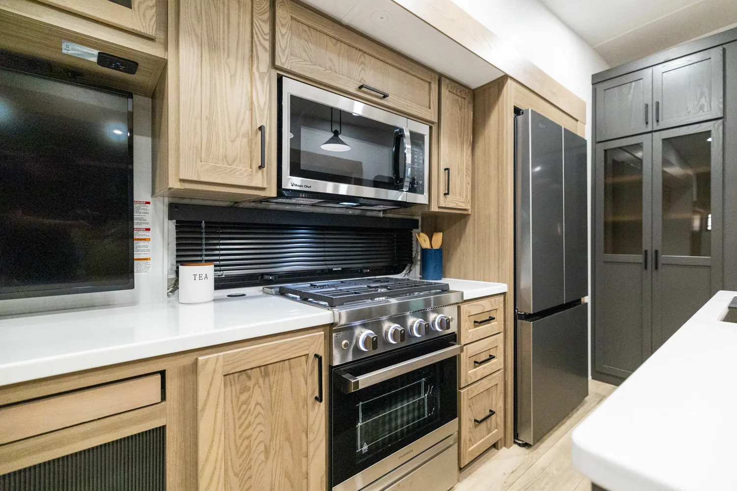 This 40' rear living fifth wheel combines comfort and versatility! The spacious living area features a 76" hide-a-bed, 67" theater seating, a fireplace, and a pull-out desk for remote work or hobbies. The kitchen offers an island, pantry, and rotating dinette seating, while the private bedroom includes a king bed, dresser with fireplace, and washer/dryer prep. With dual toilets, dual awnings and pass-thru storage, it’s built for extended stays in style.