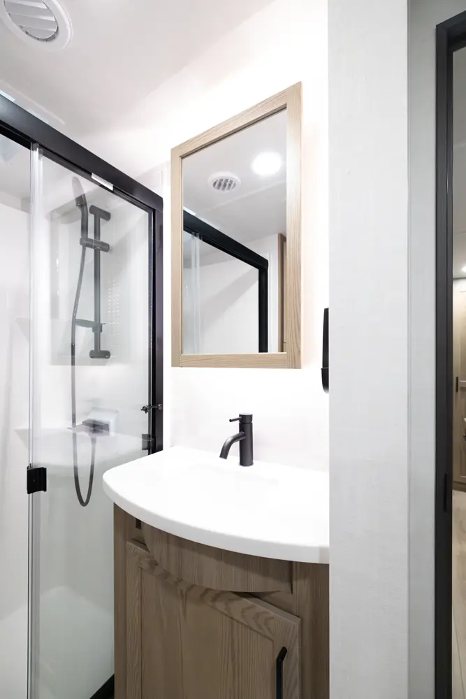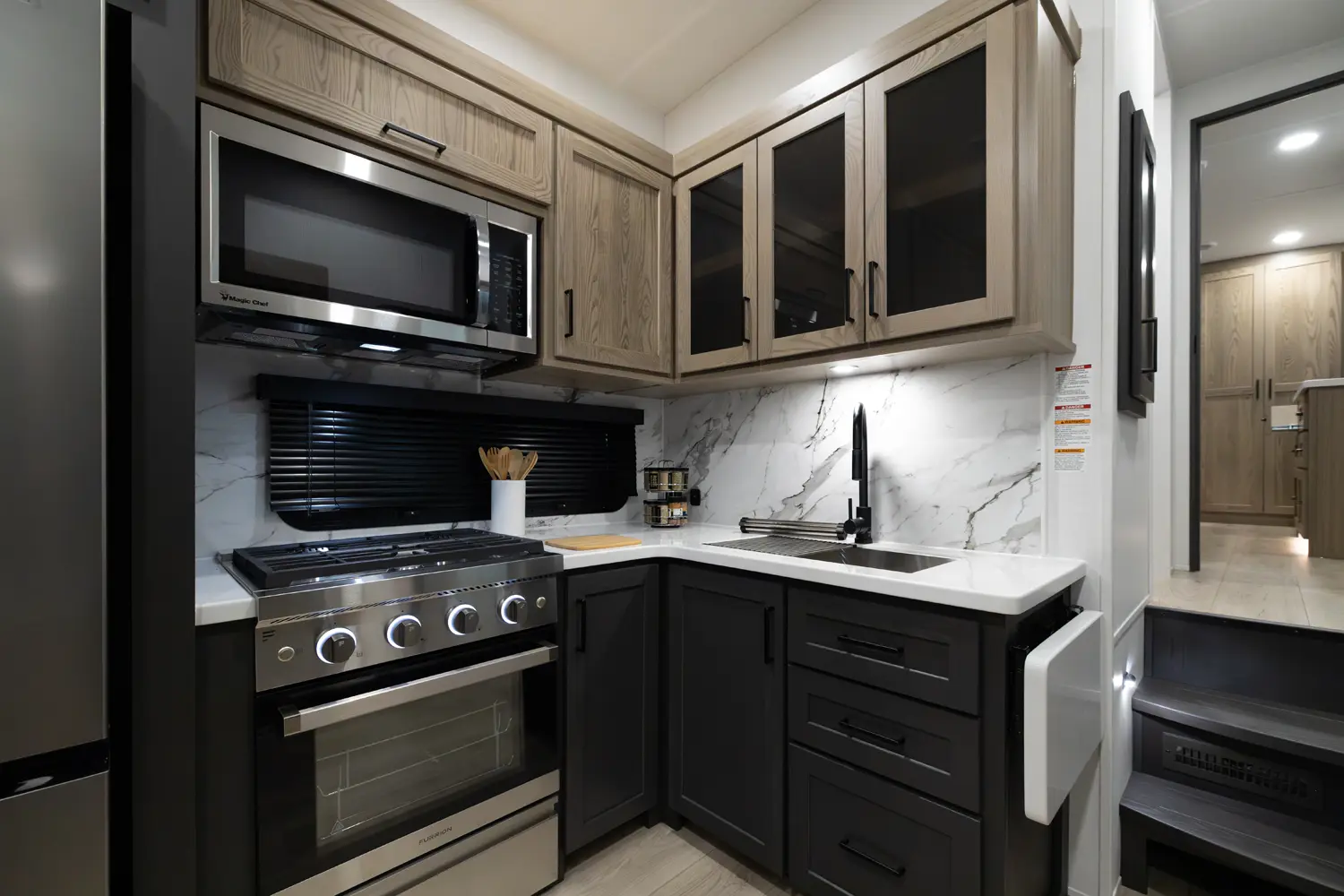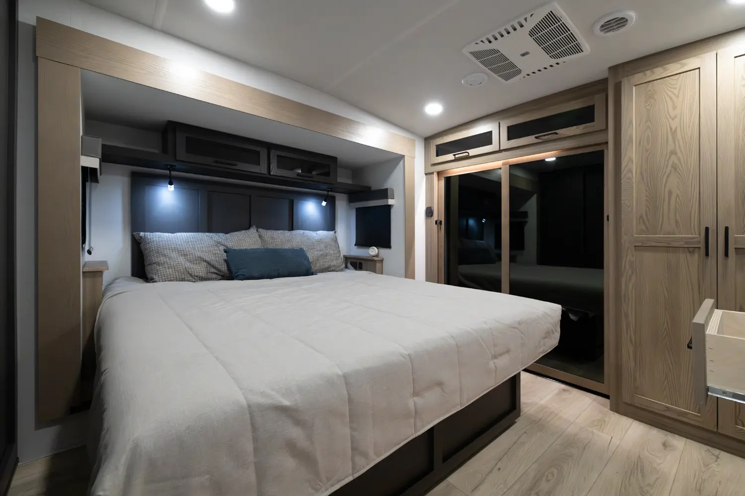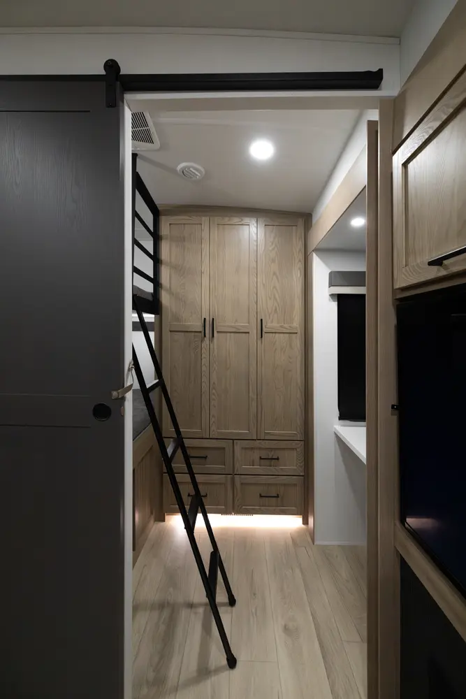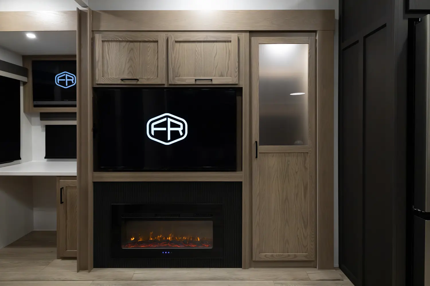 Our first 40' bunkhouse fifth wheel combines family comfort and luxury! The rear bunkroom offers double 48" x 72" bunks, wardrobe, desk, and fridge. The spacious living area features a 60" theater seat, 44" dinette, and fireplace, while the front bedroom includes a king bed and washer/dryer prep. With dual awnings, pass-thru storage, and off-grid Power Package options, it’s perfect for big adventures.