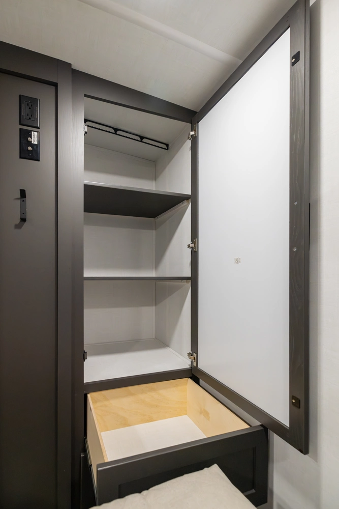This versatile fifth wheel offers a spacious living area with a 60" hide-a-bed sofa, fireplace, and optional theater seating. The large king U-dinette converts for extra sleeping space and provides plenty of room for family meals. The front bedroom features a queen bed with an optional king upgrade and ample wardrobe storage. With a full rear kitchen, pass-thru storage, and a 21' awning, it’s designed for comfort and convenience on every trip.