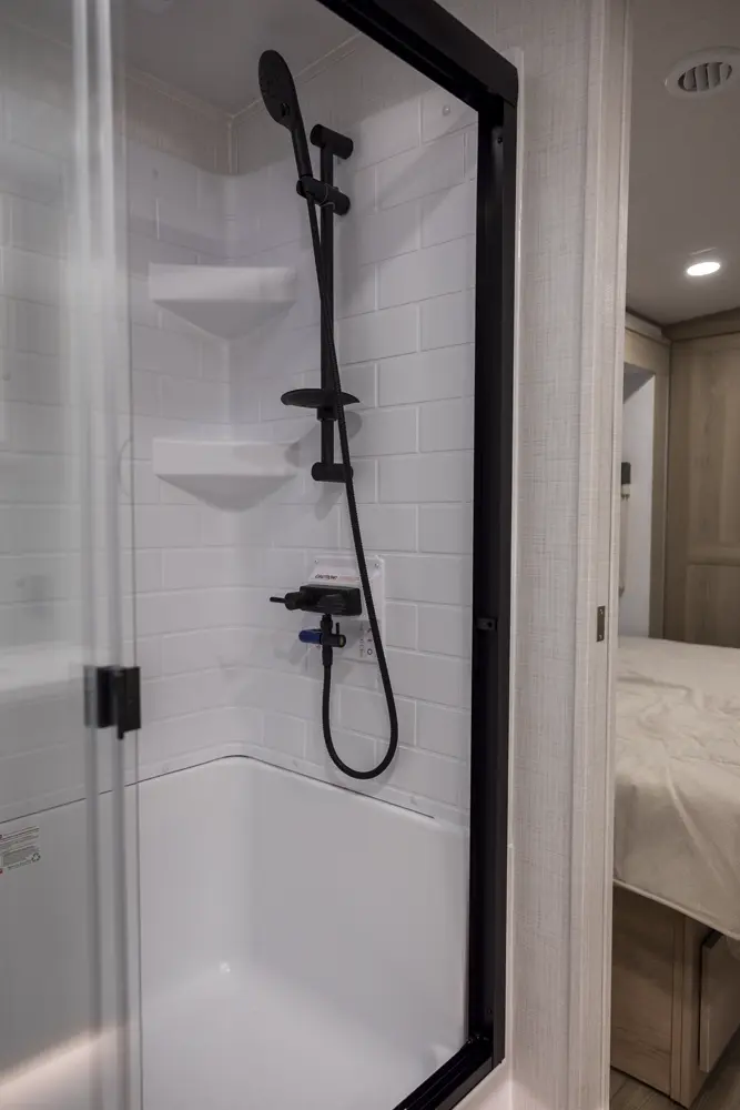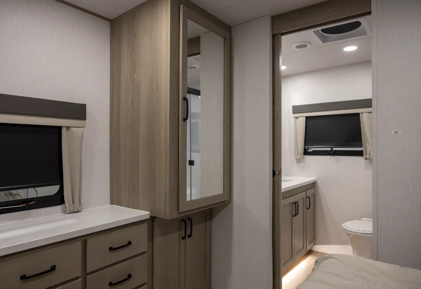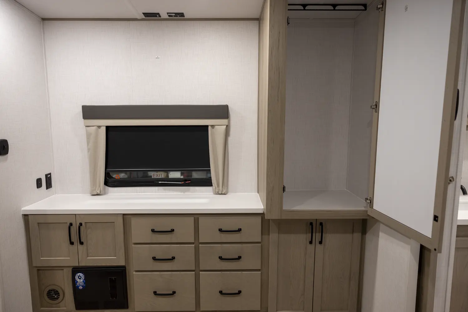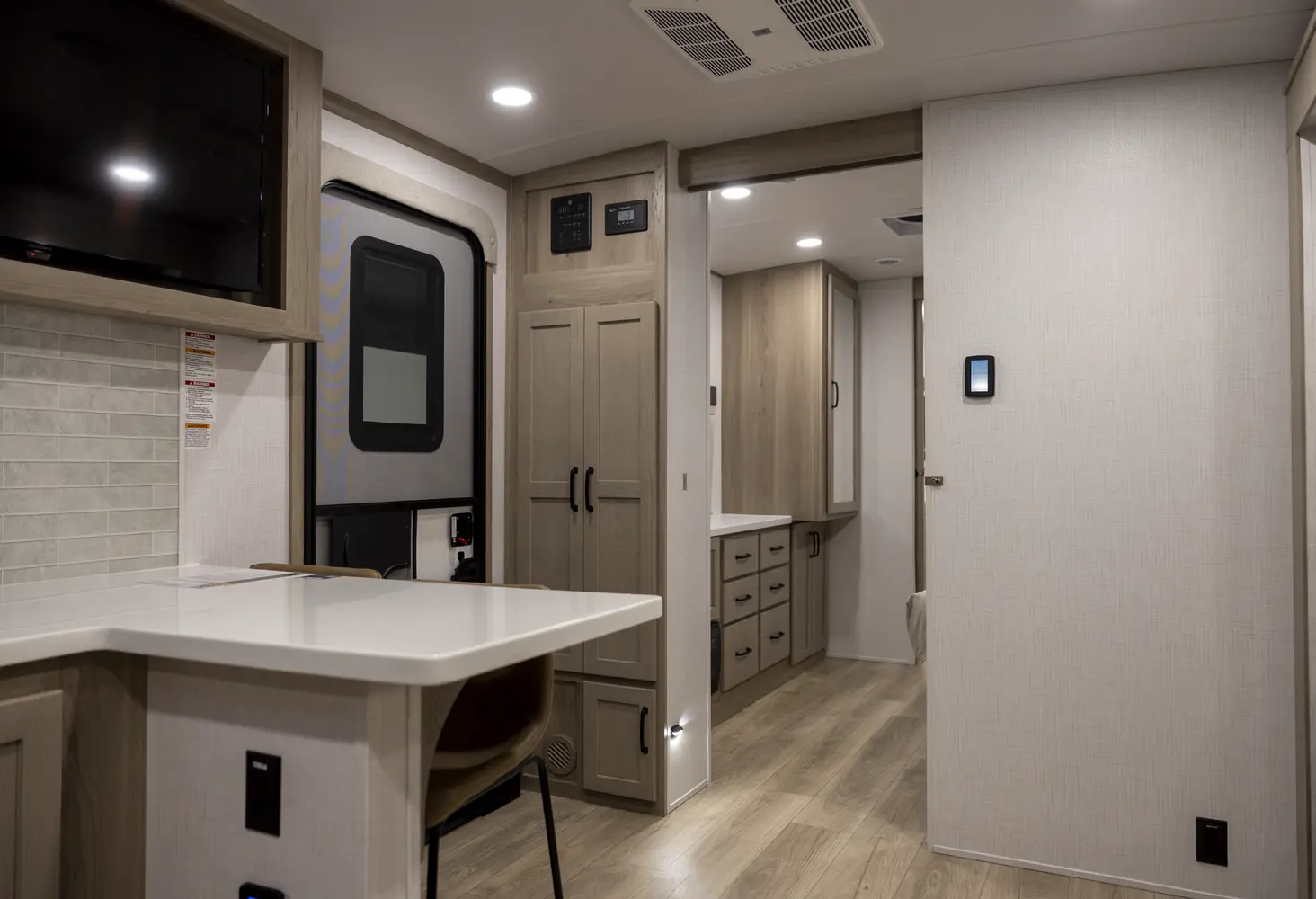 The two person bar top seating and a large window in the front give this coach an open feel with the ability to see your campsite. The theater seating is directly across the entertainment center for easy viewing and comfort. The bedroom in this unit is the game changer with a king bed in a slide out, a large wardrobe and dresser in the middle of this bedroom is perfect. A bathroom with a double sink vanity and 48” x 30” shower with a seat make this bathroom truly a master.