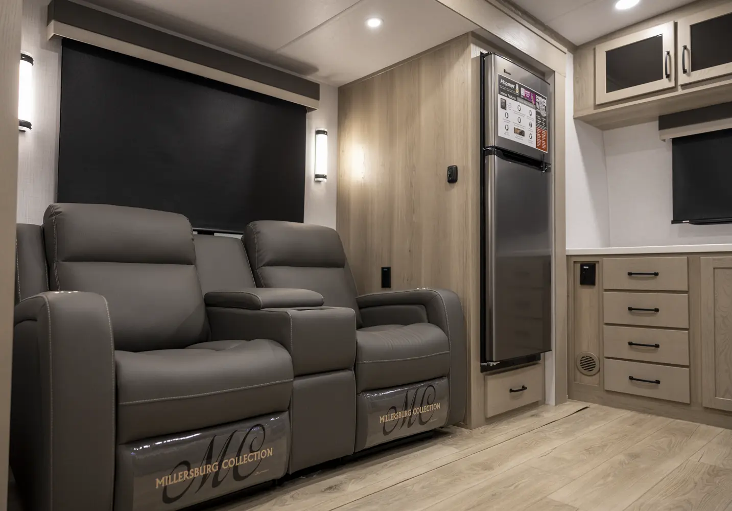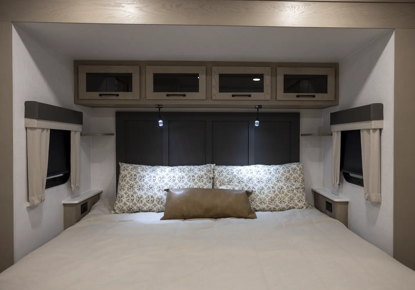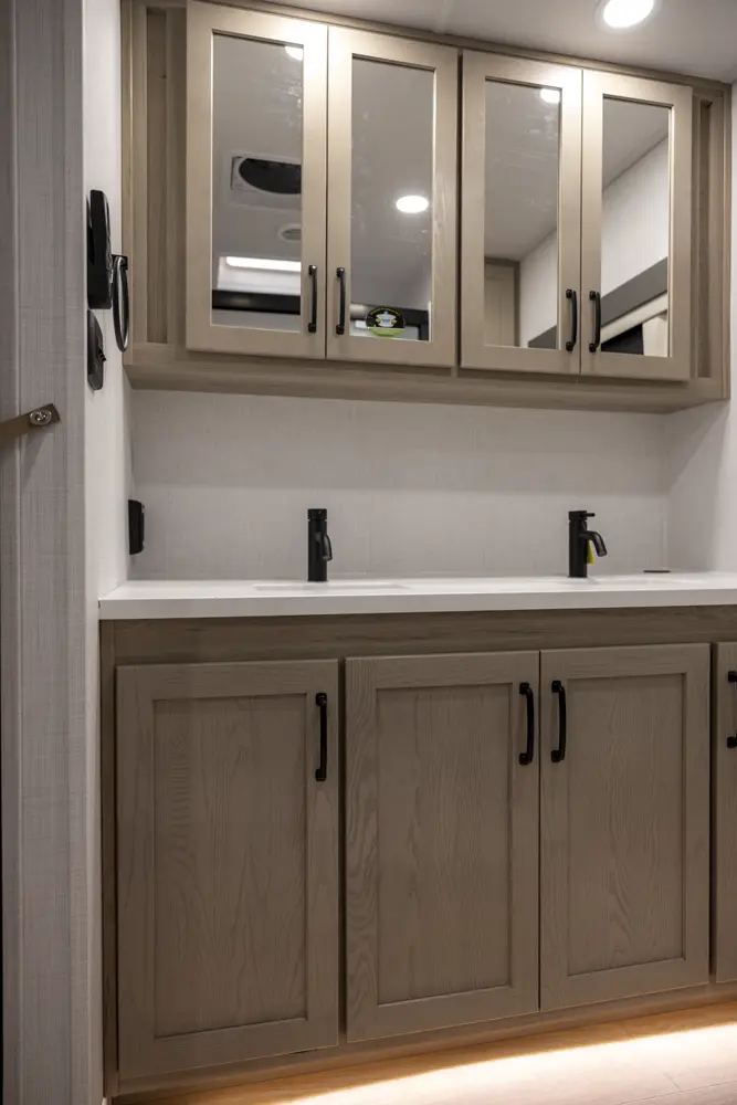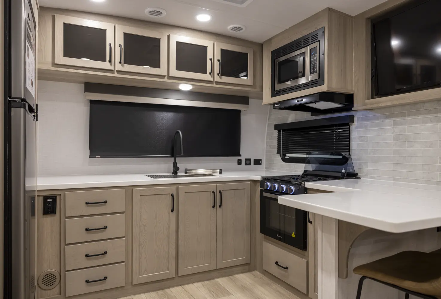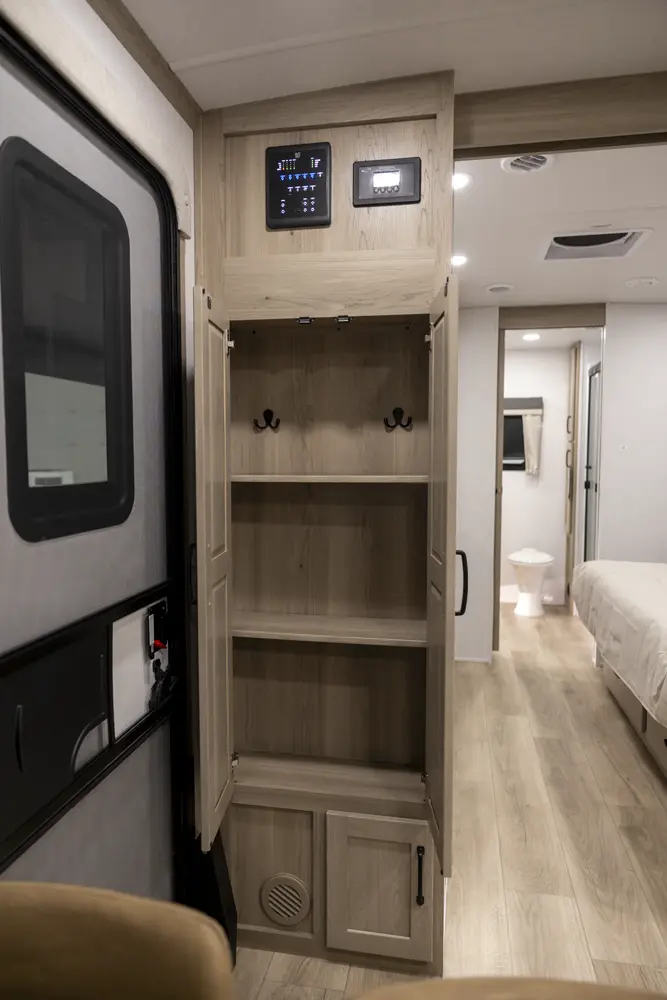 The two person bar top seating and a large window in the front give this coach an open feel with the ability to see your campsite. The theater seating is directly across the entertainment center for easy viewing and comfort. The bedroom in this unit is the game changer with a king bed in a slide out, a large wardrobe and dresser in the middle of this bedroom is perfect. A bathroom with a double sink vanity and 48” x 30” shower with a seat make this bathroom truly a master.