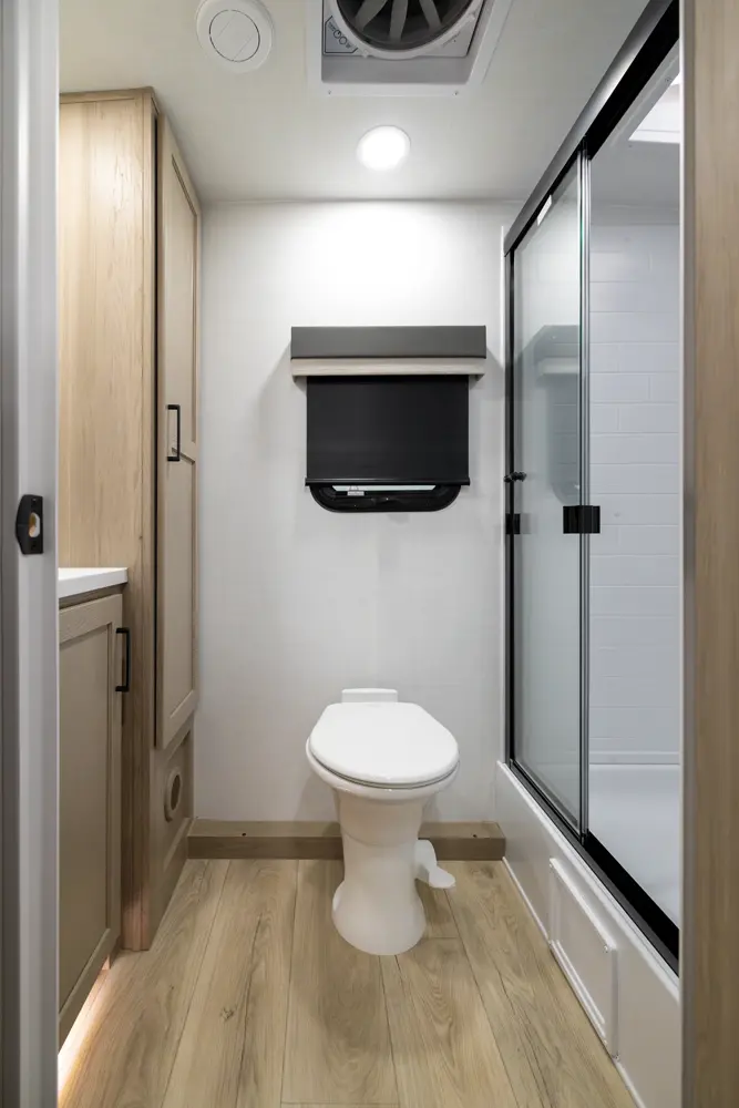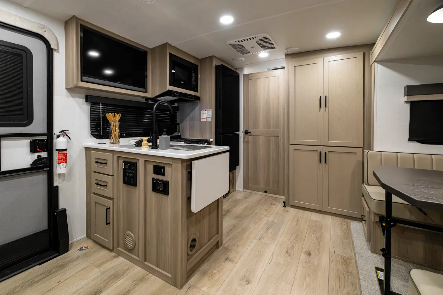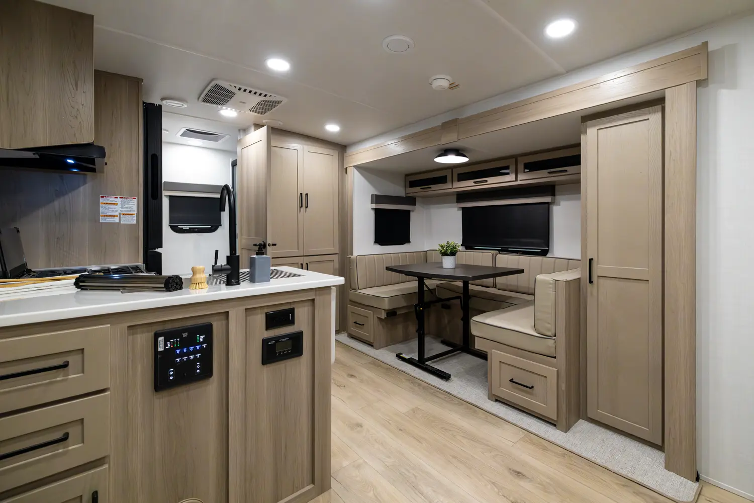 The 22SQS delivers a smart, comfortable layout with a front Murphy bed that maximizes living space by day and provides a restful sleep at night. The U-shaped dinette offers plenty of room for meals, games, or extra sleeping space when needed. A large rear bathroom with a rectangular shower adds everyday comfort and convenience making this floor plan a great choice for couples or small families who want big features in a compact trailer.